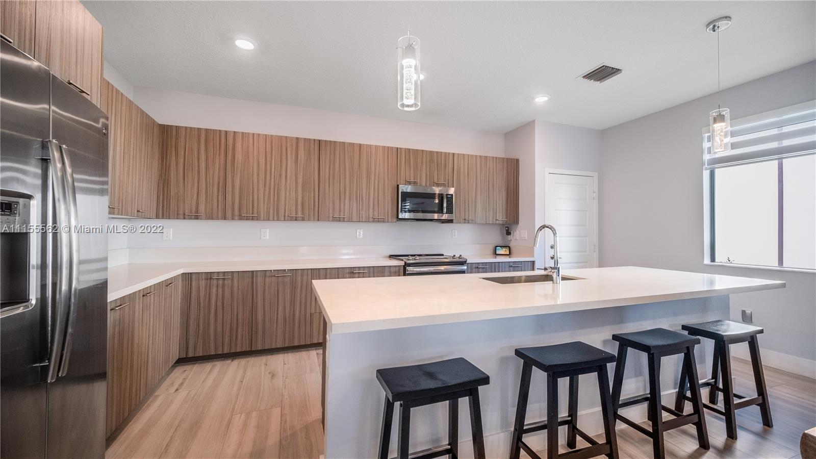 This three-story townhouse features 3 bedrooms, 2 full bathrooms, and 2 half bathrooms with a spacious 2 car garage. The property is located in a double-wide corner, with plenty of natural light. The first floor features a spacious open floorplan shared between the family room, kitchen and dining room. All three bedrooms are located on the second level. The primary bedroom features its own private balcony, two spacious walk-in closets, and ensuite bathroom with double vanities. The third floor is home to the media room and two beautiful patios, a covered patio with an outdoor kitchen, and an uncovered terrace, perfect for entertaining. Located in the heart of Downtown Doral, enjoy resort-style amenities, access to world-class education just steps away from restaurants, shopping and parks