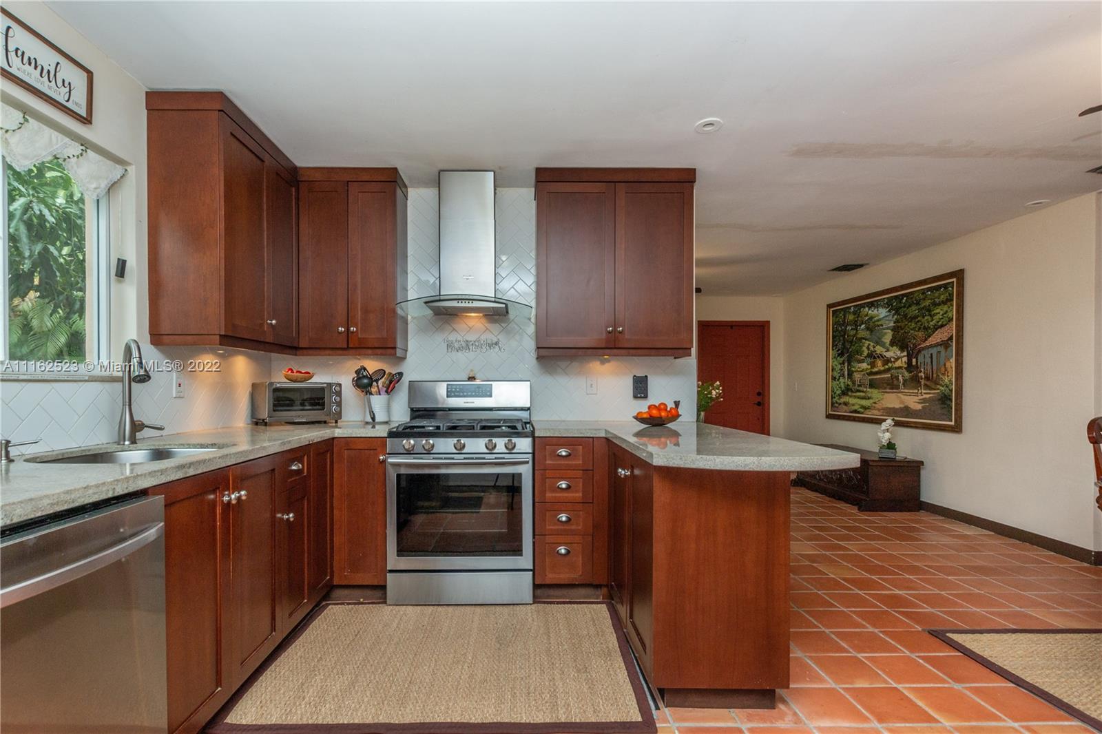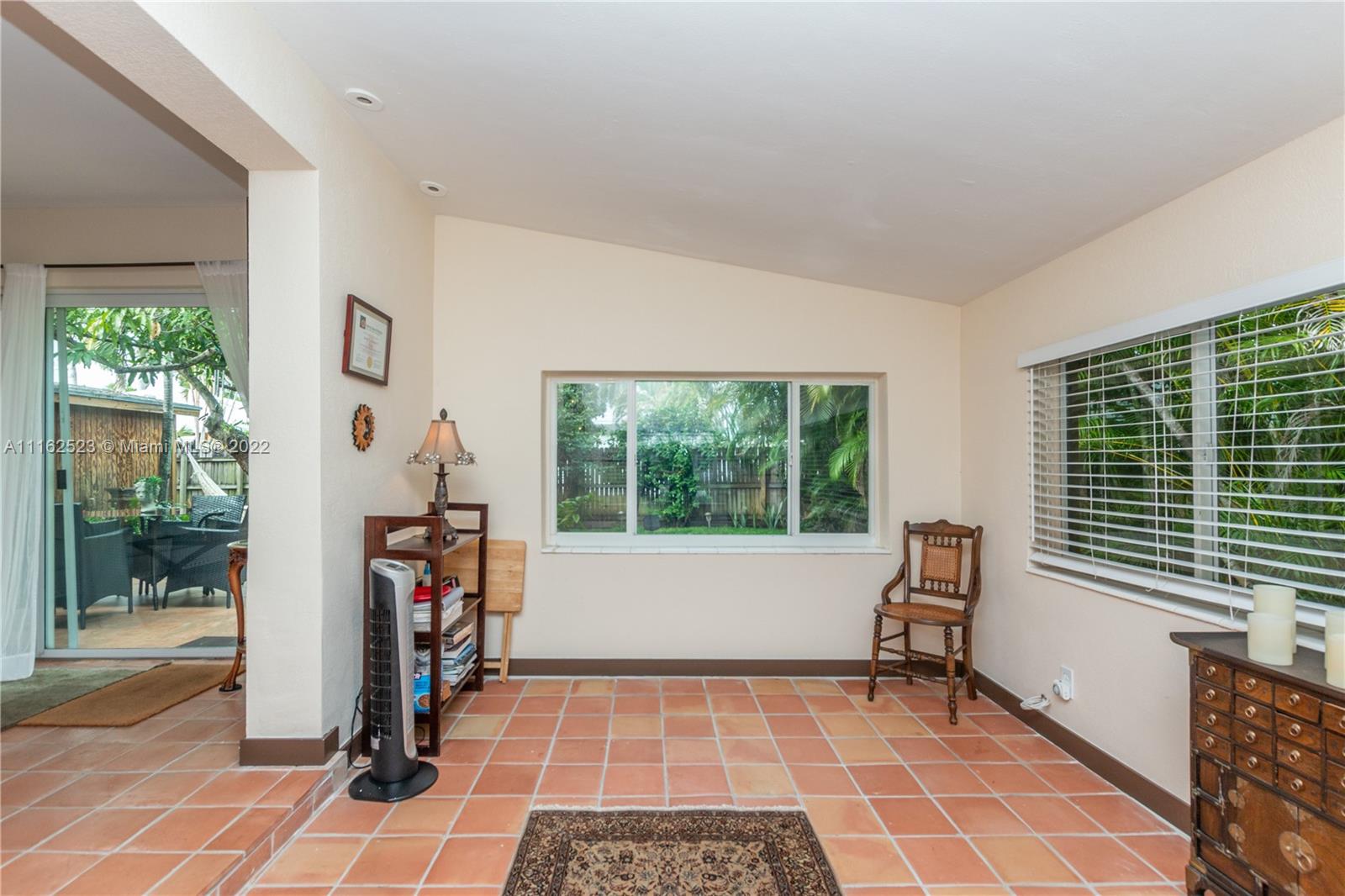 Charming 3/2 home on a quiet street of old-time residents in East Hallandale. Shows pride of ownership. Updated to modern Spanish manorial style, it features Mexican rustic terracotta floor tiles accounting for warmth in balanced contrast with airy white walls; kitchen solid wood cabinets, granite countertops and newer stainless-steel appliances; laundry room; cedar wood covering in closets; certified hurricane exterior doors. High impact glass sliding door opens onto a serene and spacious grass backyard with a wooden shed/workshop, summer shower, fountain, culinary herbs and a mature mango tree with various orchid plants. Carport, driveway and parking space for up to 6 cars. Short distance to shops, fine dining, Gulfstream racetrack, Ft Lauderdale Int’l airport and 1.3 Miles to the beach