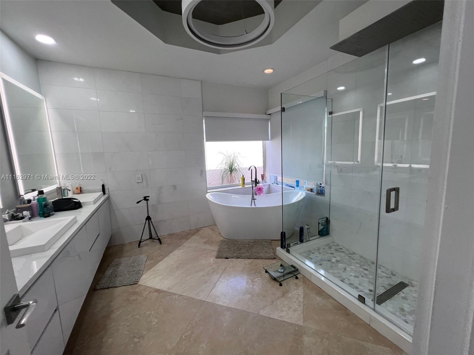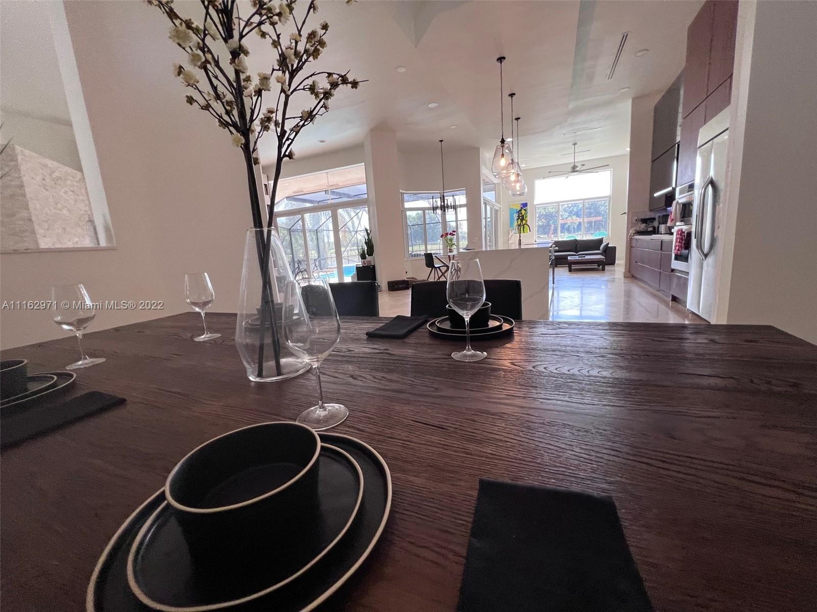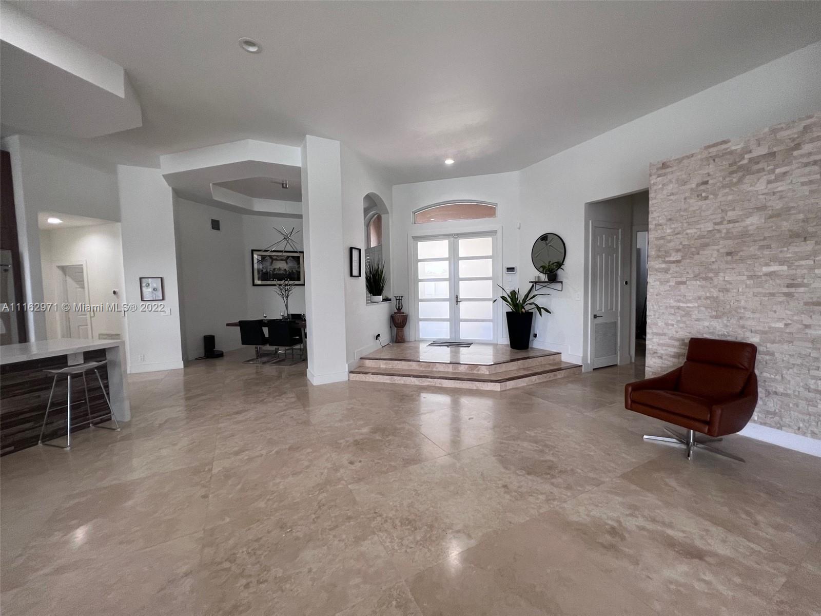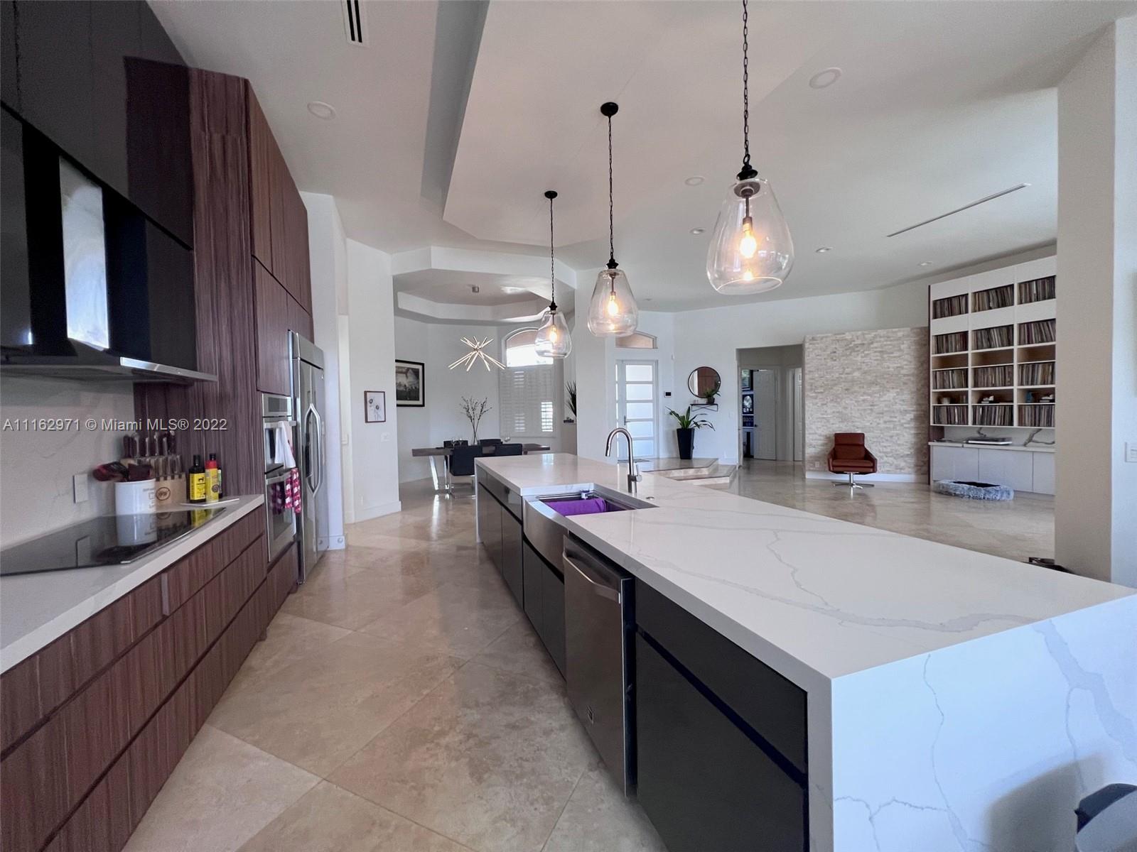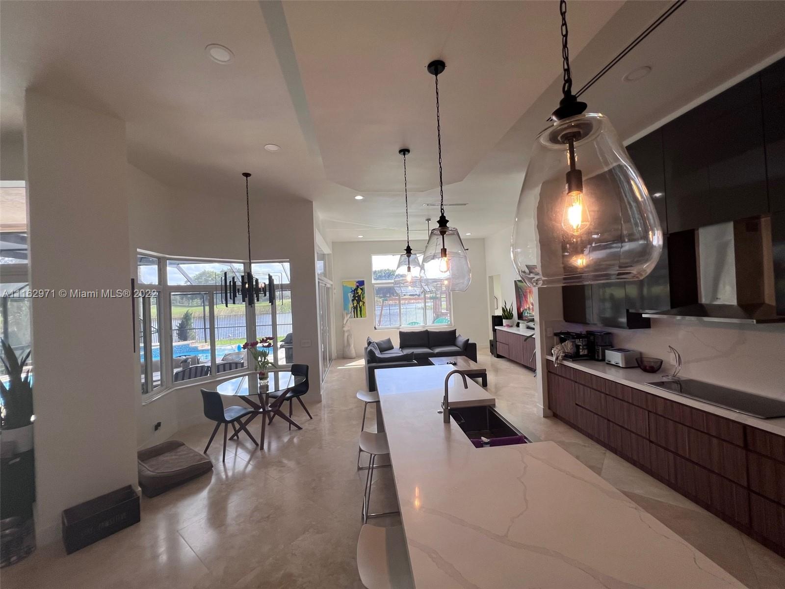 Exceptionally modern 5-3 One-story home with a 3 car garage, screened pool with fabulous lake and golf course view in exclusive gated Weston Hills CC. 12-15 feet volume ceilings, custom wood kitchen cabinets, stainless steel appliances, Calcutta countertops, and marble floors throughout. The 5th room is a den, which can be used as a small bedroom. Over-sized screened pool deck & heated diamond Brite pool, spa, and waterfall overlooking the lake and golf course.