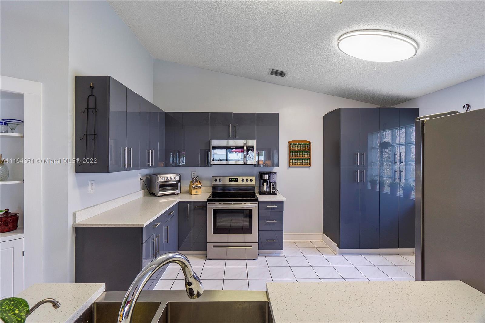 Welcome home to Parkside at Spring Valley! Desirable gated community is not to be missed! Light filled 3 bd/2ba home, perfect for your family, features vaulted ceilings and open kitchen, impact windows, brand new AC, living/dining areas that lead out to a screened patio area, perfect for entertaining! Brand new modern kitchen with stainless steel appliances and plenty of Quartz stone countertop space and cabinetry as well as Culligan Water filter. You will love the large master bedroom with spa master bath, including double sinks, garden tub, and separate shower. This community is centrally located with excellent schools and all of the best that Pembroke Pines has to offer with restaurants, shopping and entertainment nearby. Guest bedroom will have new flooring installed before closing.