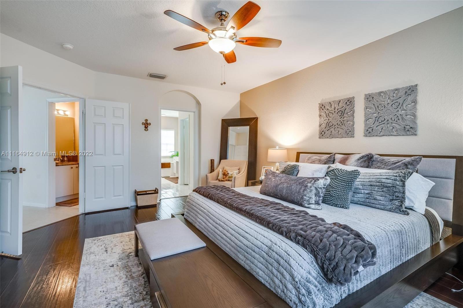 GORGEOUS PROPERTY! Has one of the largest lots in the community. 3 bedrooms, 2.5 bathrooms, 2 car garage & fully fence with room for a pool. Gated community has a pool, gym and tennis courts. Low HOA includes lawn service, front gate, alarm with ADT and basic cable. Second floor Accordion shutters and Impact patio glass patio door. 2021 New AC unit with UV Germicidal Light System, upgraded water heater, LG front loaders washer and Dryer. New microwave, 2022 Smart Stove Range Oven with Wi-Fi connectivity. Laminated flooring in all bedrooms and stairs. Hunter Douglas cordless roller shades. Wood look ceramic tile flooring in second floor and balcony. Contemporary fan with light fixture in every room. Not rental restrictions, tenants need to be approved by HOA.