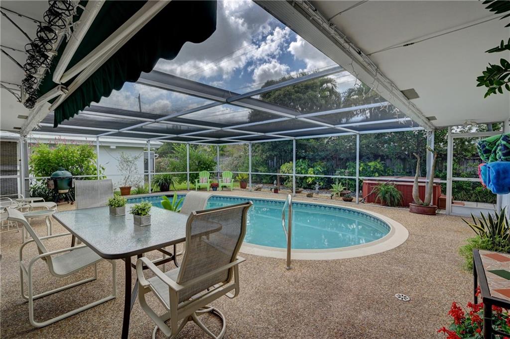 Beautiful spacious 4 bedroom, 2 bath Imperial Point Pool Home! Updated kitchen w/Kraftmaid wood cabinets & newer stainless steel appliances, plenty of storage. Breakfast bar & family room. Large master bedroom, updated bath, walk in closet & plantation shutters. New A/C 2019, hot water heater 2018. All french doors & living room windows are impact. Other windows & cabana bath have shutters. 2 car garage plus separate laundry room. Great outdoor entertaining. Solar heated pool, screened in to keep out bugs & leaves. Great for pets. The backyard is a tranquil setting that includes a hot tub, outdoor lighting for entertaining as well as a lovely garden with Florida friendly plantings, trees and bird baths. Great location!