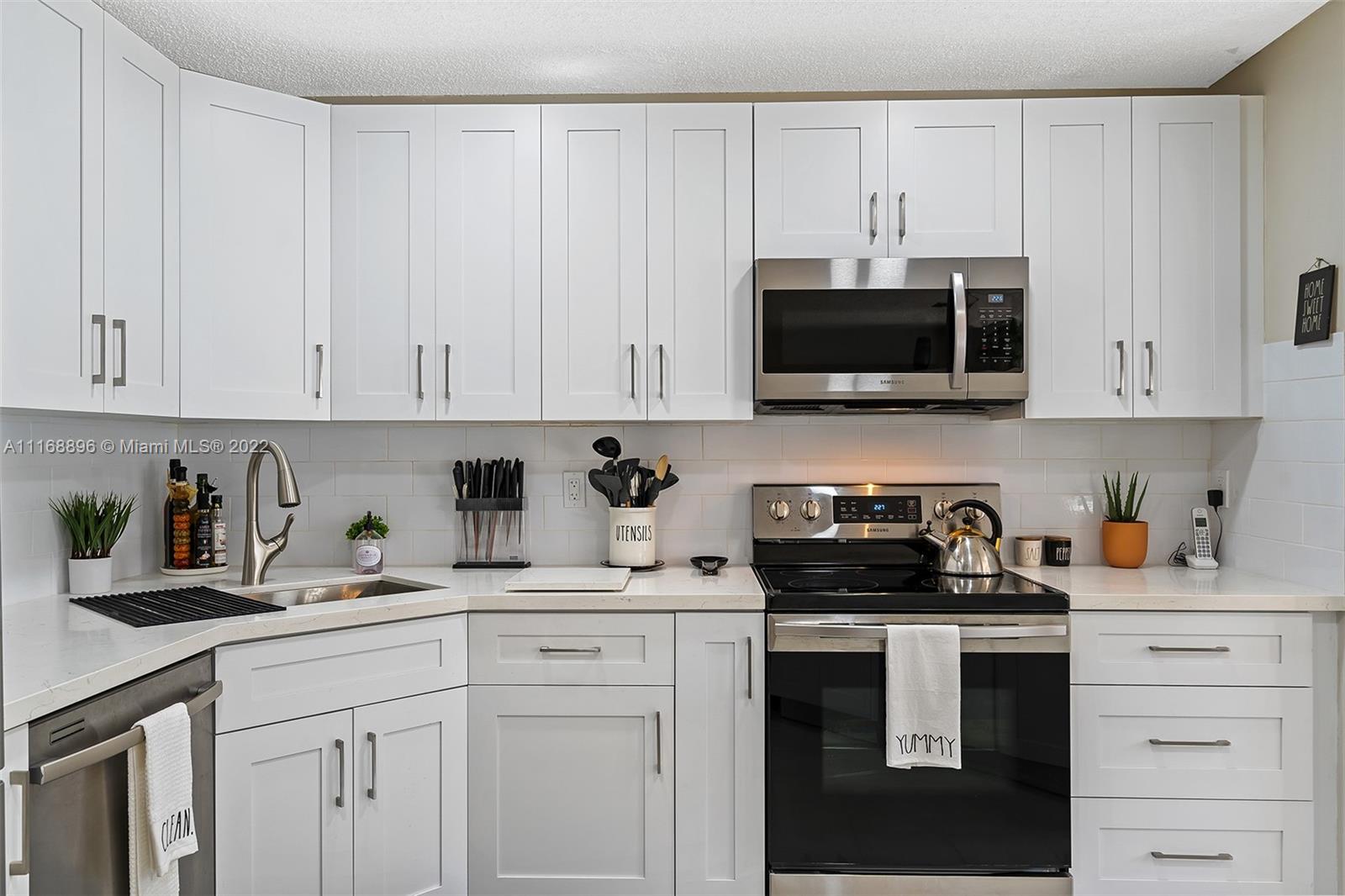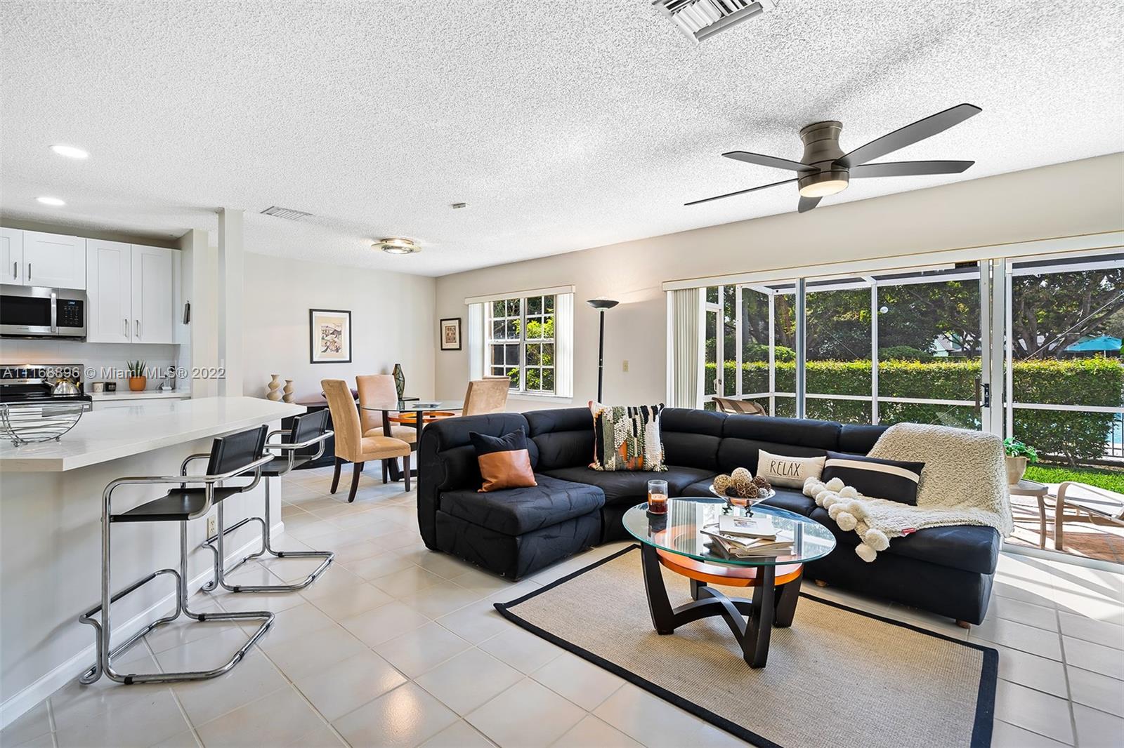 This is the one! Spacious corner 3-bedroom 2 and a half bath townhouse with 2 car garage in desirable Coral Sun, Coral Springs. 1st floor has a foyer entry, an open concept living area, powder room, beautifully renovated kitchen with stainless steel appliances and quartz countertops, huge island and custom cabinetry. Sliding doors open to a serene extended screened in patio. Second floor 2 front bedrooms share a balcony, and each have huge walk-in closets, owner's suite has sliding doors for an indoor/outdoor feel, vaulted ceilings and a renovated bathroom. Closet space galore! Centrally located close to highways and shopping. See this beautiful townhome before its gone!