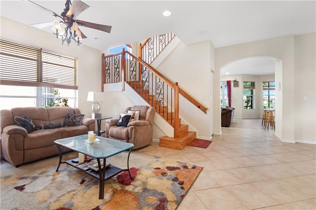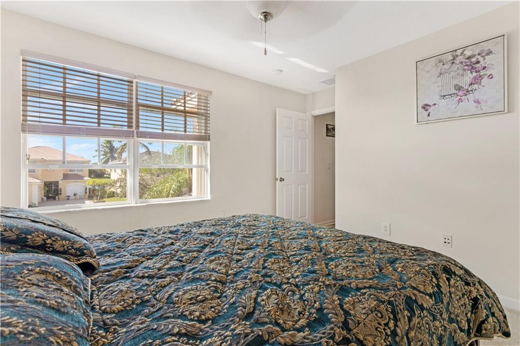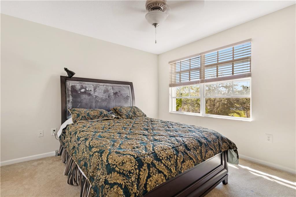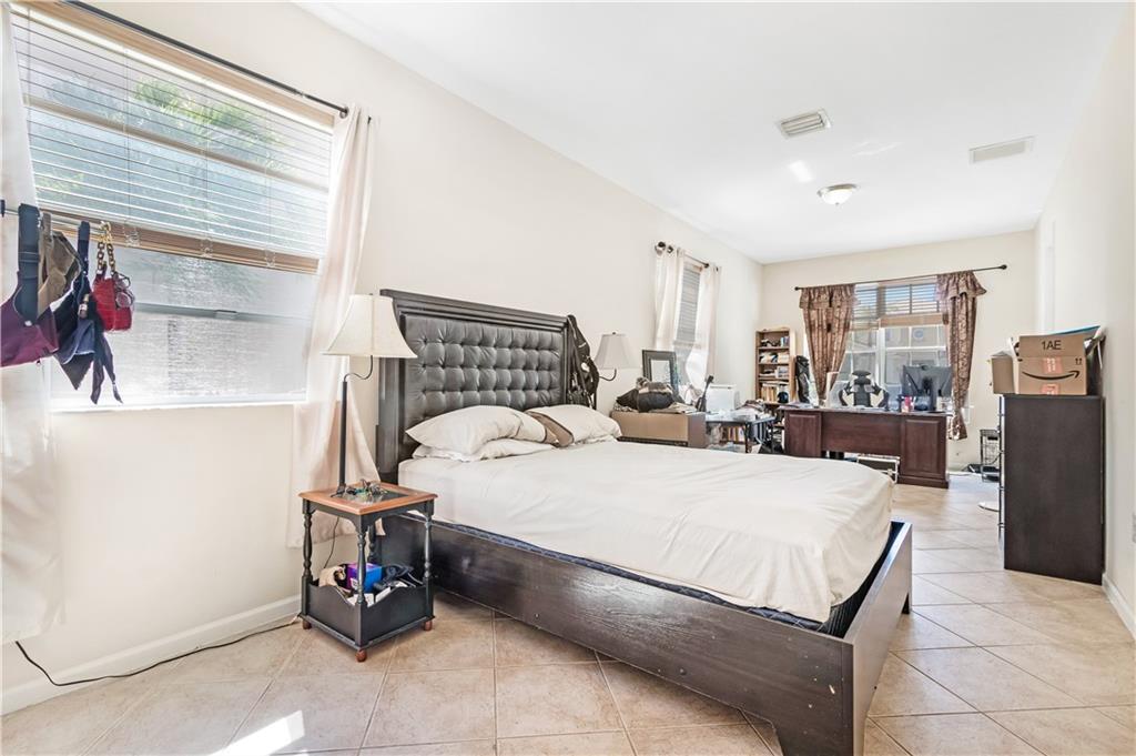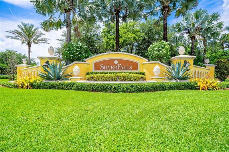 Enormous lakefront Bentley model located in the prestigious and gated Silver Falls. Downstairs features eat in kitchen with island, newer stainless steel appliances. First floor bedroom with private entrance could easily become an efficiency or a private wing including full handicapped accessible bathroom with step in shower/tub. Downstairs also features formal dining and large screened porch. Up the wooden staircase with iron rod banister, leads to 4 more bedrooms AND upstairs laundry room. Primary bedroom is massive, with entire sitting area or office. Two spacious closets. Split master bathroom with adjoining shower. Also features French doors leading out to balcony overlooking the lake. Accordion shutters on all windows for hurricane protection. Two car garage with paver driveway.