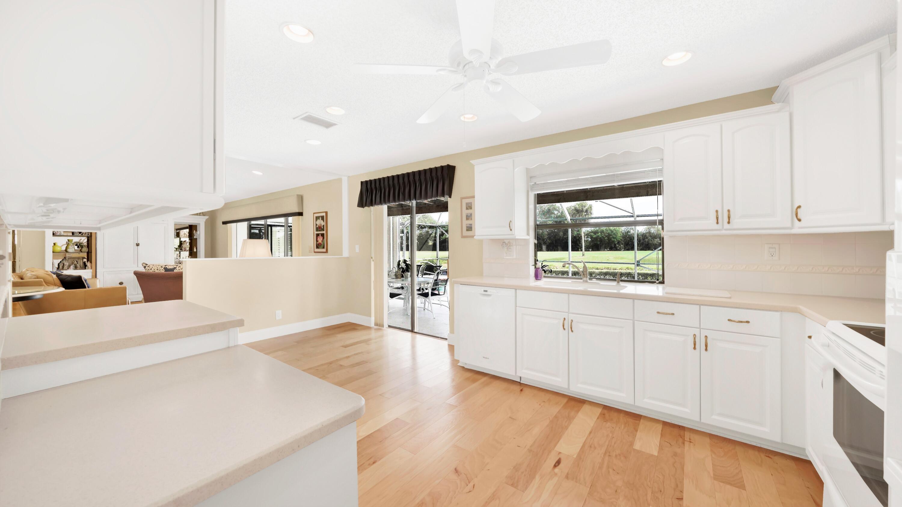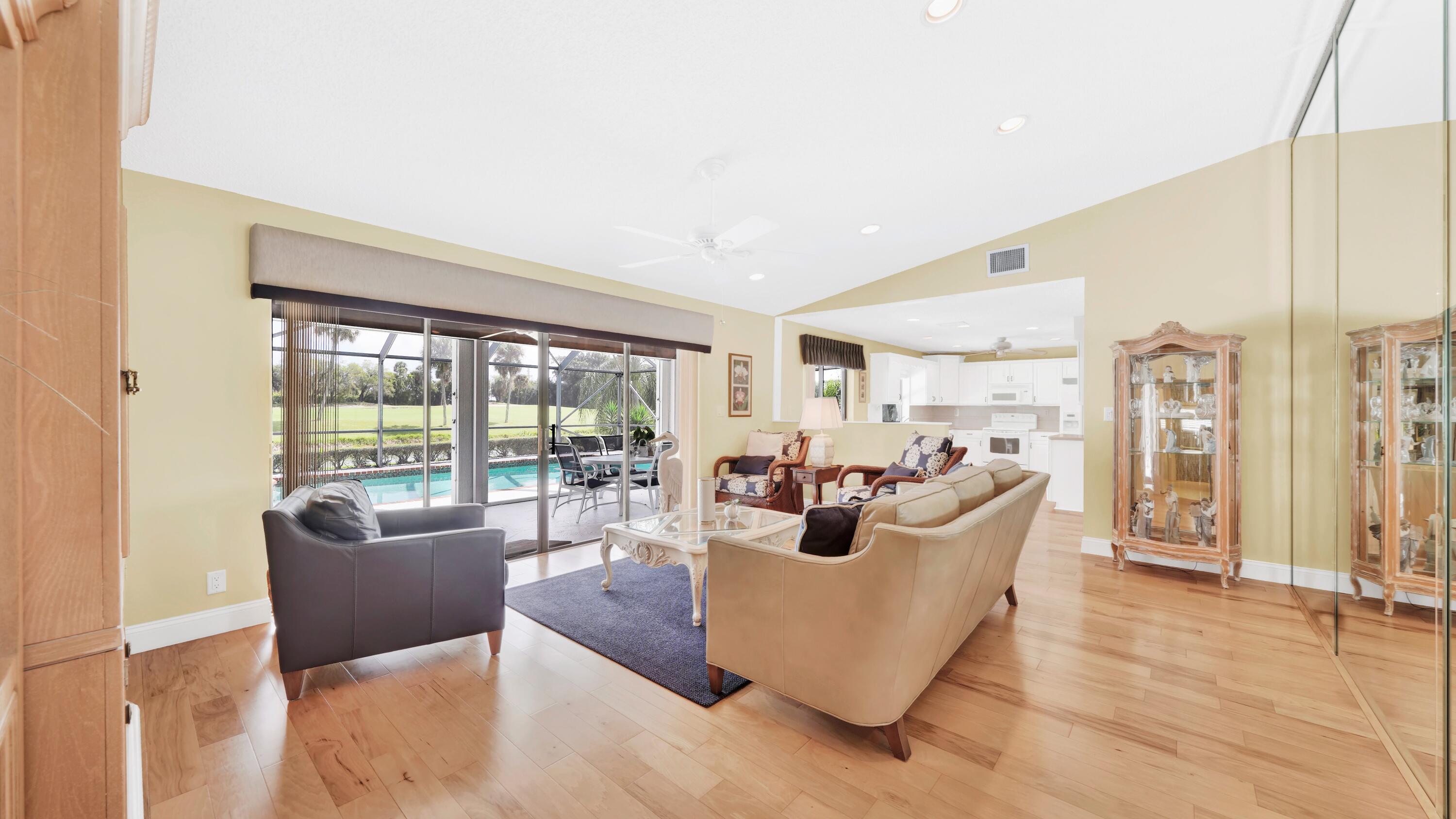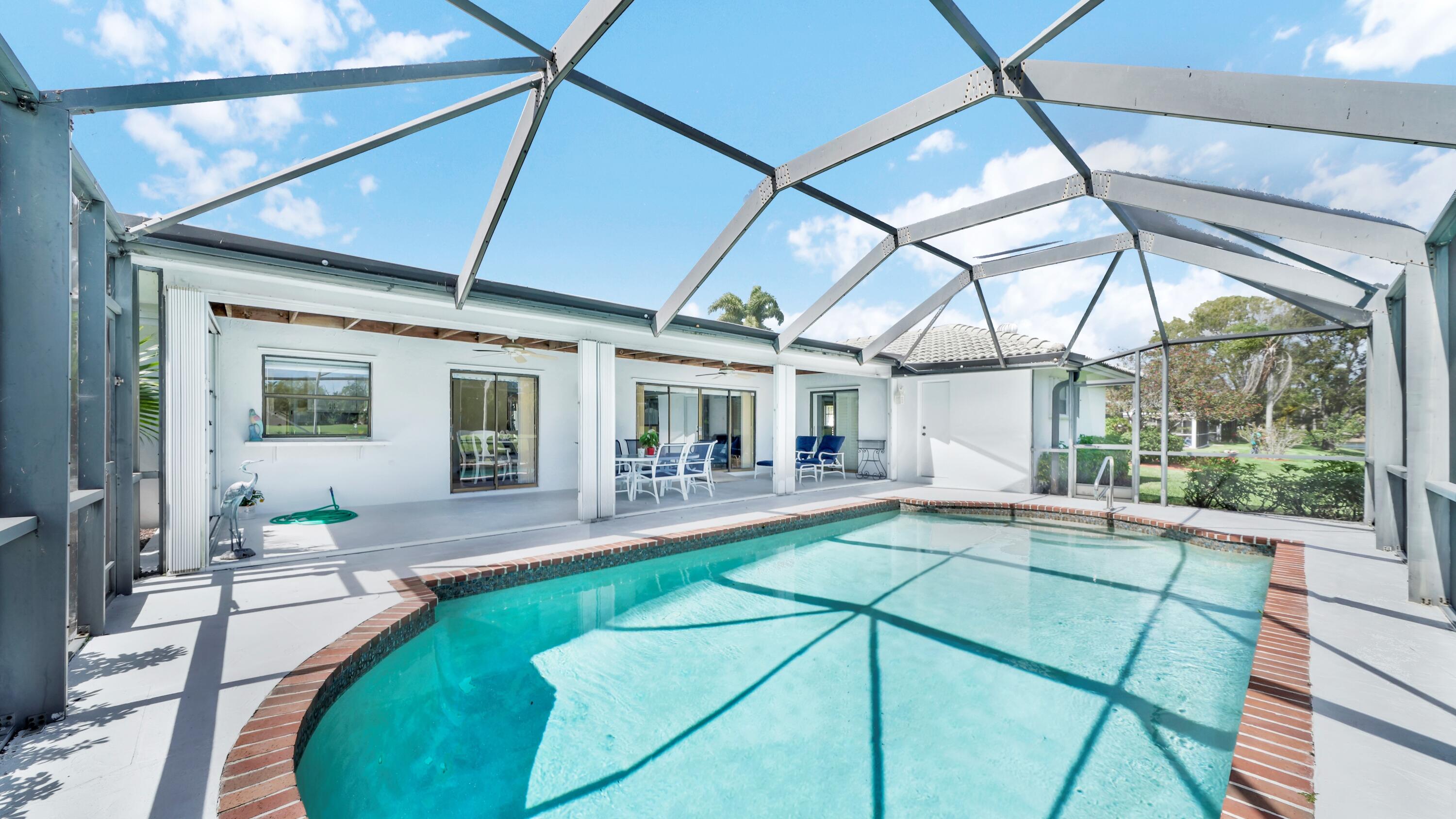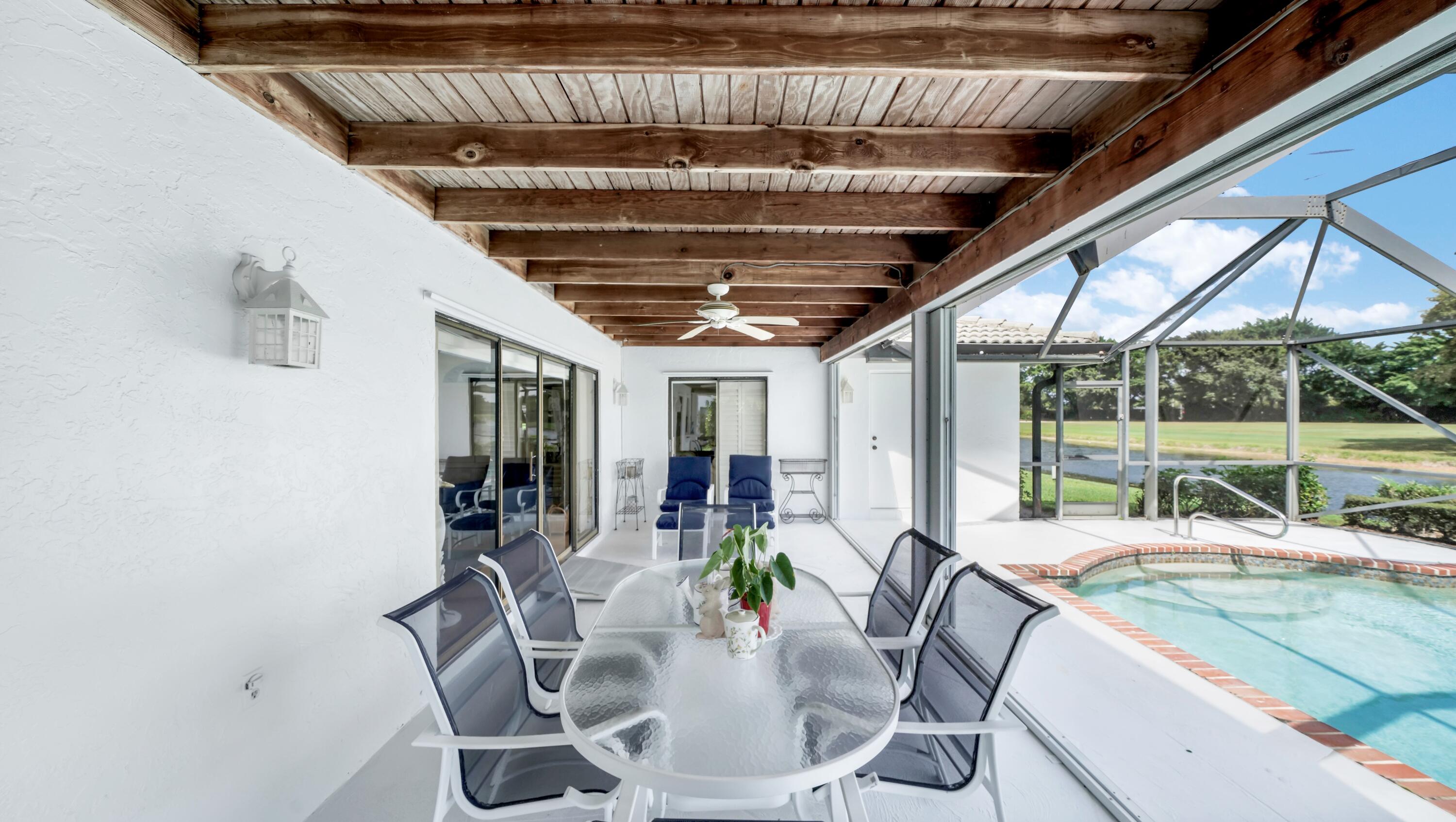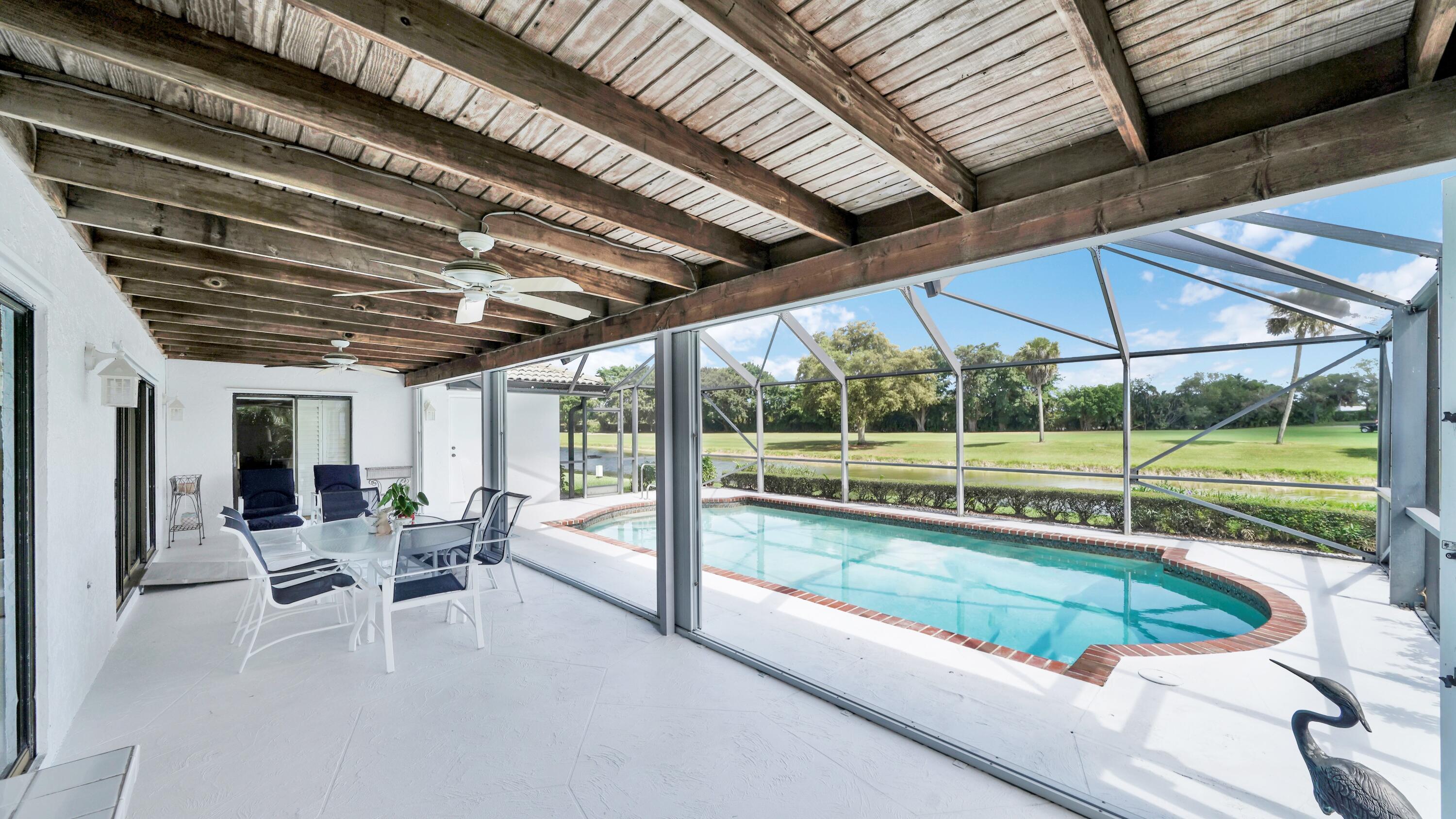 Beautiful home in fabulous gated west Boca community! You're going to love the 180 degree WATER AND FAIRWAY VIEWS and the ability to play golf at a club without equity fees. This spacious one-story home has been lovingly cared for with many charming features: real HICKORY WOOD floors in most rooms, updated kitchen cabinets with Corian countertops and Corian deep sink. THREE tastefully remodeled full baths. Plantation shutters, neutral decor and closets galore add to the home's appeal. Check out the photos and room sizes and you will be impressed. Accordion hurricane shutters on windows and enclosing the entire porch. This home is located close to the entrance of the community. For more details about this home, local schools and Boca Greens Country Club, click here