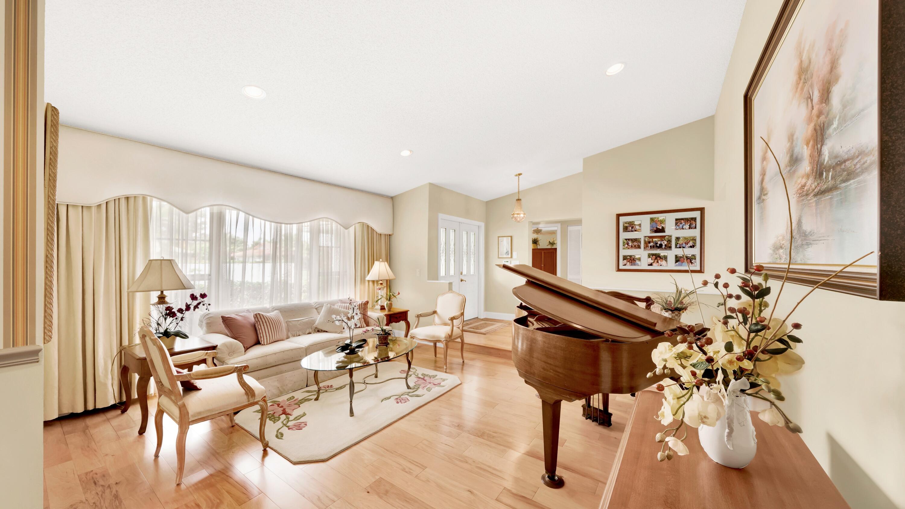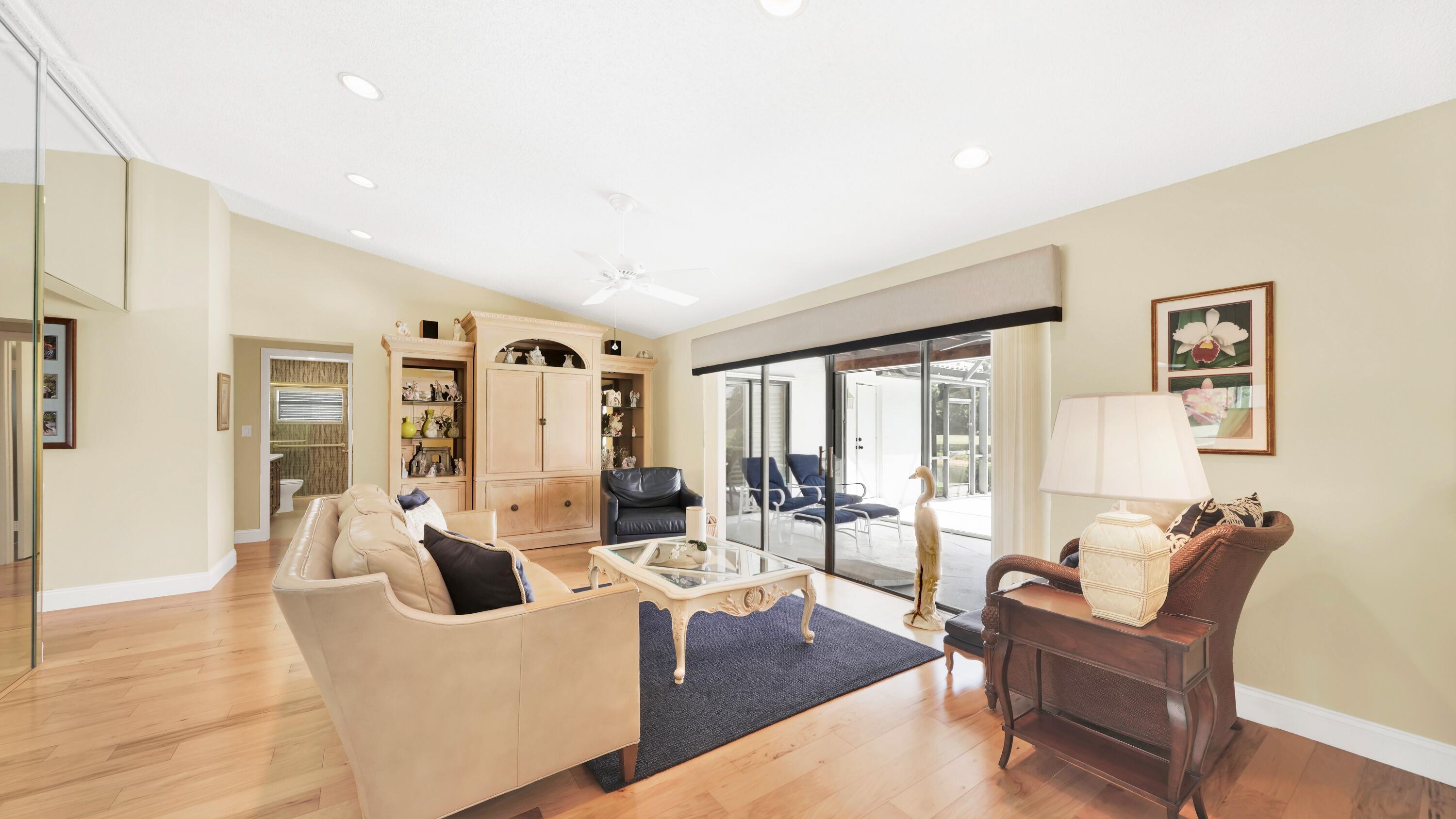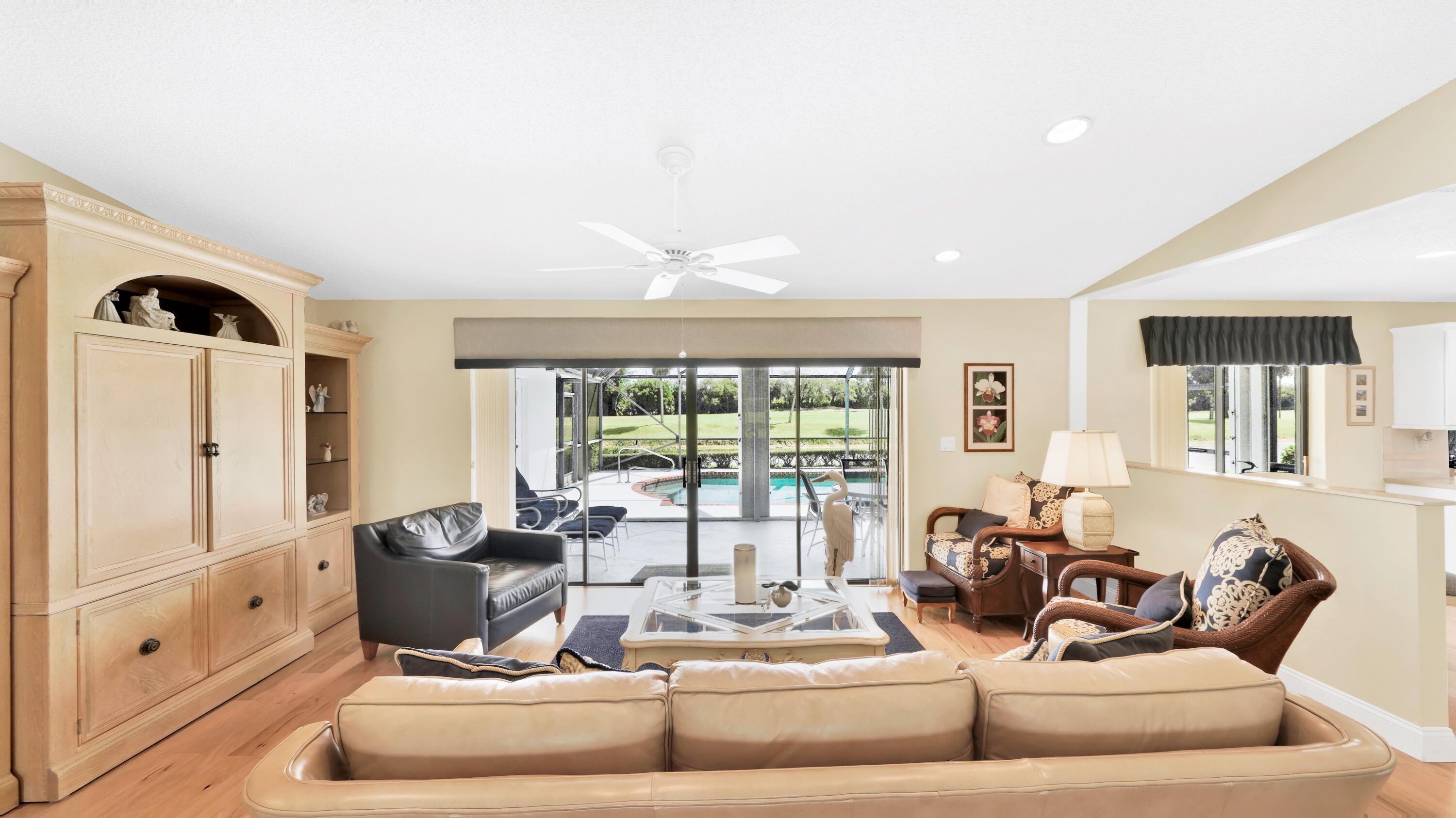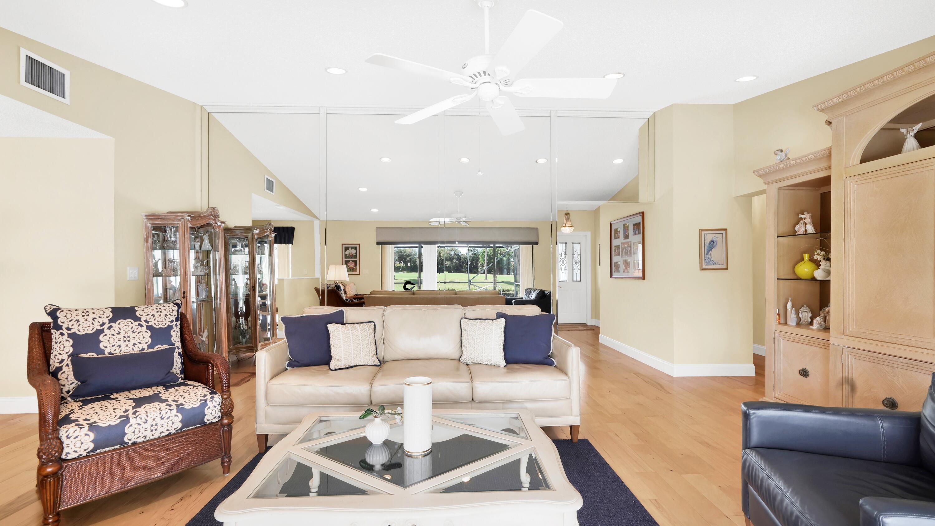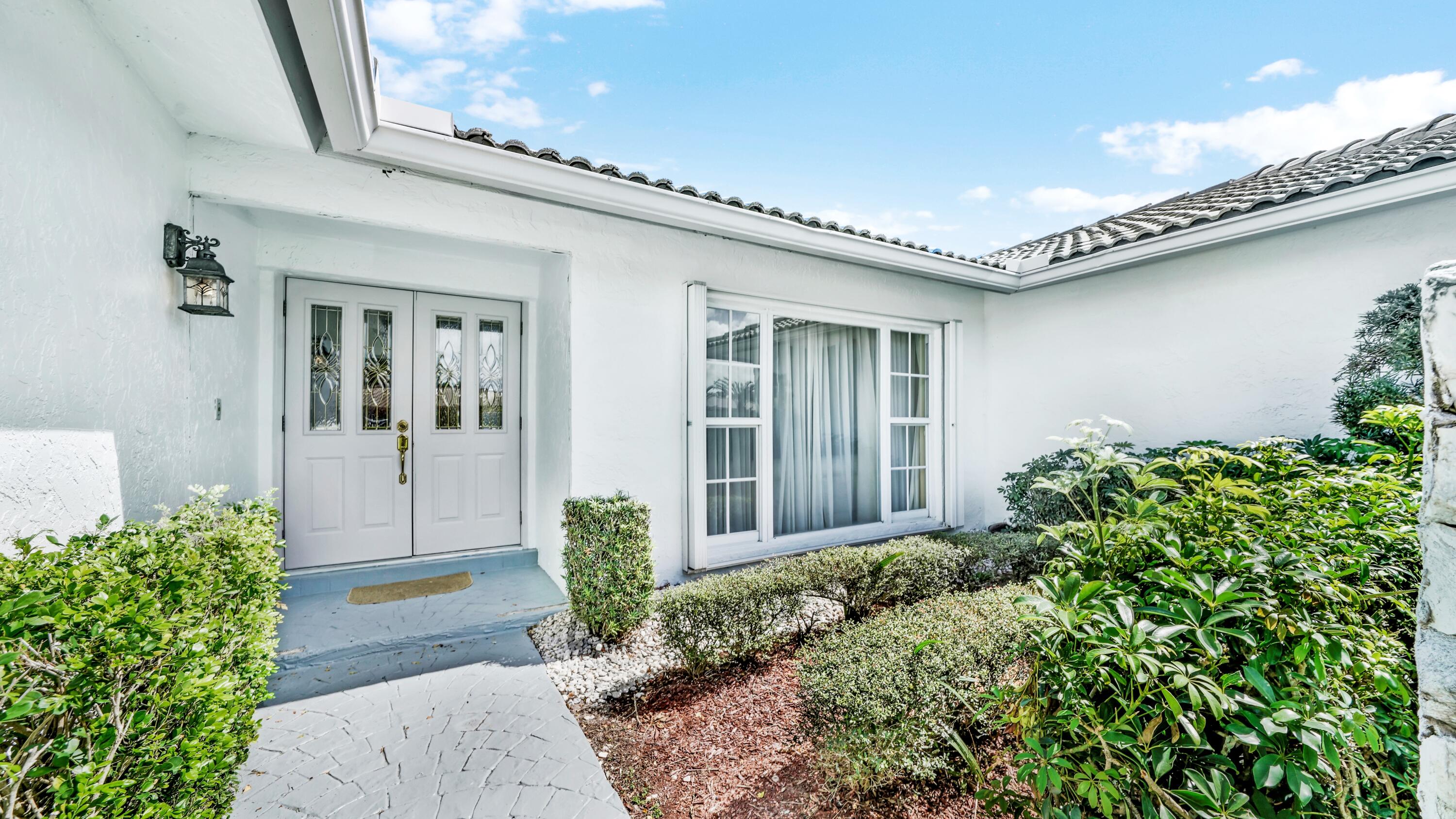 Beautiful home in fabulous gated west Boca community! You're going to love the 180 degree WATER AND FAIRWAY VIEWS and the ability to play golf at a club without equity fees. This spacious one-story home has been lovingly cared for with many charming features: real HICKORY WOOD floors in most rooms, updated kitchen cabinets with Corian countertops and Corian deep sink. THREE tastefully remodeled full baths. Plantation shutters, neutral decor and closets galore add to the home's appeal. Check out the photos and room sizes and you will be impressed. Accordion hurricane shutters on windows and enclosing the entire porch. This home is located close to the entrance of the community. For more details about this home, local schools and Boca Greens Country Club, click here