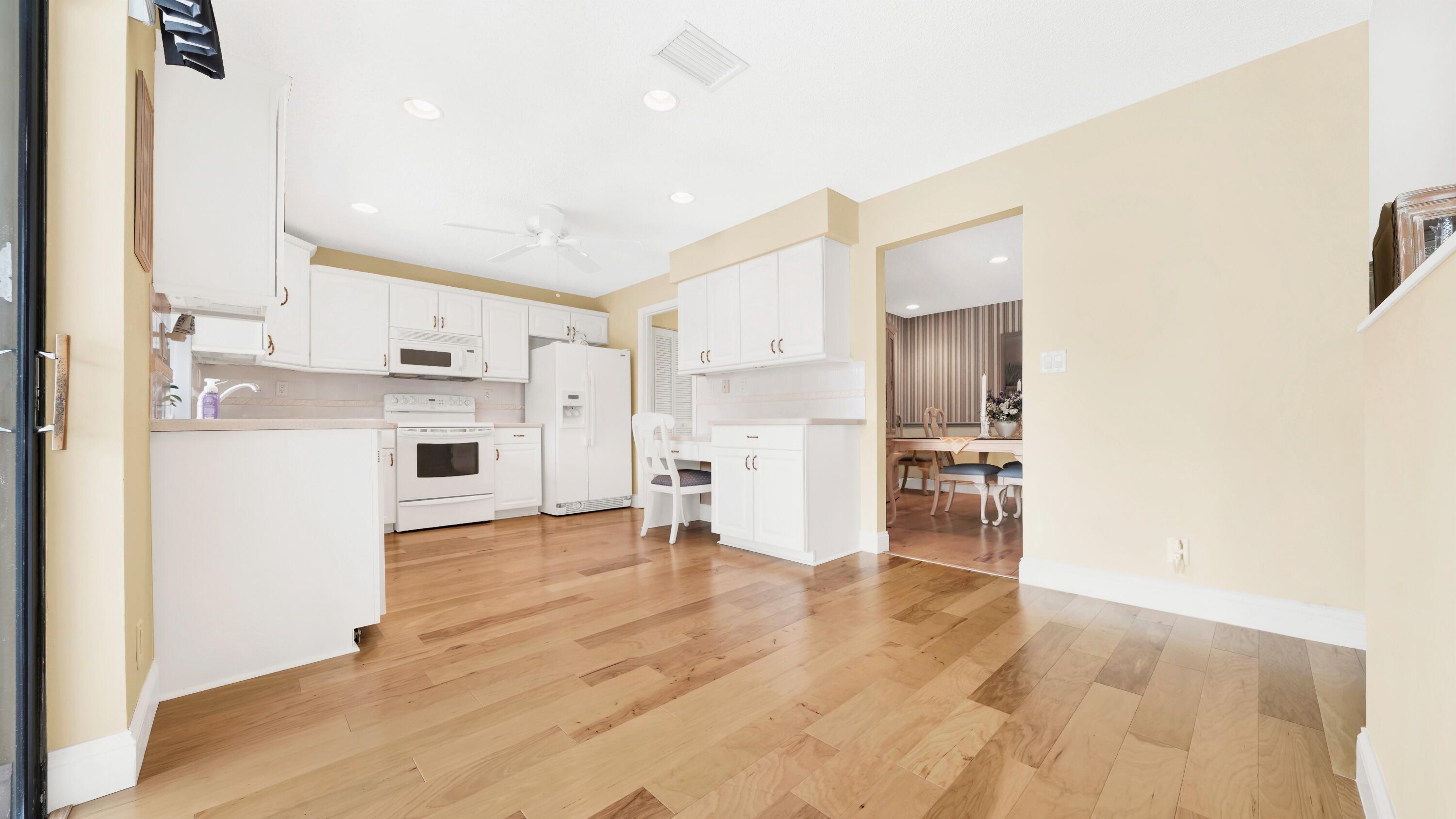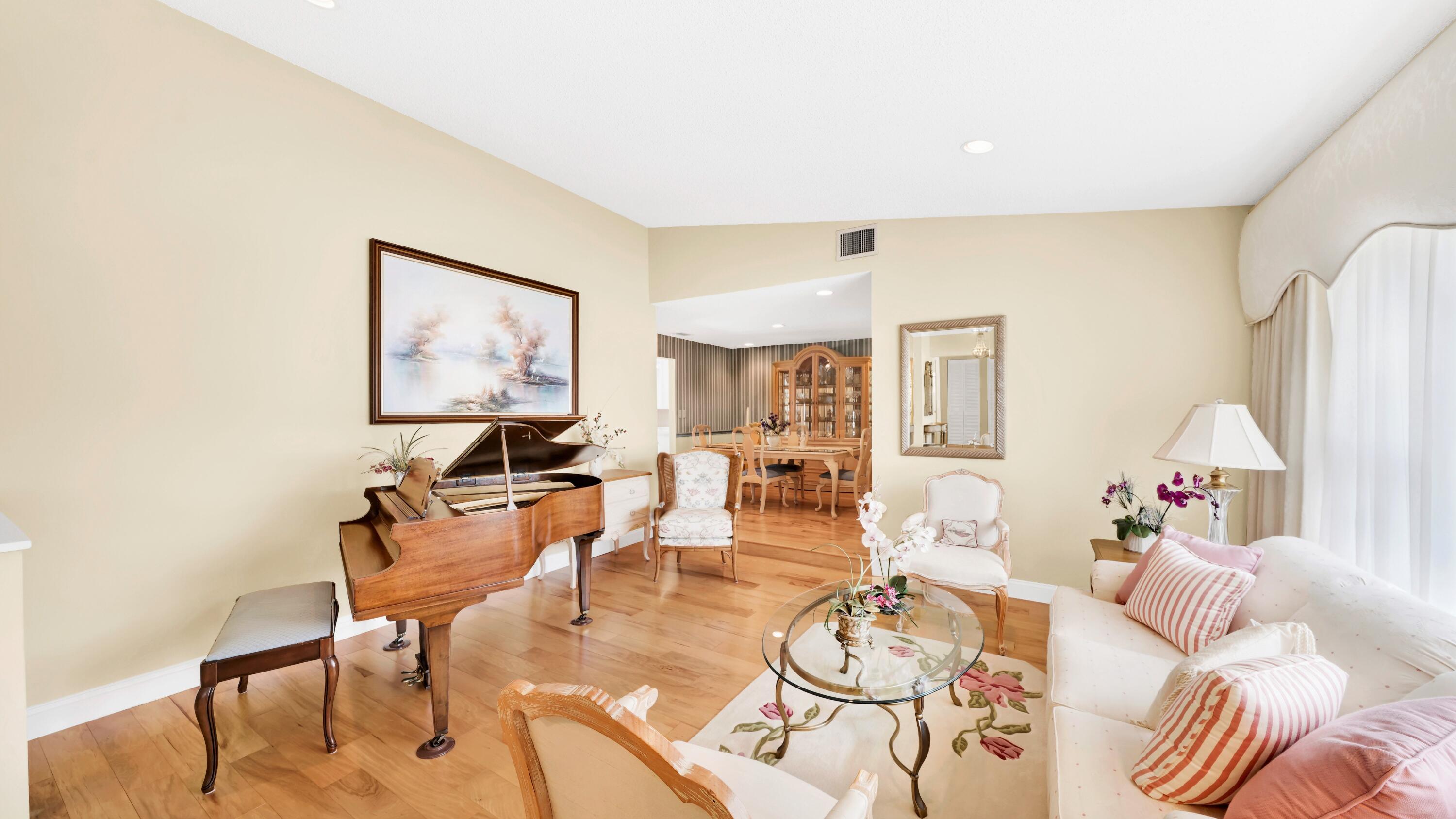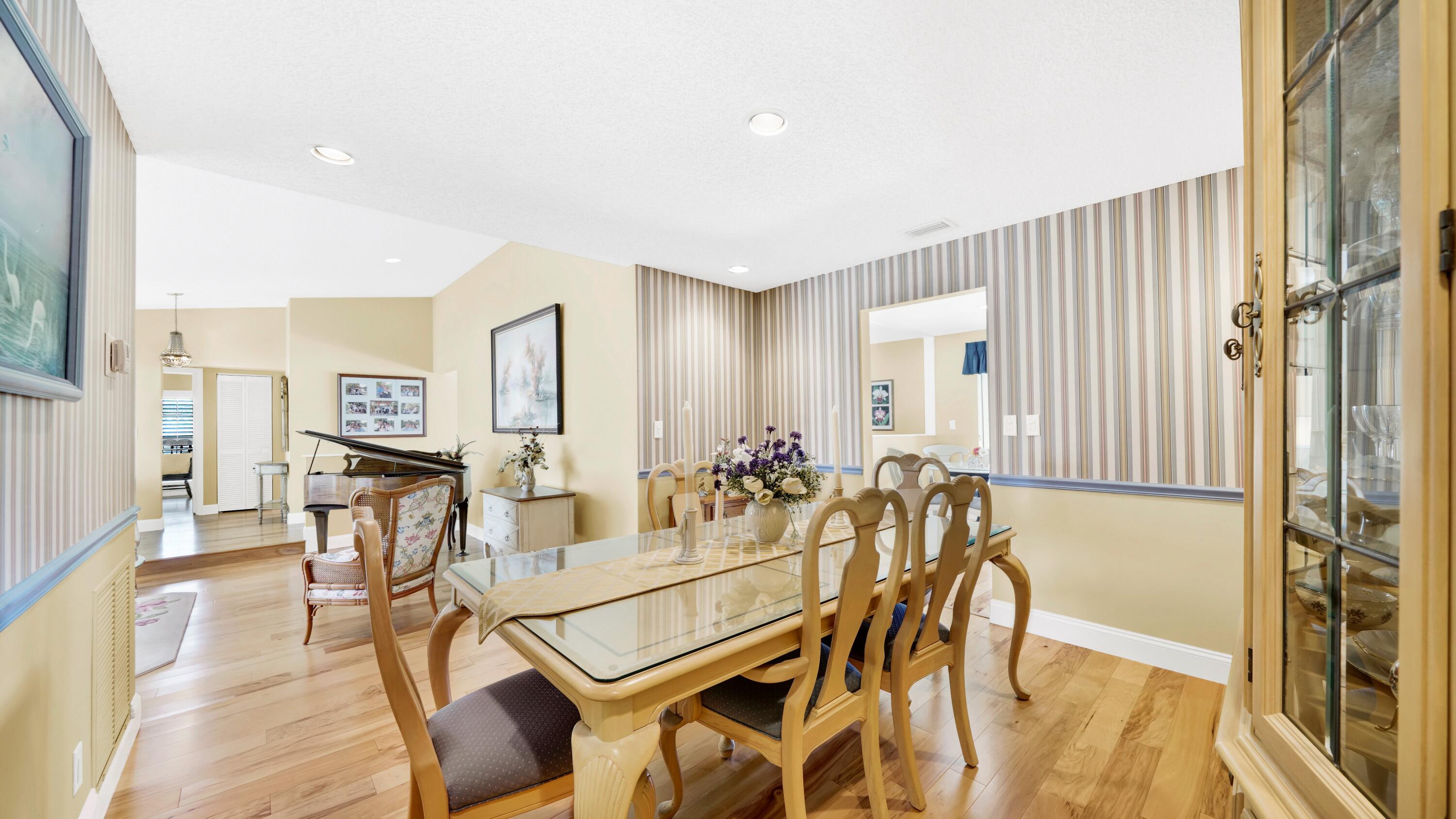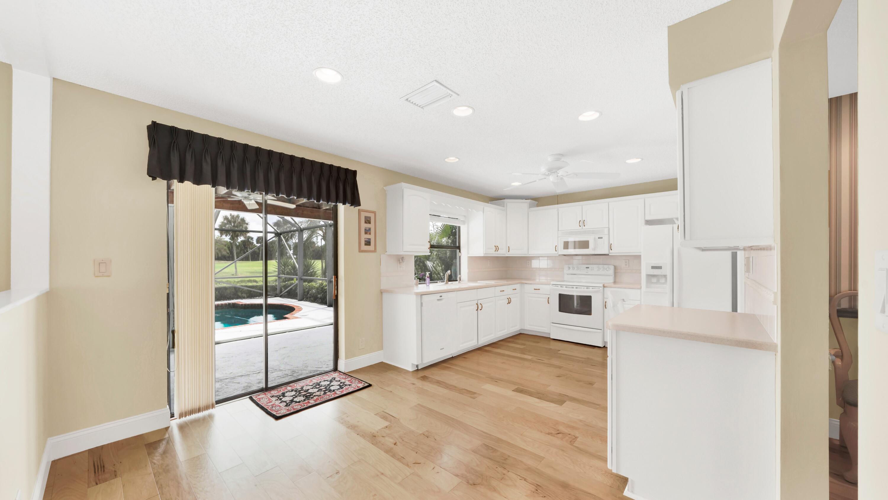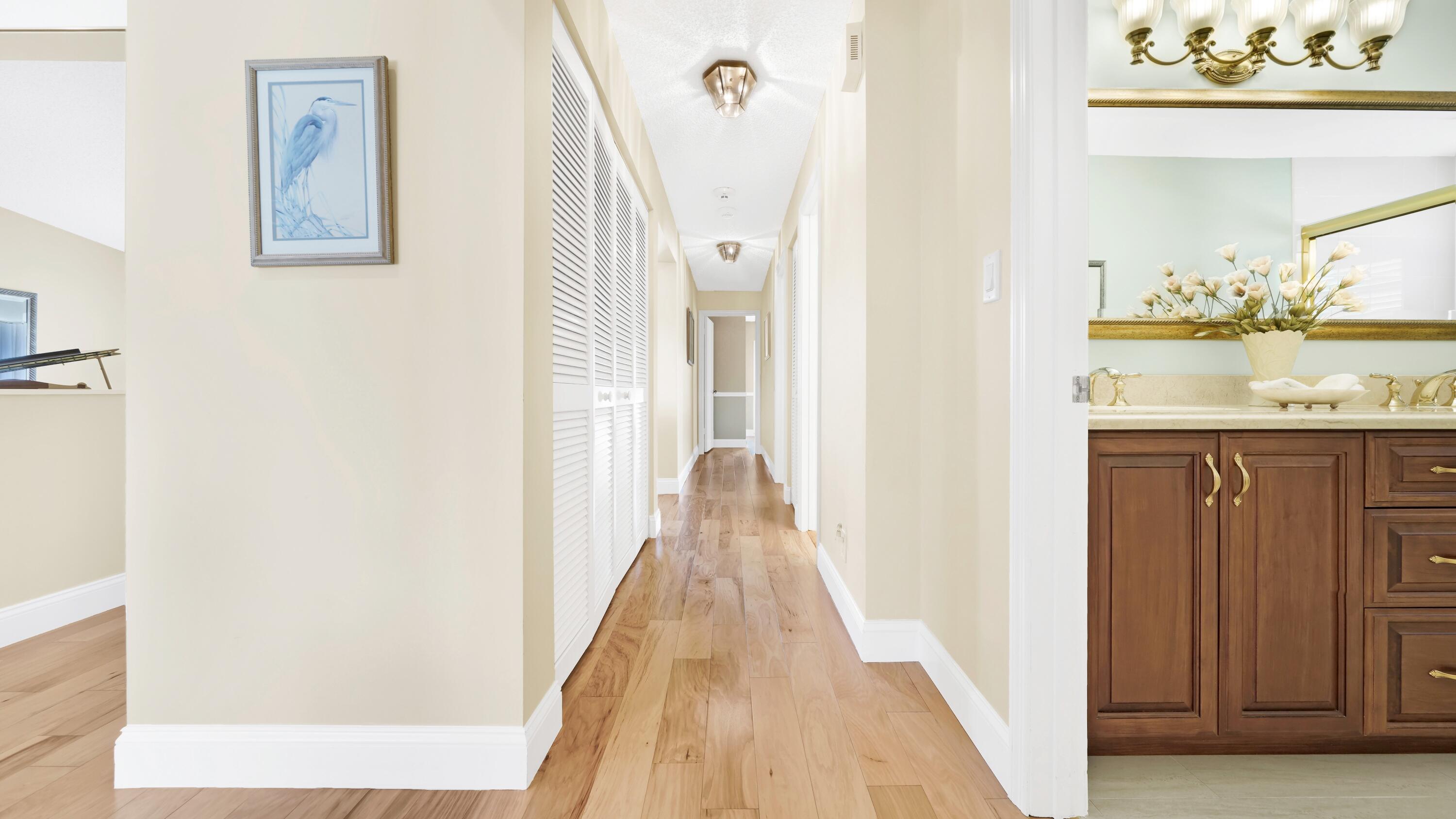 Beautiful home in fabulous gated west Boca community! You're going to love the 180 degree WATER AND FAIRWAY VIEWS and the ability to play golf at a club without equity fees. This spacious one-story home has been lovingly cared for with many charming features: real HICKORY WOOD floors in most rooms, updated kitchen cabinets with Corian countertops and Corian deep sink. THREE tastefully remodeled full baths. Plantation shutters, neutral decor and closets galore add to the home's appeal. Check out the photos and room sizes and you will be impressed. Accordion hurricane shutters on windows and enclosing the entire porch. This home is located close to the entrance of the community. For more details about this home, local schools and Boca Greens Country Club, click here