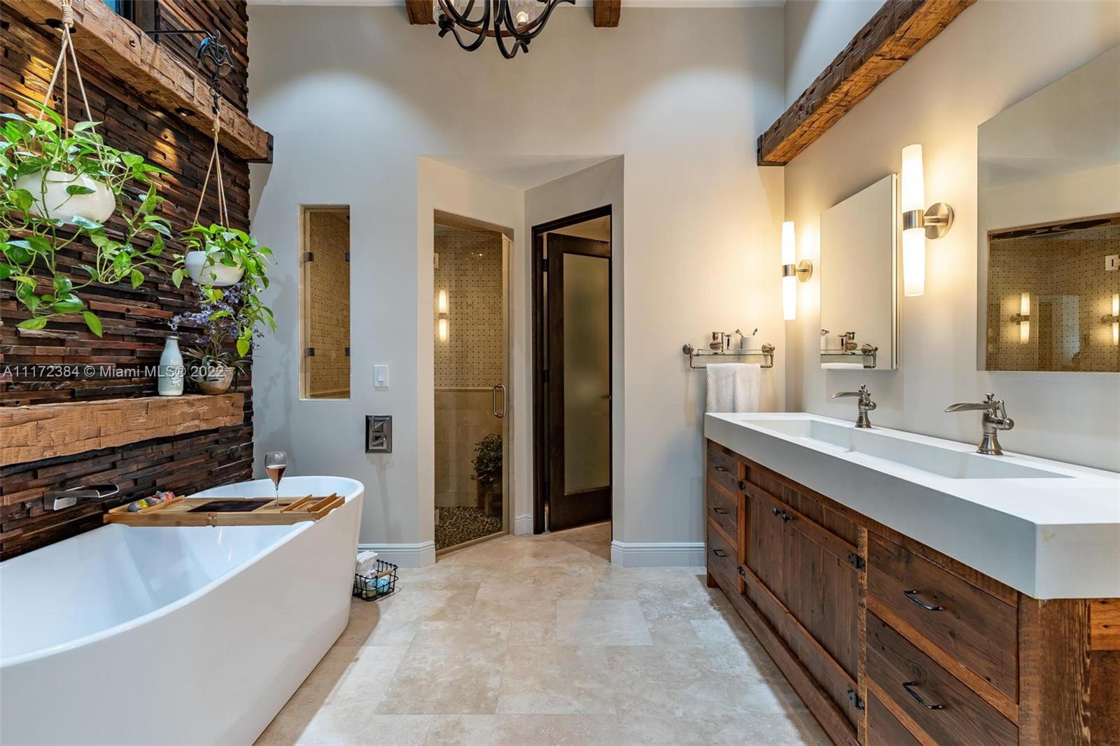 Stunning remodeled waterfront home in gated Maplewood Isle. 5/4 w/ custom impact windows & doors. Front entry through courtyard w/ water feature. High end flooring. Kitchen w/ Lg island, stunning granite counter tops, glass subway back splash, Waterstone faucet & pot filler, high end appliances inc 48" gas stove & plumbed Miele coffee maker. Pool w/ waterfall, lit water bowls, Baja shelf & ext shower. Patio enclosed w/ updated 1/2 bath. 1st fl Master bdrm w/ custom barn door to walk-in built-in closet. Master bath w/ free-standing tub, Toto toilet w/ remote features, reclaimed barn wood vanity w/ concrete trough sink & hidden electric outlets. Sitting room w/wine cellar. 2nd bdrm w/bath on 1st floor. Custom $70k walnut floating staircase leads to loft, 3 bdrm w/ closet systems & 1 bath.
