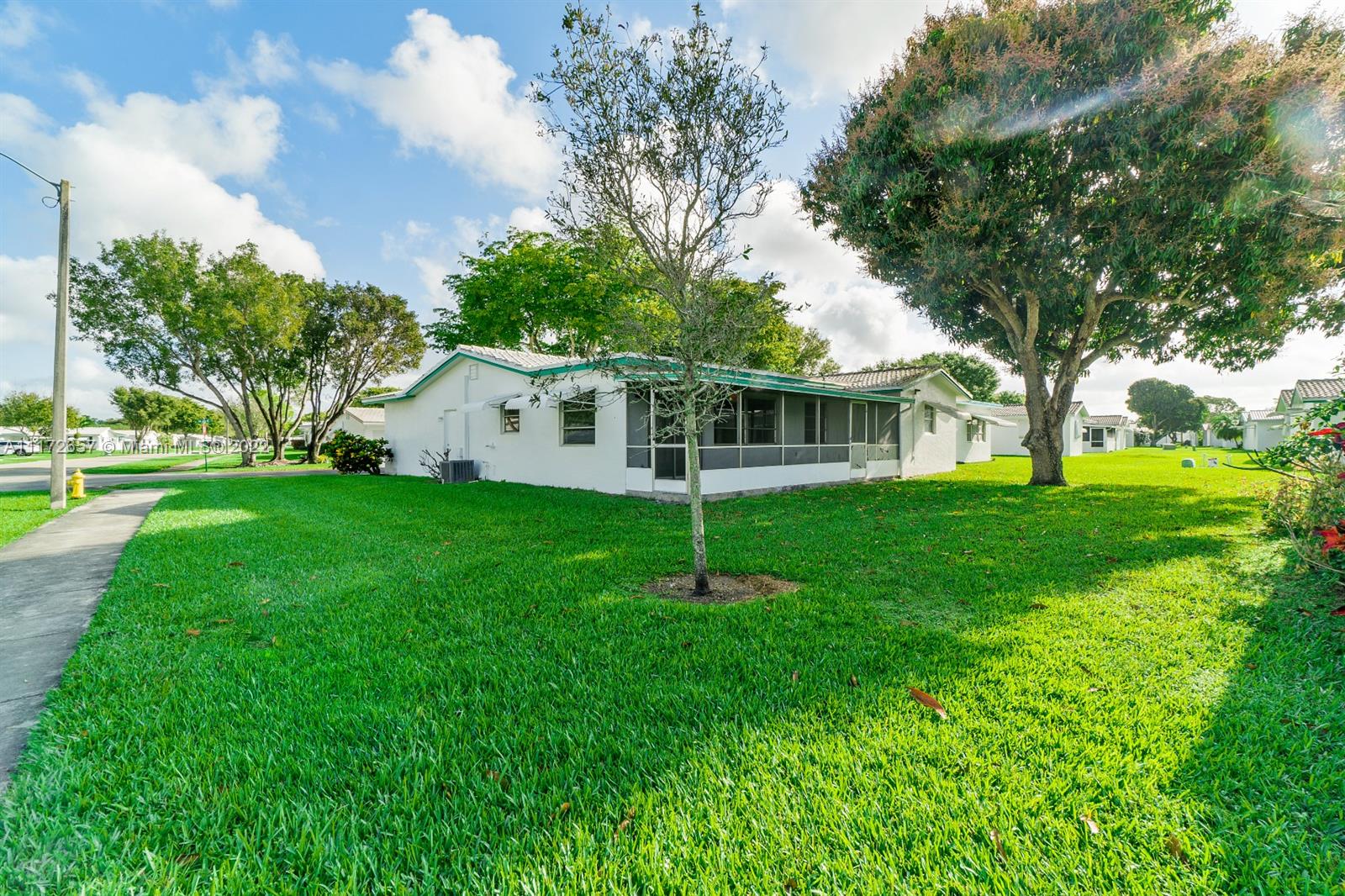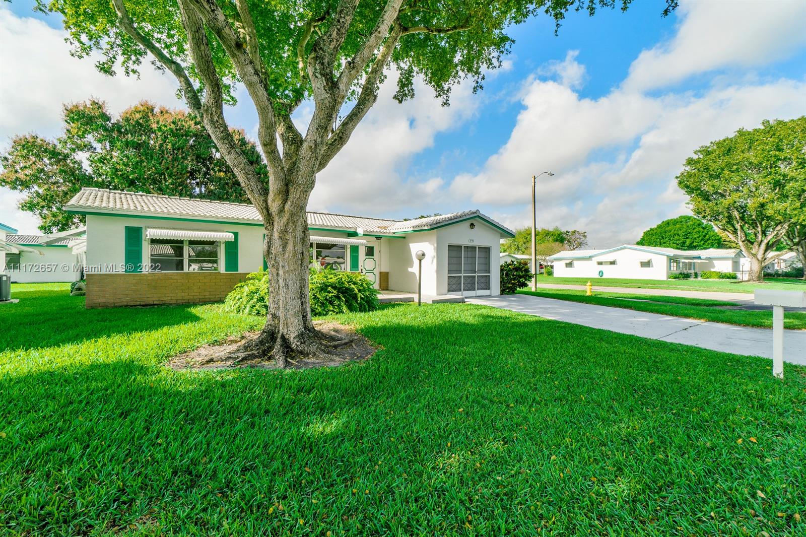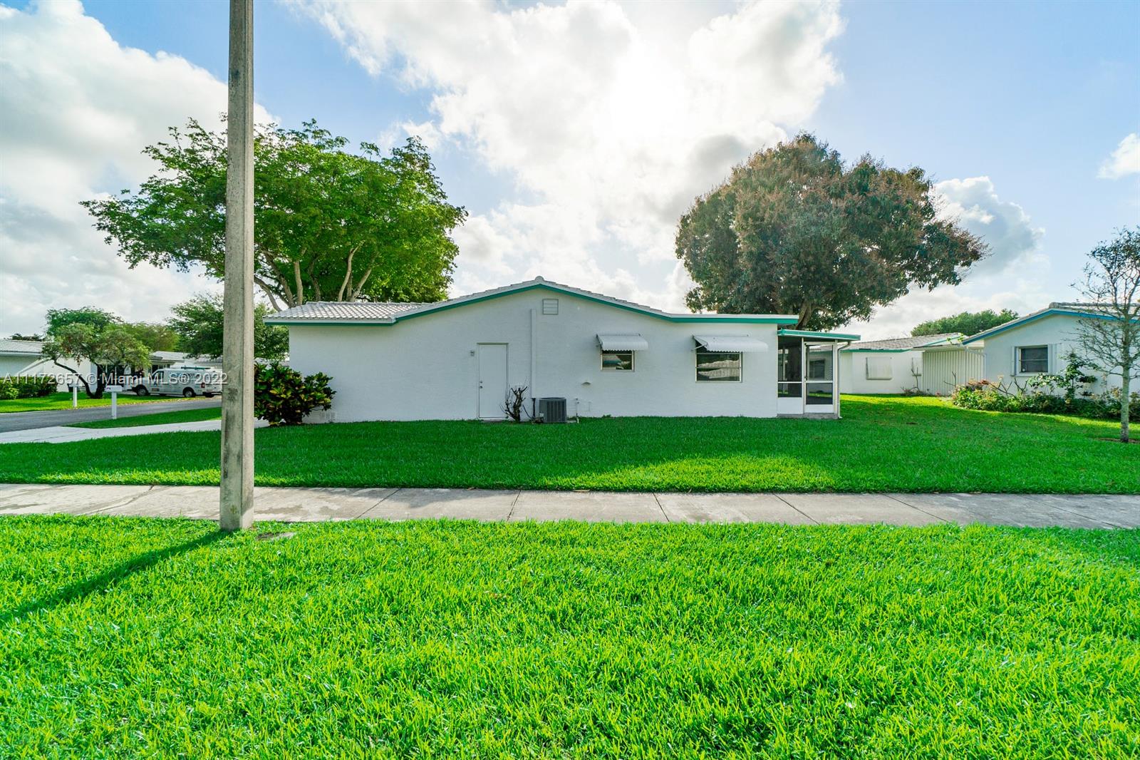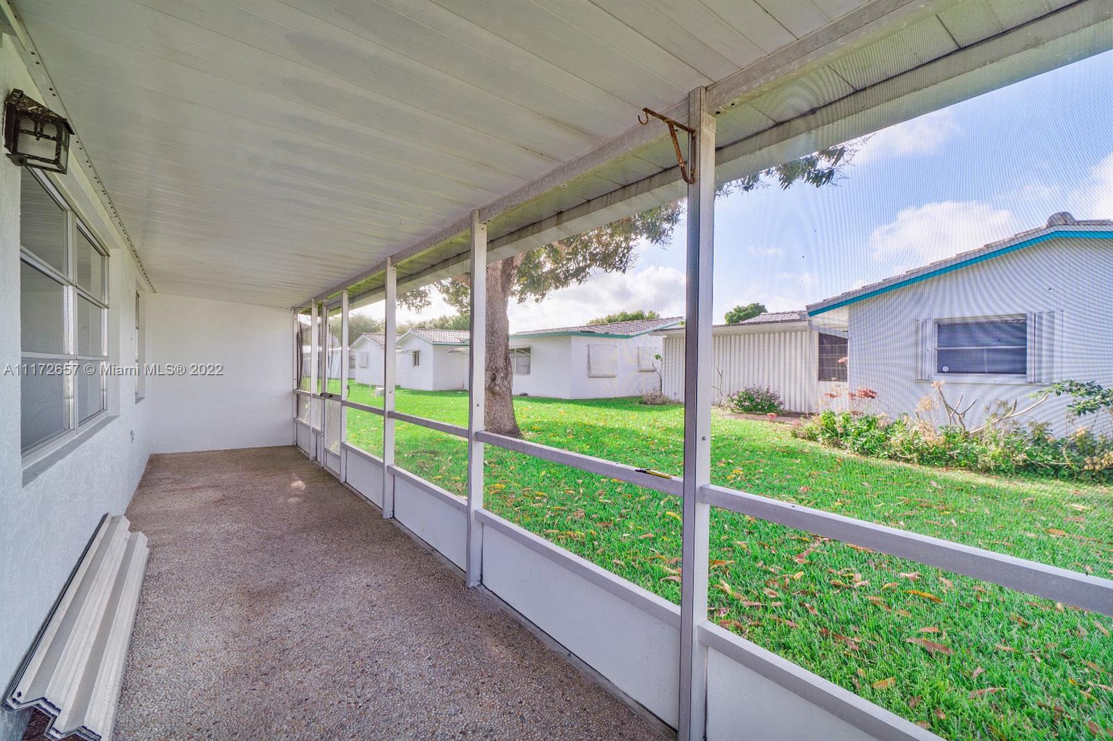 Situated On An Oversized Corner Lot With Lots Of Green Space & Mature Trees For Shade, Is This 2 BR, 2 BA Spacious Home.The 1 Car Garage Also Has Bi Fold Screen For Extra Ventilation & Long Driveway For All Your Parking Needs.Large Front Porch Welcomes You To Sit & Enjoy The Peace This Community Offers! Lots Of Room For Family Gatherings In This Open & Airey Space With Lots Of Natural Lighting. Newer Laminate Flooring In Both Bedrooms, Hallway & Living Room. Original Kitchen Has Recessed Lights. Large & Spacious Backyard With Your Very Own Mature Mango Tree To Enjoy & Provides Extra Shade.Newer Roof In 2020. HOA Maintains The Roof With Repairs, Replacement & Painting. Enjoy The Many Amenities, Clubhouse, Fitness Room, Theater, 2 Heated Pools & More. Close To All Major Highways & Shopping.