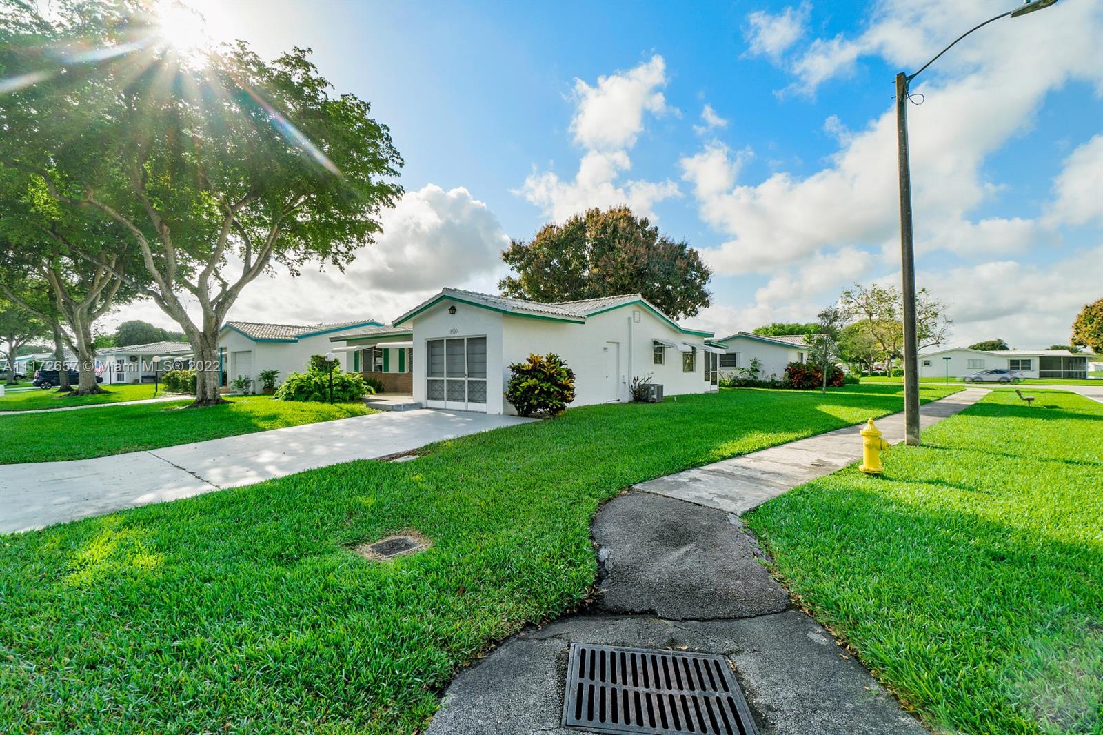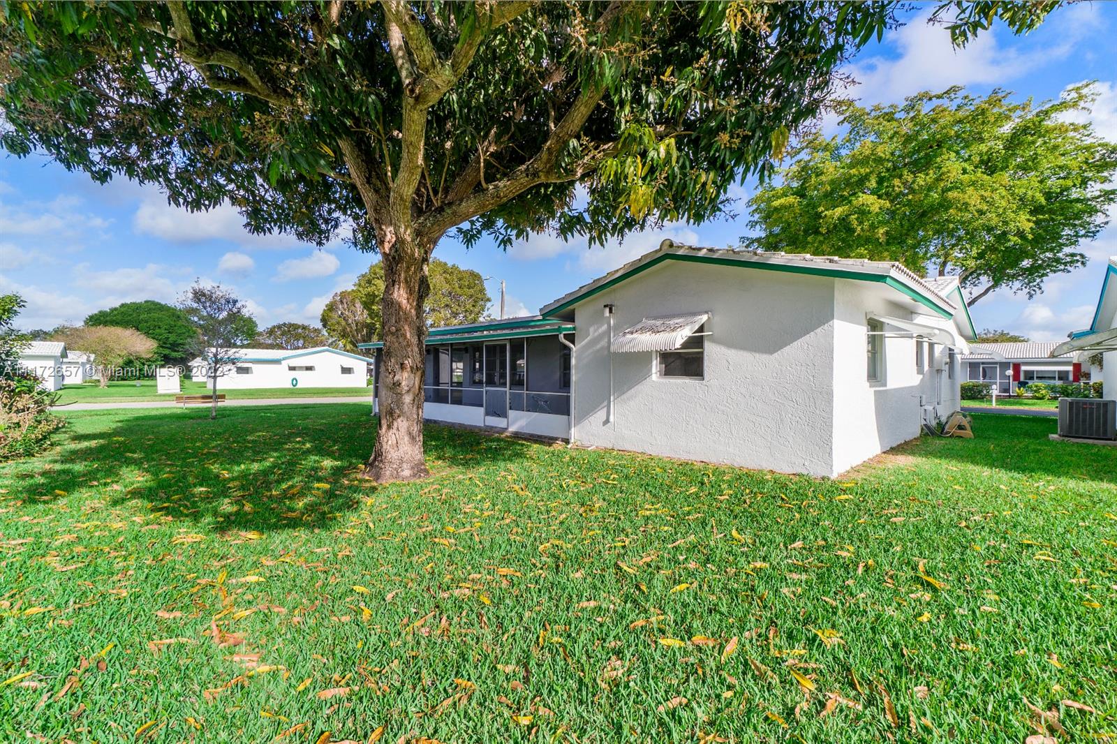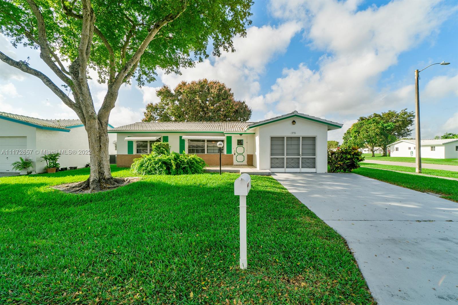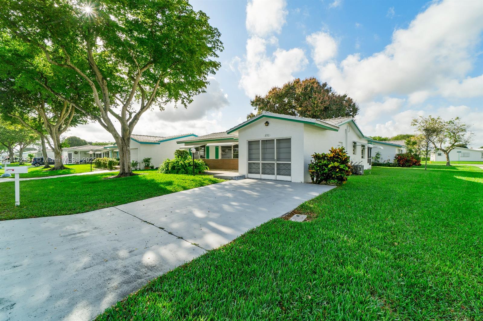 Situated On An Oversized Corner Lot With Lots Of Green Space & Mature Trees For Shade, Is This 2 BR, 2 BA Spacious Home.The 1 Car Garage Also Has Bi Fold Screen For Extra Ventilation & Long Driveway For All Your Parking Needs.Large Front Porch Welcomes You To Sit & Enjoy The Peace This Community Offers! Lots Of Room For Family Gatherings In This Open & Airey Space With Lots Of Natural Lighting. Newer Laminate Flooring In Both Bedrooms, Hallway & Living Room. Original Kitchen Has Recessed Lights. Large & Spacious Backyard With Your Very Own Mature Mango Tree To Enjoy & Provides Extra Shade.Newer Roof In 2020. HOA Maintains The Roof With Repairs, Replacement & Painting. Enjoy The Many Amenities, Clubhouse, Fitness Room, Theater, 2 Heated Pools & More. Close To All Major Highways & Shopping.