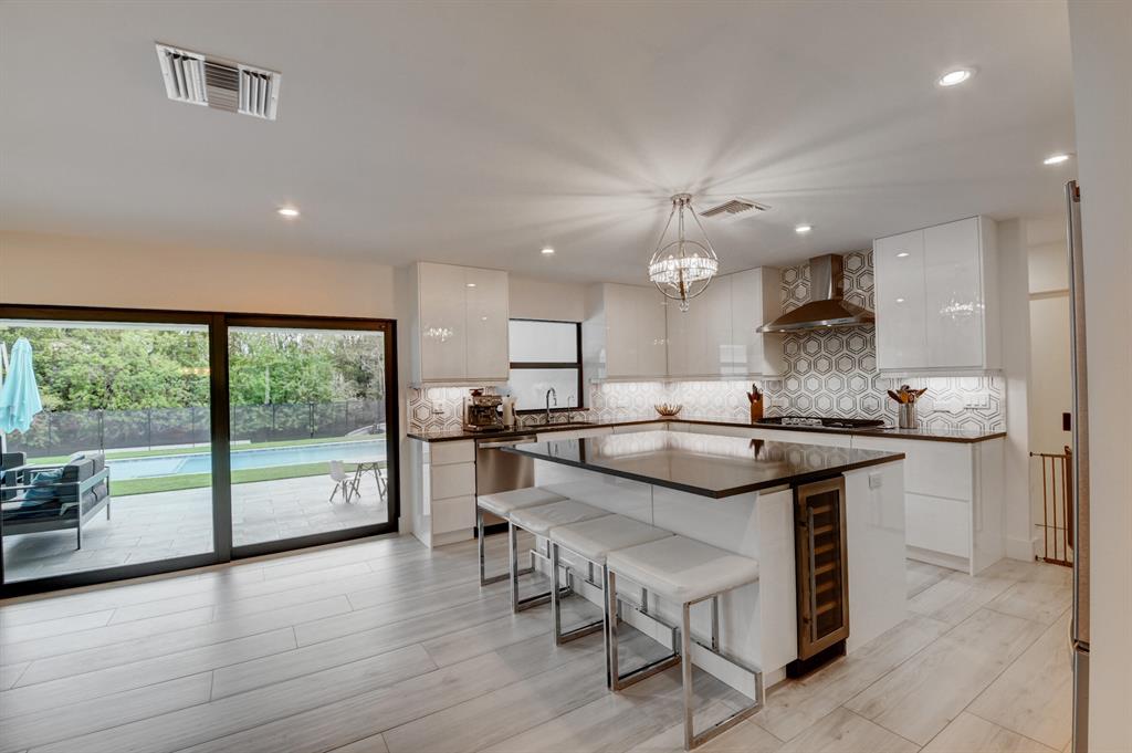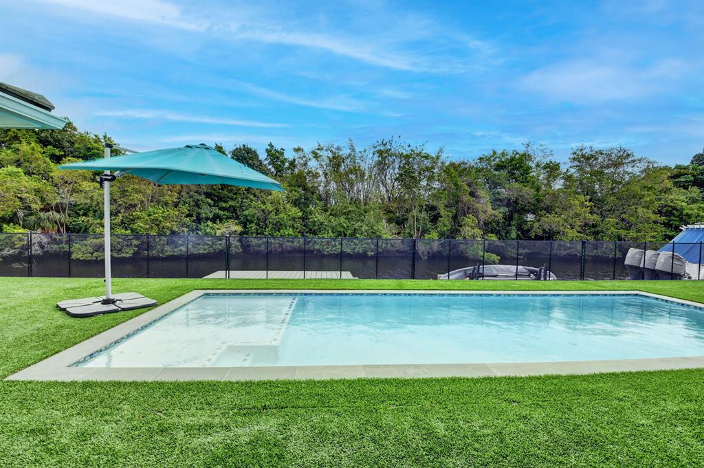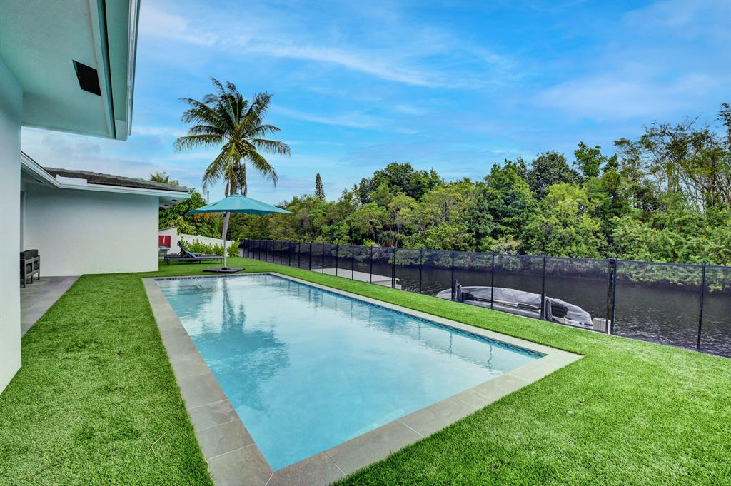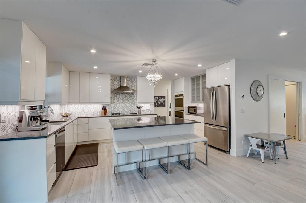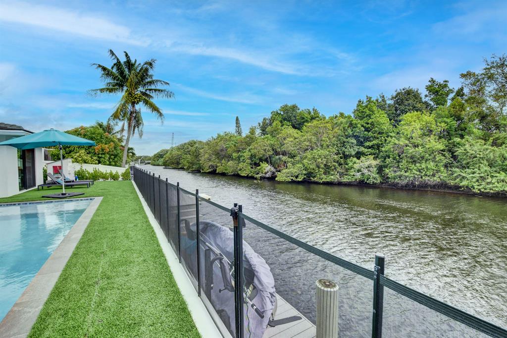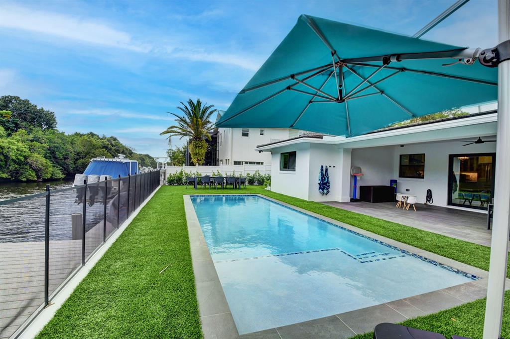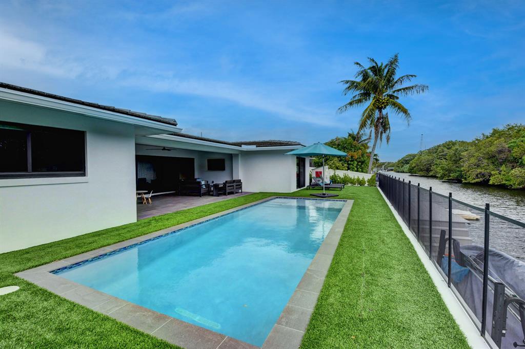Completely customized and rebuilt in 2019, you will fall in love from the moment you walk into this open, light, bright, modern home. This 4/3.5 plus den pool home overlooks the El Rio waterway that leads to ocean access. The new approximate 40 foot composite dock with a raised, reinforced retaining wall is perfect for any boater. The nature preserve across the waterway provides privacy, as well as, attracts lots of birds and wildlife to enjoy watching from your backyard or large covered patio. The island kitchen offers European white cabinetry to the ceiling with soft close and glass doors, quartz countertops with a marble backsplash. The floor plan is a 3-way split with the master bedroom on the back of the house overlooking the waterway.