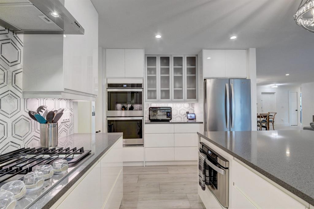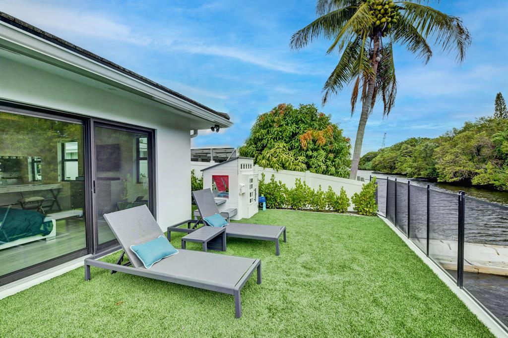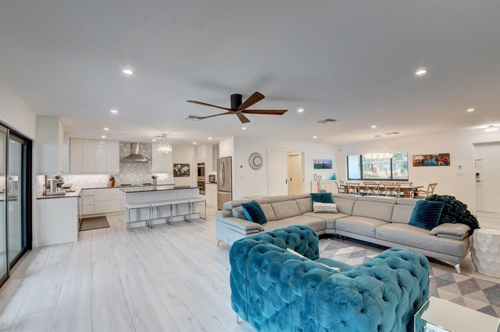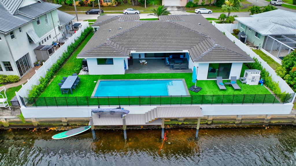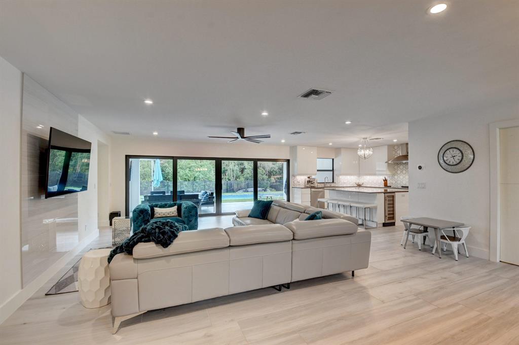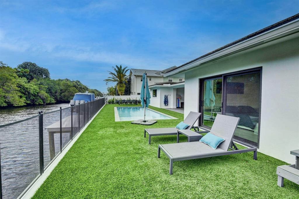 Completely customized and rebuilt in 2019, you will fall in love from the moment you walk into this open, light, bright, modern home. This 4/3.5 plus den pool home overlooks the El Rio waterway that leads to ocean access. The new approximate 40 foot composite dock with a raised, reinforced retaining wall is perfect for any boater. The nature preserve across the waterway provides privacy, as well as, attracts lots of birds and wildlife to enjoy watching from your backyard or large covered patio. The island kitchen offers European white cabinetry to the ceiling with soft close and glass doors, quartz countertops with a marble backsplash. The floor plan is a 3-way split with the master bedroom on the back of the house overlooking the waterway.