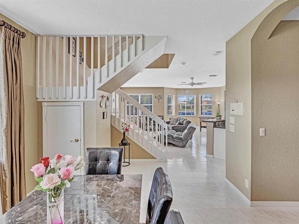 Outstanding LAKEFRONT Contemporary FIVE BEDROOM -FOUR BATH pool home set on a quiet interior lot with peaceful water view. RARE, expanded Dorchester V model pushed out the family room and master suite to give you 112 sq ft of additional living space. From the moment you walk through the double front entry doors, you're going to love this home! Inside you'll find tasteful decor, volume ceilings, solid core doors, arched & transom windows, attractive lighting fixtures & fans. Kitchen is a chef's delight & perfect for entertaining with its attractive granite buffet/snack bar. Kitchen was updated with tumble stone back splash, extra deep & wide stainless sink, Euro faucet and granite counter tops. Note: windows have accordion shutters. For a detailed description of home & community, click her