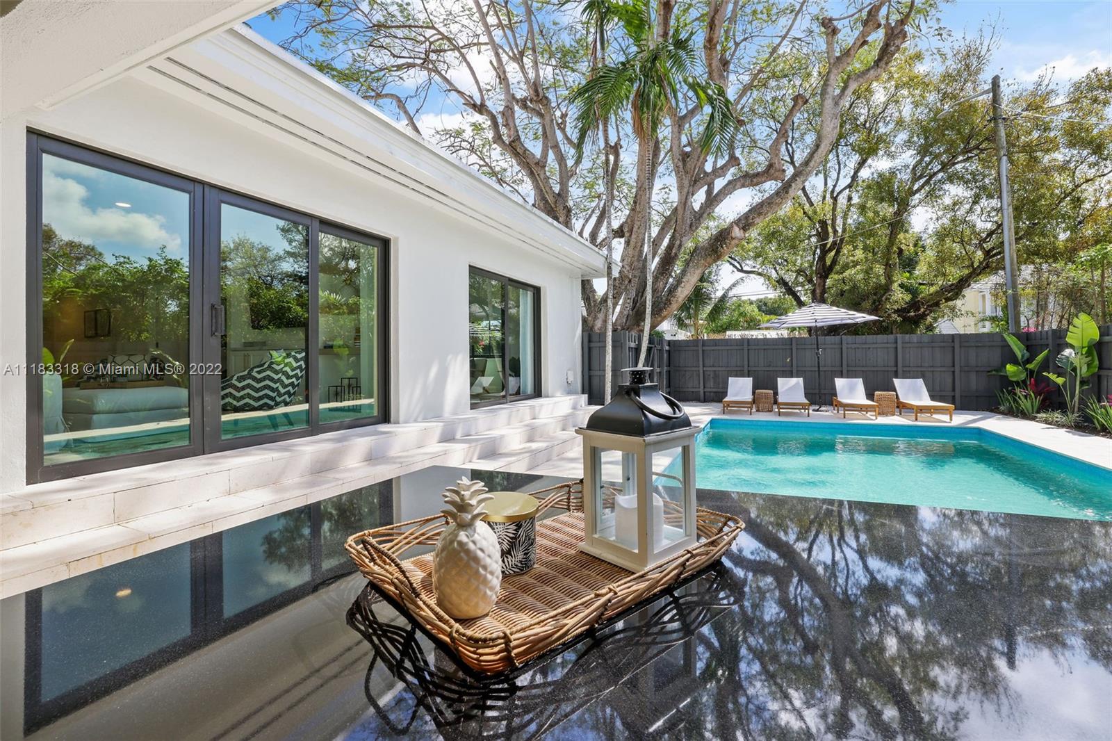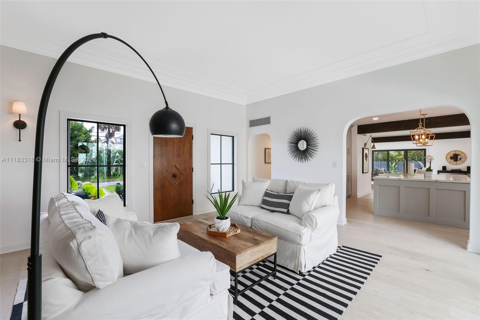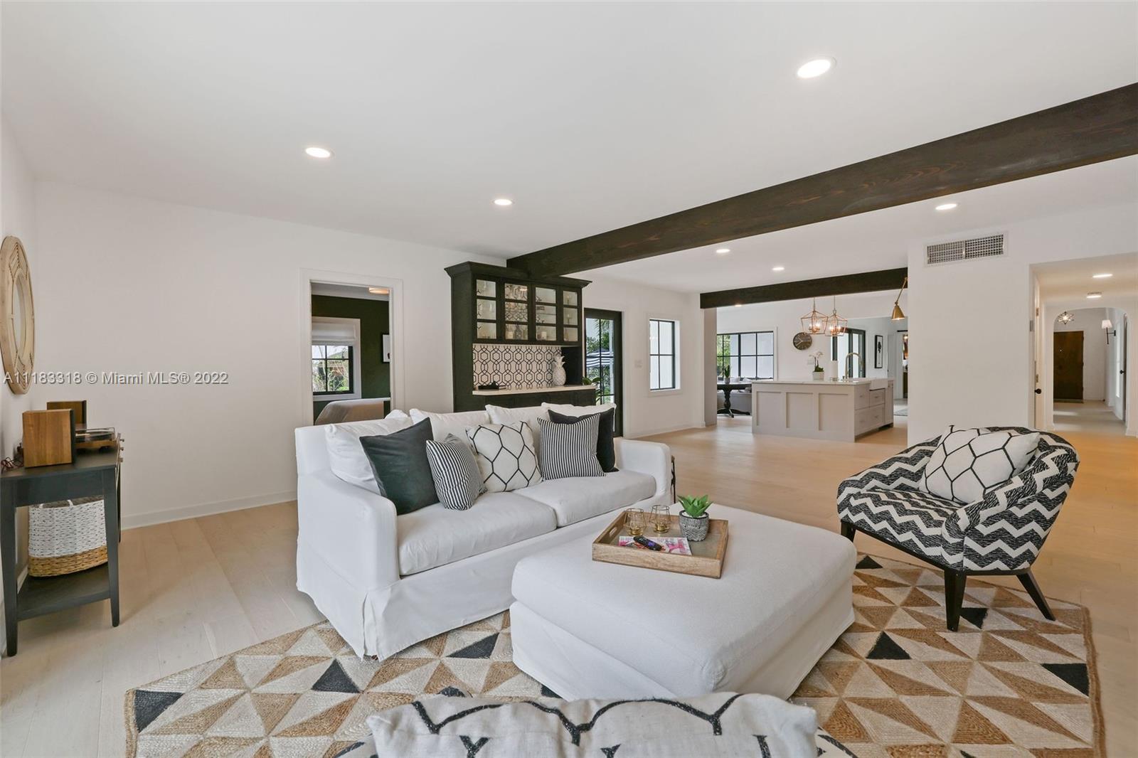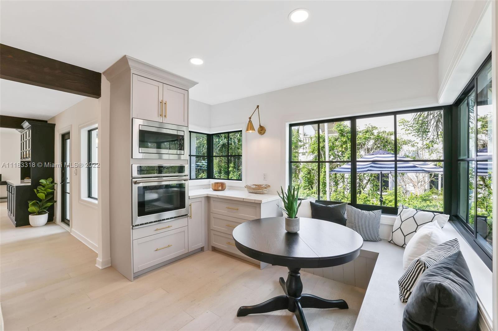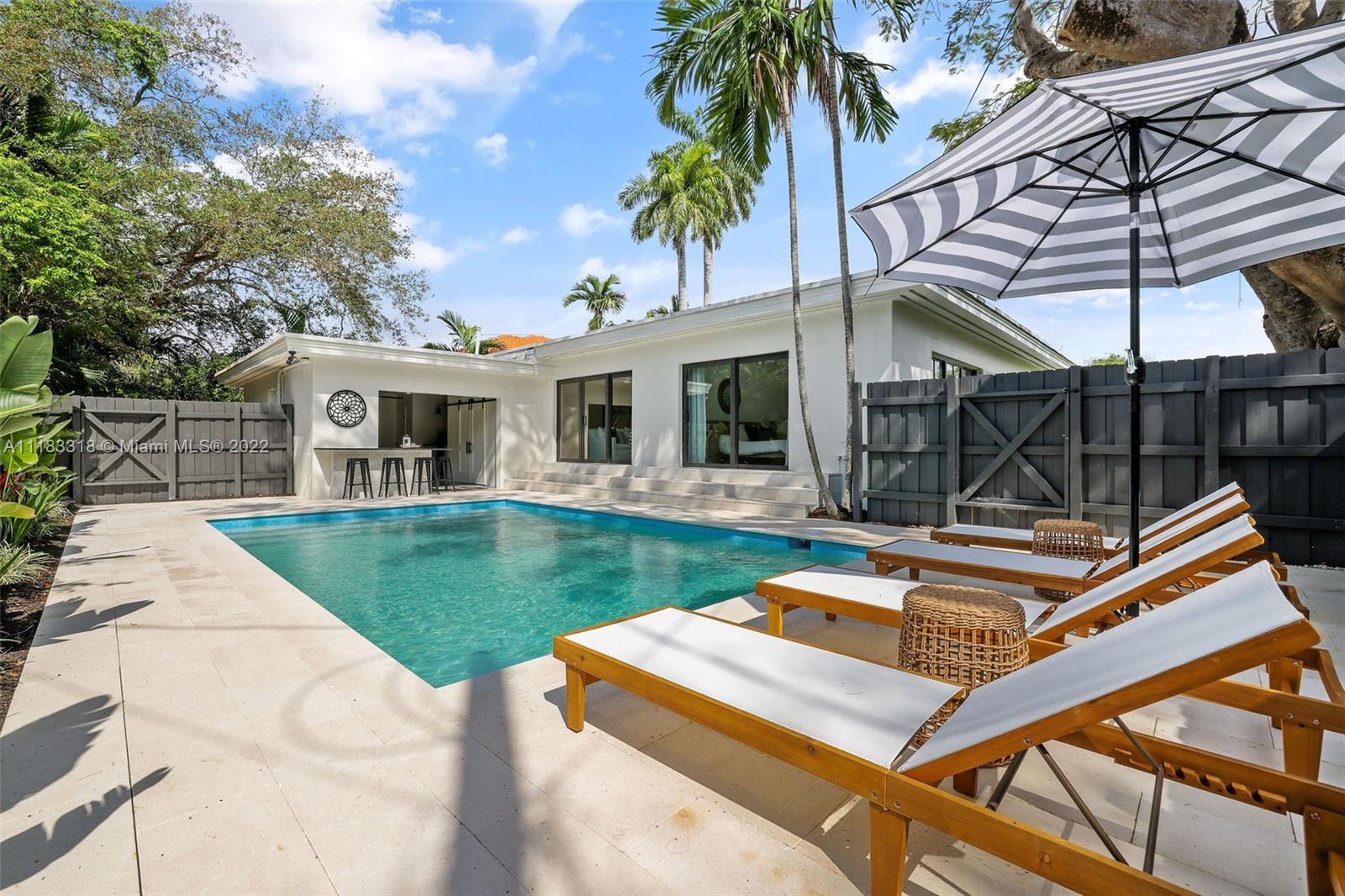 Fall in love with this stunning 4 BD 3.5 BA, 2757 SF home east of Biscayne Boulevard in exclusive Miami Shores. Completely renovated, thoughtfully curated & impeccably furnished, with furniture included in price! Amazing open floor plan with high ceilings & very spacious living areas with multiple built-in features. The beautiful kitchen is perfectly situated in the heart of the home with a massive calacatta island & custom built-in breakfast nook. Enjoy views to your brand new pool from your resort style Master Suite with custom walk-in closet. The Master Spa-Bath has a curbless shower & a his and hers sink vanity. Sip your mimosa & entertain poolside in your covered cabana. New impact windows, new plumbing, new AC, gas stove & water heater, custom laundry room & much more!