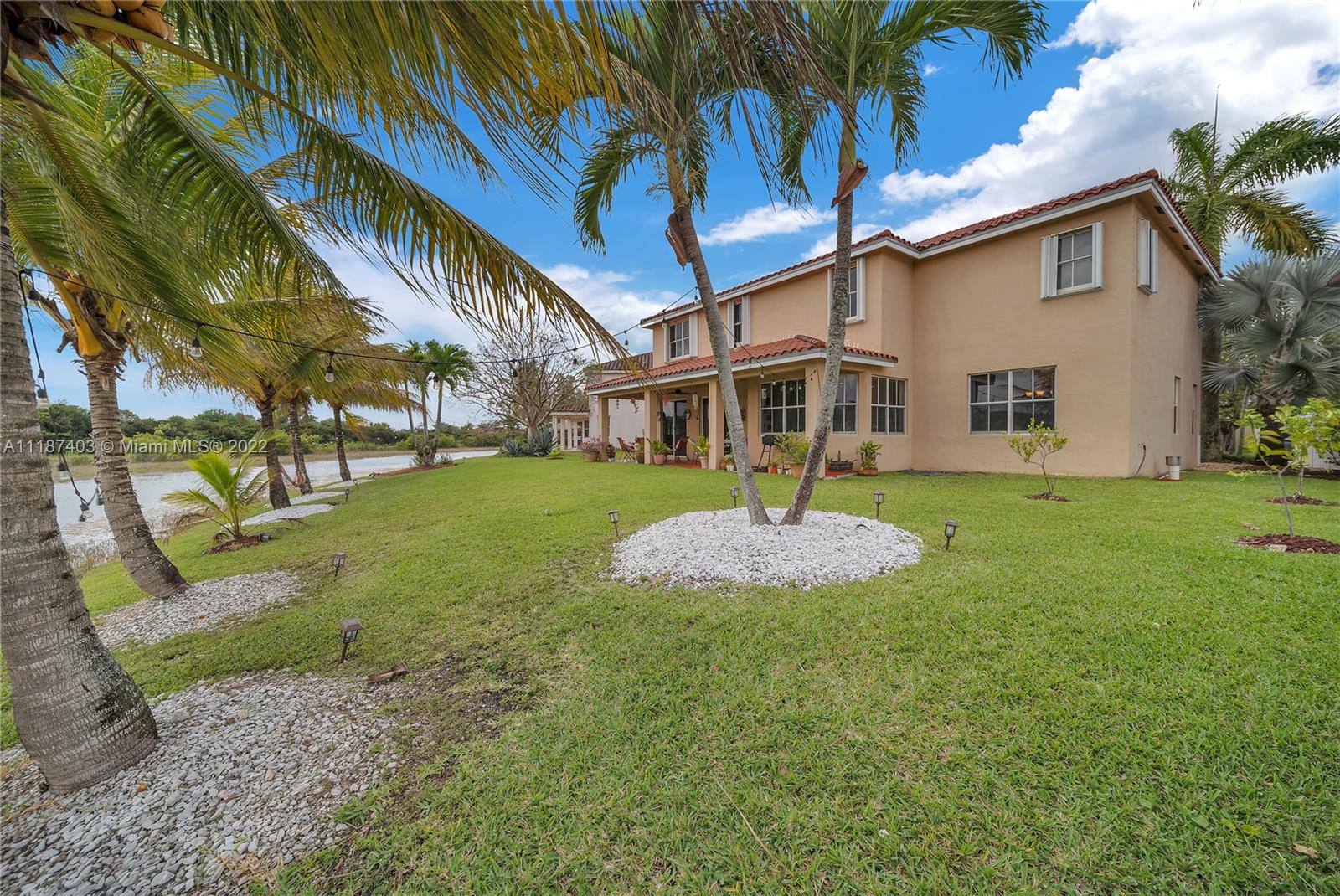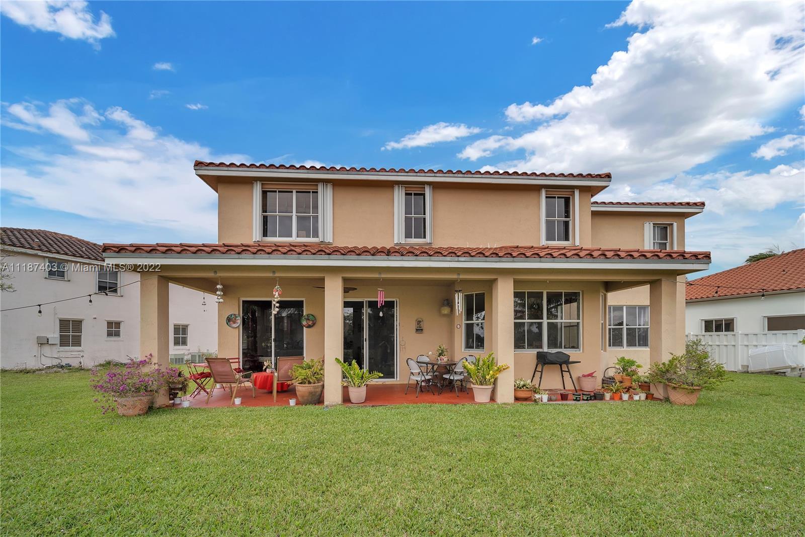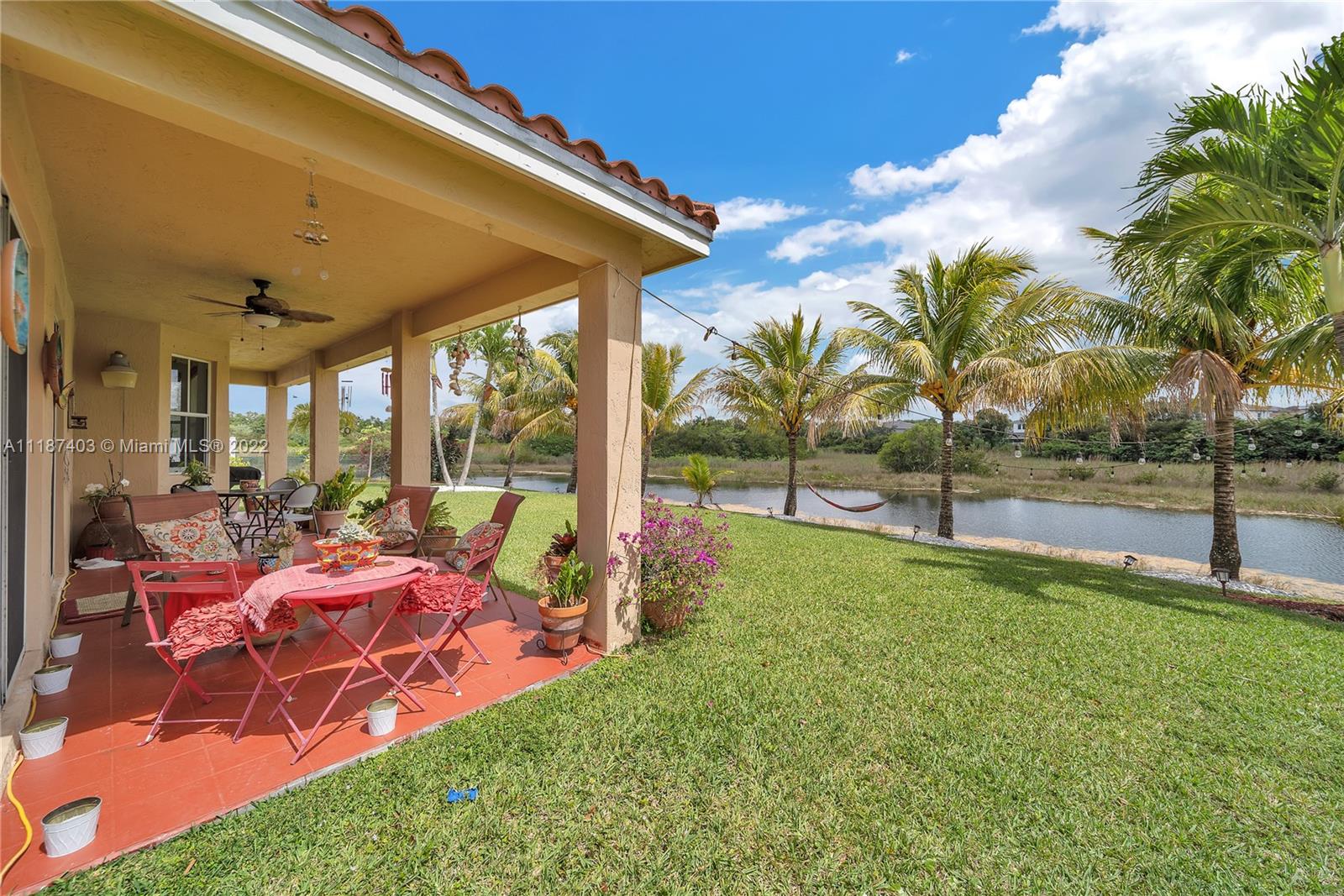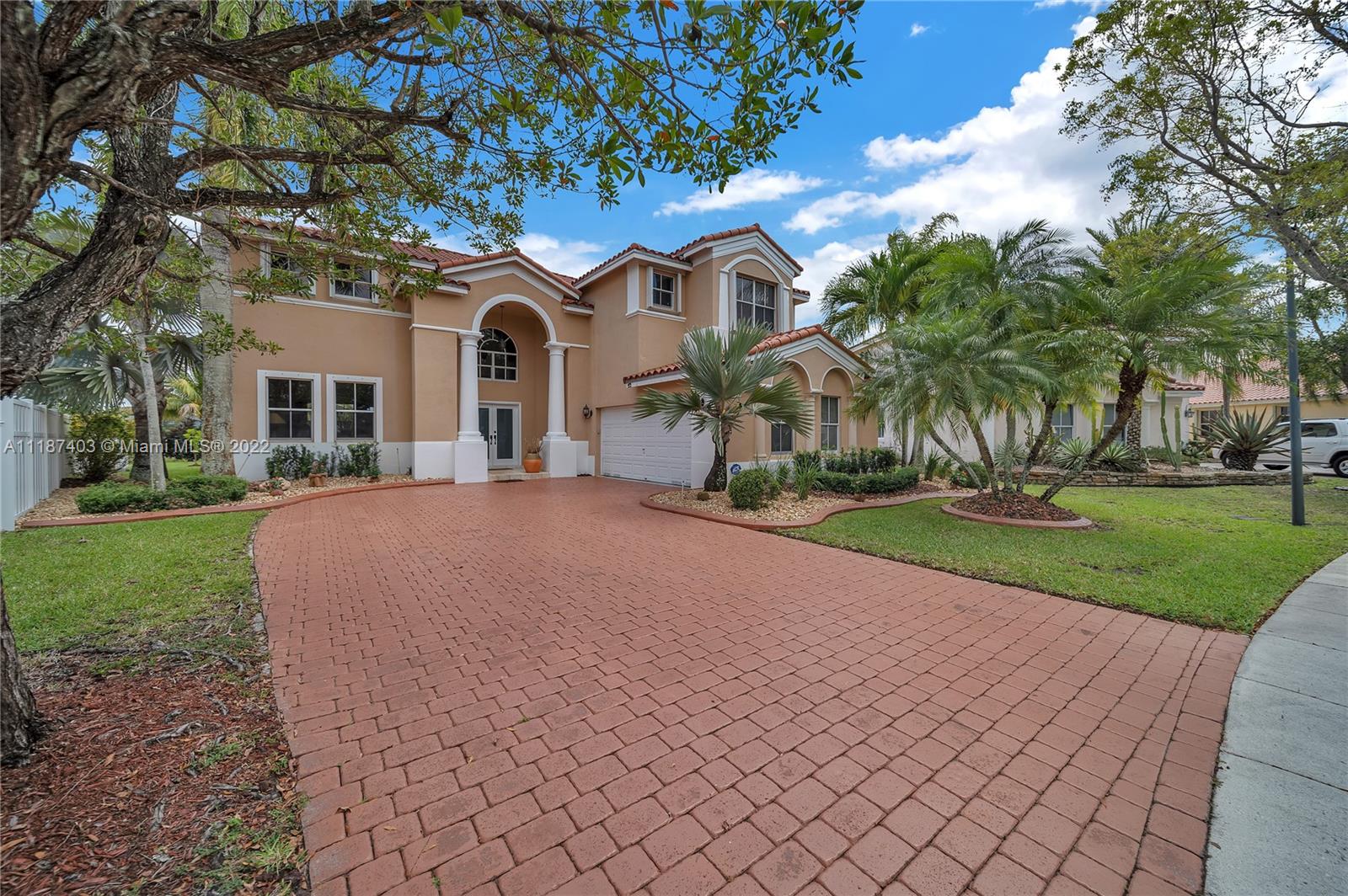 A large tropical oasis located in the center of Miramar, this sizable single-family home is located in the beautifully manicured and quiet neighborhood of Tahiti Isle at Nautica. Built in 2000 with two floors of 3,670 livable sq. ft., this home boasts 5 large bedrooms with 4 full baths, tons of closet space, beautiful stone tiles on the ground floor, and laminate wood in the bedrooms, and has wide-open spaces for entertaining. Hurricane accordian shutters throughout, modern interior with dramatic vaulted ceilings, bright and open living room and kitchen. A quaint breakfast nook leads to an open-air porch overlooking a scenic waterway, and is surrounded by greenery facing a protected bird sanctuary. The neighborhood features 24/7 gated security, gym, tennis & basketball courts, & more!