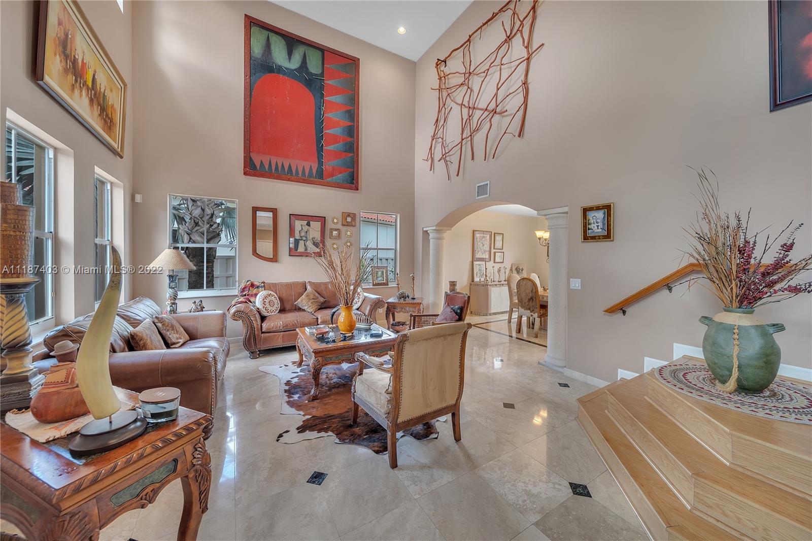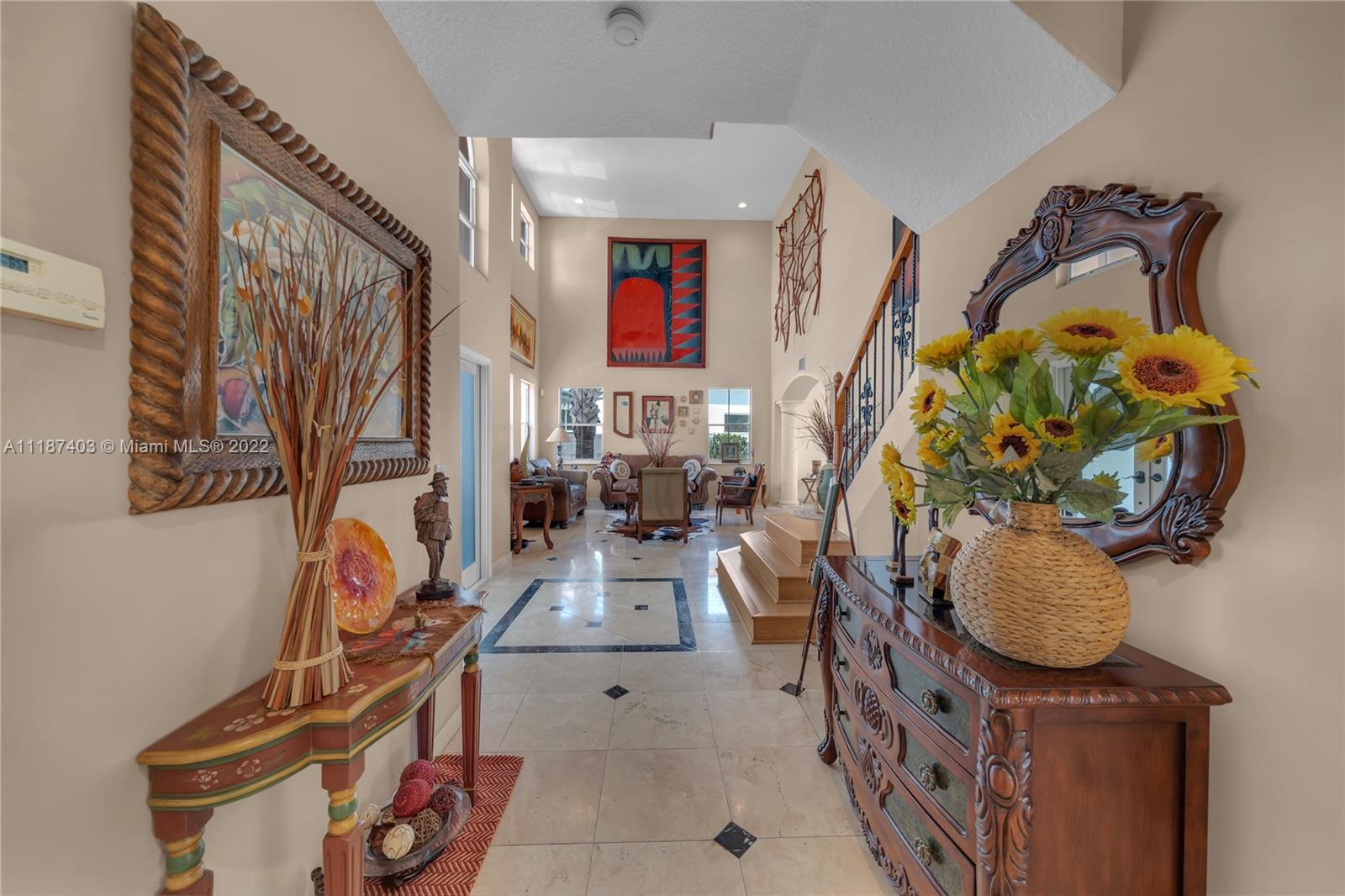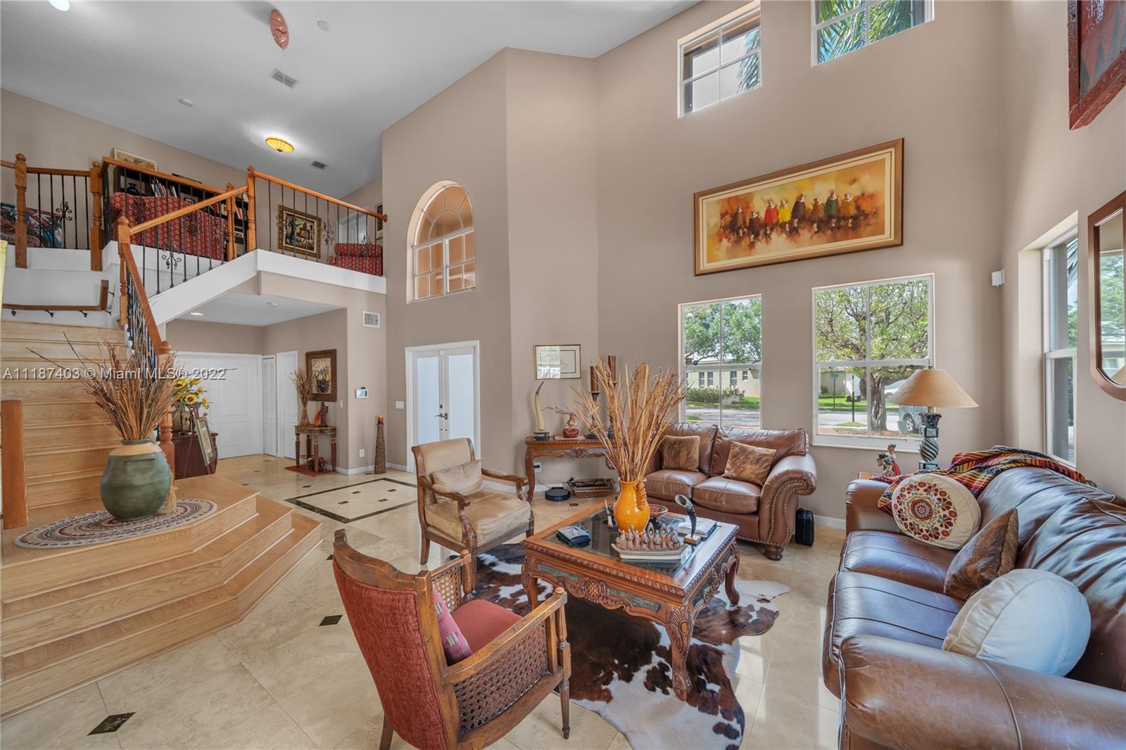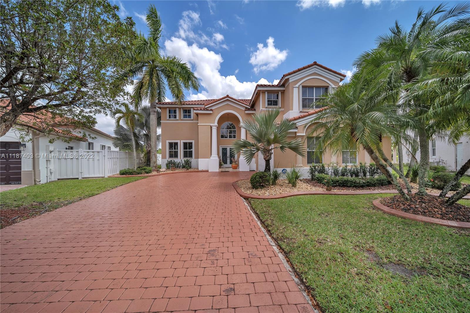 A large tropical oasis located in the center of Miramar, this sizable single-family home is located in the beautifully manicured and quiet neighborhood of Tahiti Isle at Nautica. Built in 2000 with two floors of 3,670 livable sq. ft., this home boasts 5 large bedrooms with 4 full baths, tons of closet space, beautiful stone tiles on the ground floor, and laminate wood in the bedrooms, and has wide-open spaces for entertaining. Hurricane accordian shutters throughout, modern interior with dramatic vaulted ceilings, bright and open living room and kitchen. A quaint breakfast nook leads to an open-air porch overlooking a scenic waterway, and is surrounded by greenery facing a protected bird sanctuary. The neighborhood features 24/7 gated security, gym, tennis & basketball courts, & more!
