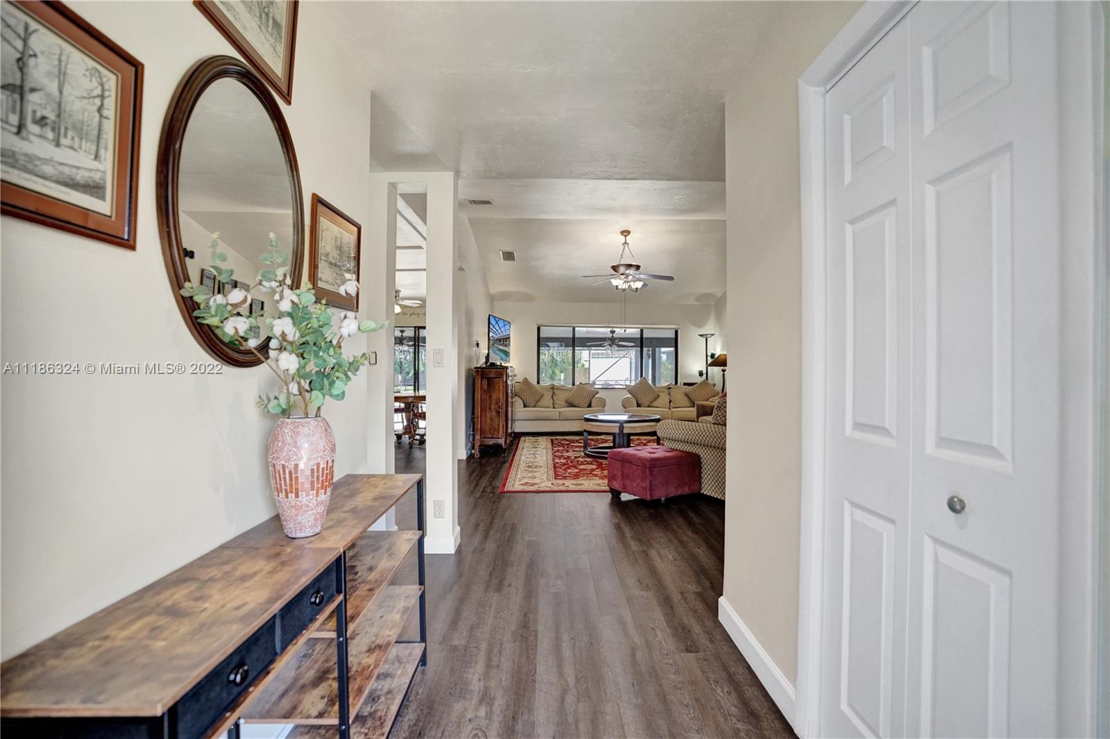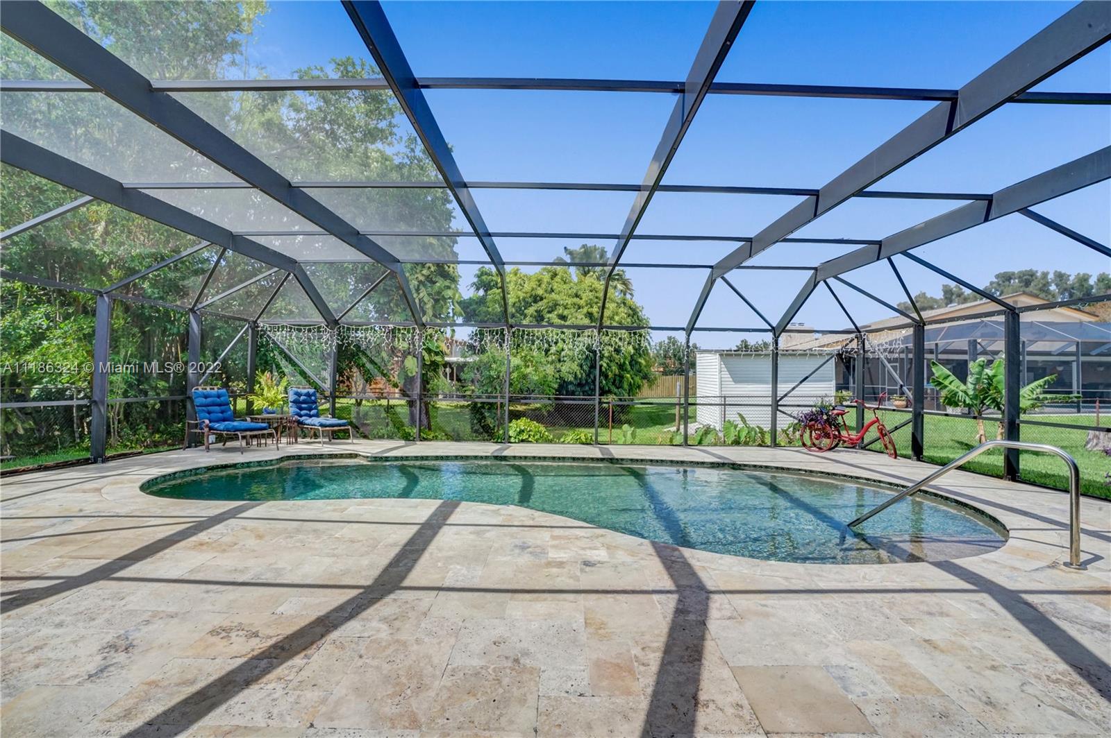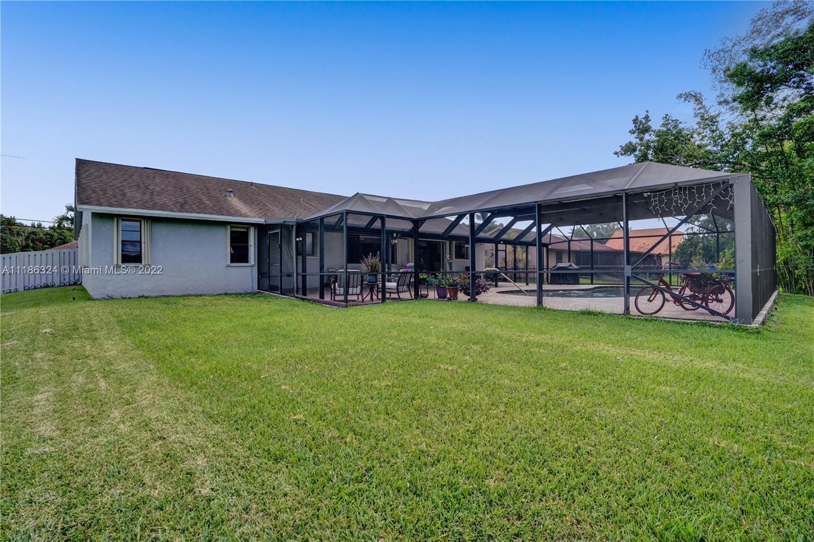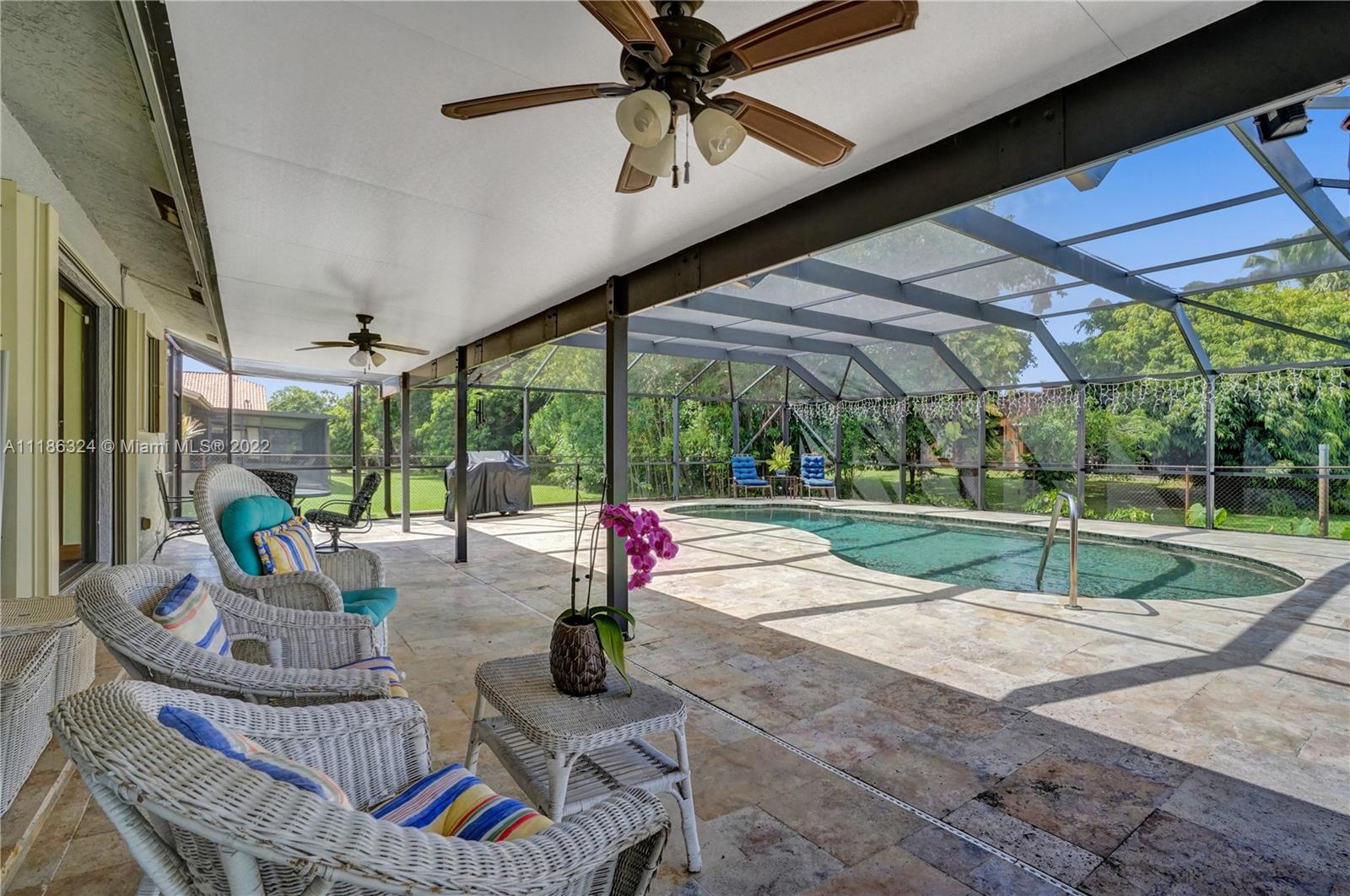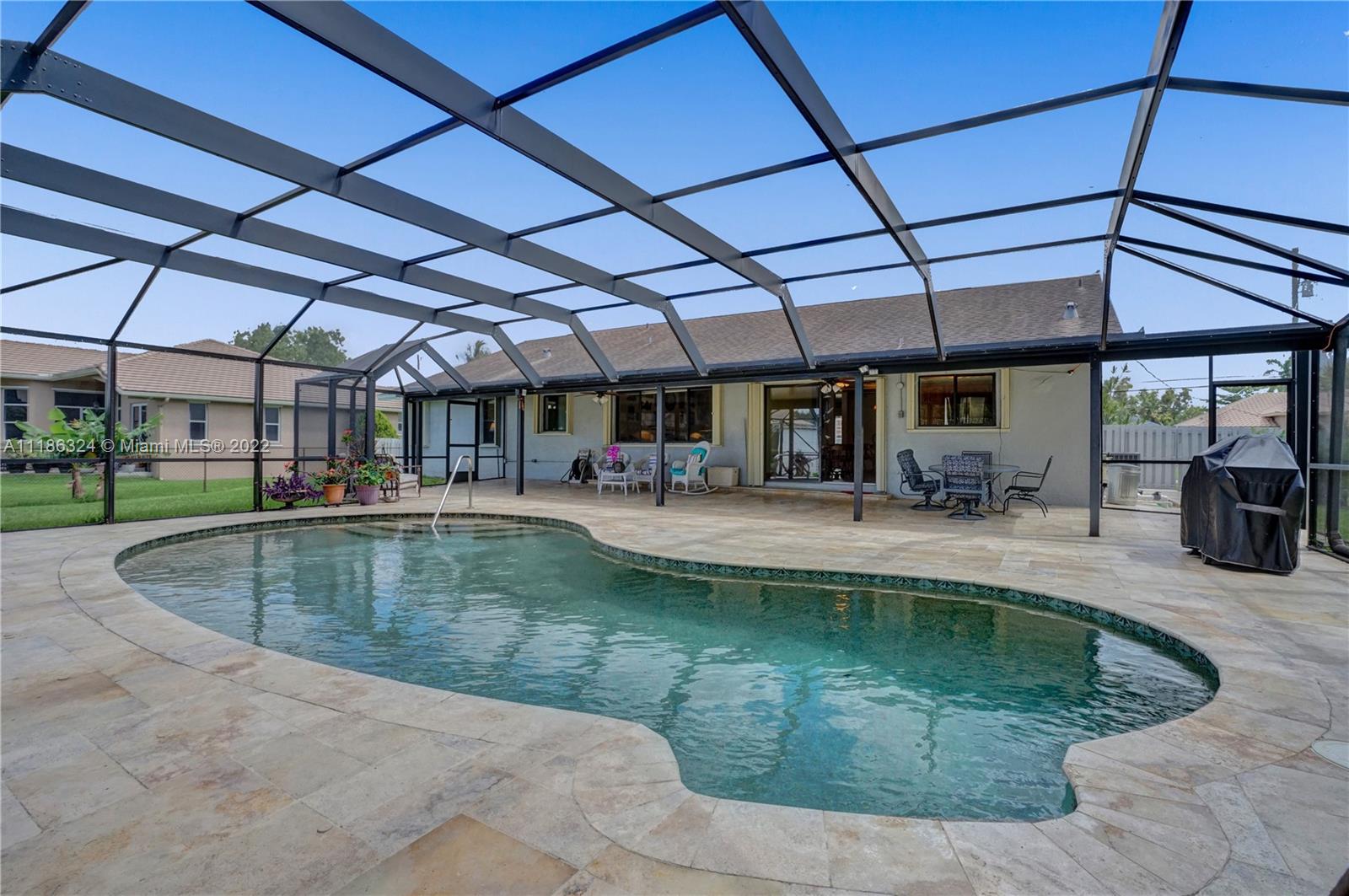 Welcome to this 4-BR/2-Bath impeccably maintained pool home on nearly 1/3 of an acre located in the sought-after equestrian neighborhood of Plantation Acres. Features include vaulted ceilings, an updated kitchen w/new appliances, breakfast area, updated bathrooms, wood laminate flooring throughout, separate formal dining and living room. The primary bedroom suite has a walk-in closet with built-ins. Hurricane shutters throughout, impact garage door, oversized two-car garage w/separate laundry area. Great for entertaining! Plenty of room to enjoy the amazing outdoor space w/expansive covered lanai, travertine patio, screened-in salt-water pool & a huge fenced backyard. Minutes to the Equestrian Center, Volunteer Park, Sawgrass Mills Mall, highways and more! NO HOA! This home is a Must See!