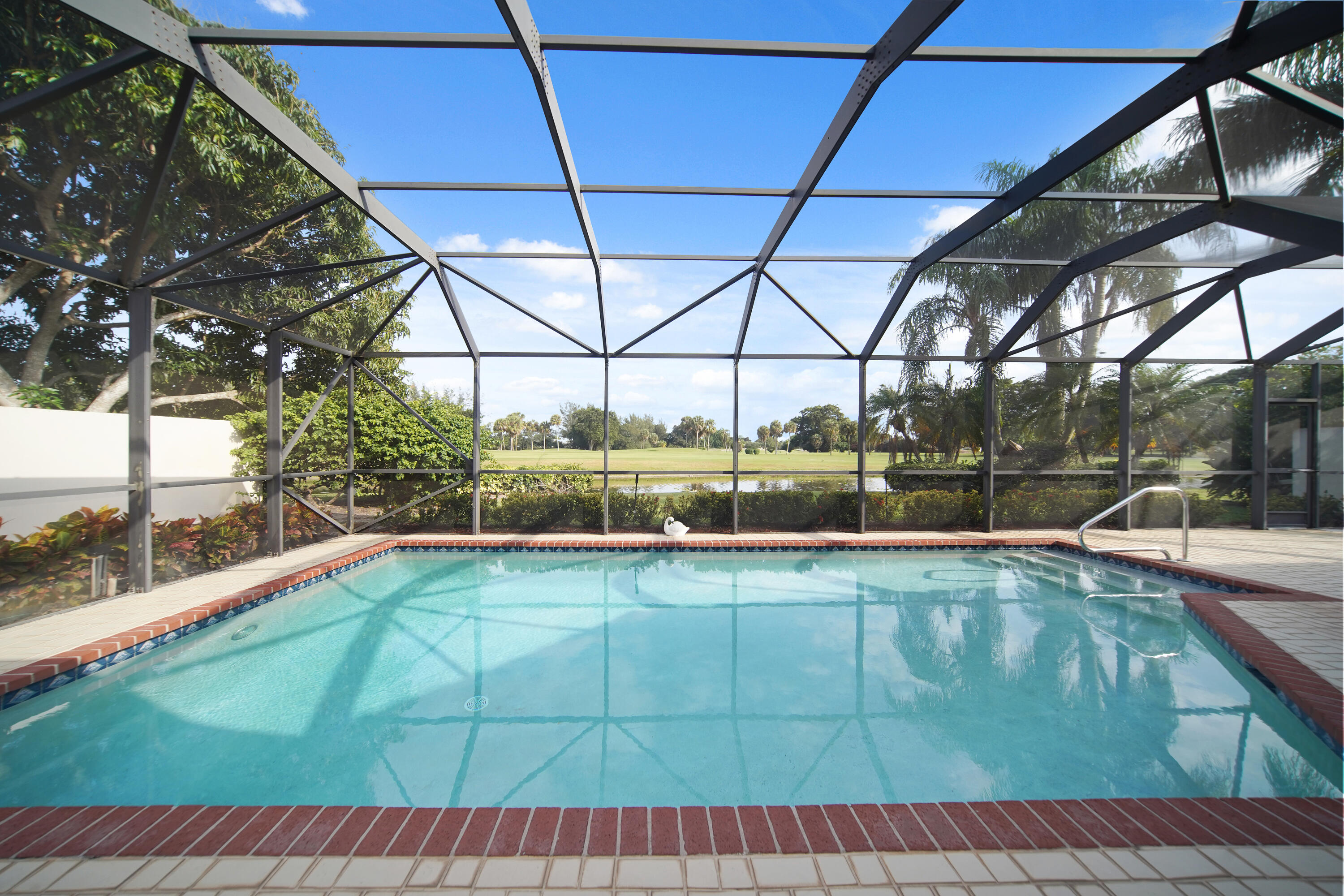 Exquisite newly renovated centrally located home with incredible water views. Brand new kitchen and bathrooms with top of the line appliances and fixtures. Fabulous kitchen includes contemporary high gloss white custom cabinetry, quartz countertops, stainless steel appliances, wine cooler and breakfast bar open to the family room. This home overlooks a triple fairway view and is separated by beautiful water and golf views. The private fenced courtyard has been renovated with travertine marble and is perfect for pets or children. The screened heated pool is immaculately maintained. Boca Greens is the most affordable guard gated community in the area and has no mandatory membership. A real must see, this home boasts high end quality, very low HOA fees, fast fiber optic internet and cable..