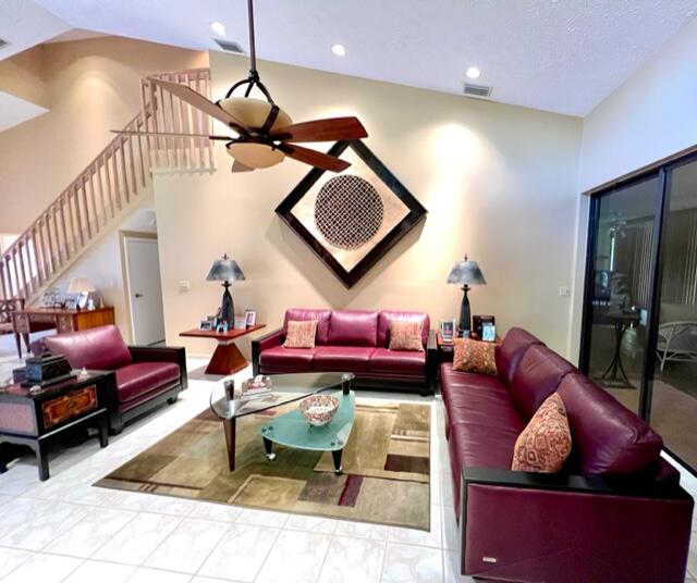 Offering a beautifully maintained spacious two bedroom, three full bath corner unit with a den and an air-conditioned finished patio in the Meridiana community at Boca Pointe. Master suite is located downstairs with a second bedroom upstairs both equipped with generous walk-in closets. Vaulted ceilings create a wide-opened feel in the great room with plenty of natural lighting throughout. Offered partially furnished. Boca Pointe is located just outside the city limits of Boca Raton, in southern most Palm Beach Co, FL. It includes the Club at Boca Pointe, Boardwalk at SW 18th Street, and over 4k residences within 29 diversified Villages. Optional memberships include the 18 hole championship golf course at The Club at Boca Point as well as social or tennis/fitness memberships.
