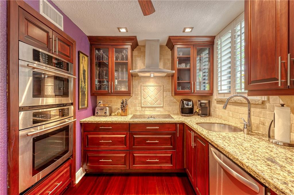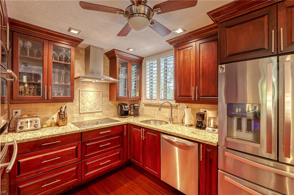 Natural light pours into this wonderful Victoria Park townhome - originally 3 bedrooms / 2.5 baths. The 3rd bedroom now opens up at the top of the stairs for a comfortable den / office area. Plantation shutters throughout. Lots of outdoor spaces with a balcony off the living room, an elevated deck, and a patio on the ground level. Home has all impact windows, sliding doors, and garage door. Kitchen with convection oven, wine cooler, Jenn-Air: hood, ovens, and cook top. Association put on new roofs in 2018. Townhouse has new AC system and hot water heater both in 2019. This unit is "outside the gate" which means the owner can park 2 cars in the driveway, in addition to the 2 car garage. Bring your two pets and enjoy the good life here!