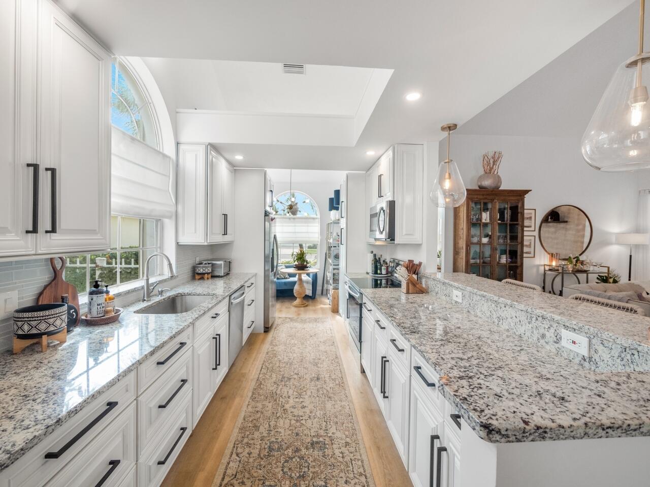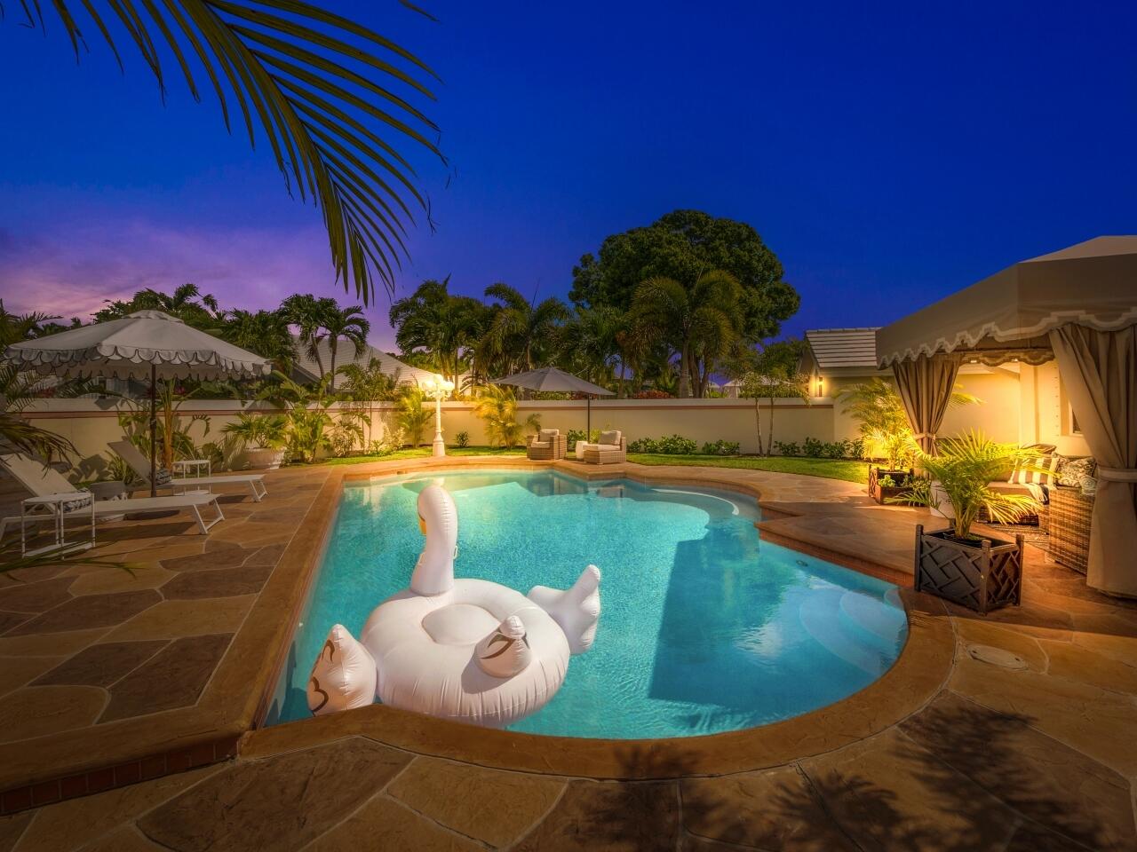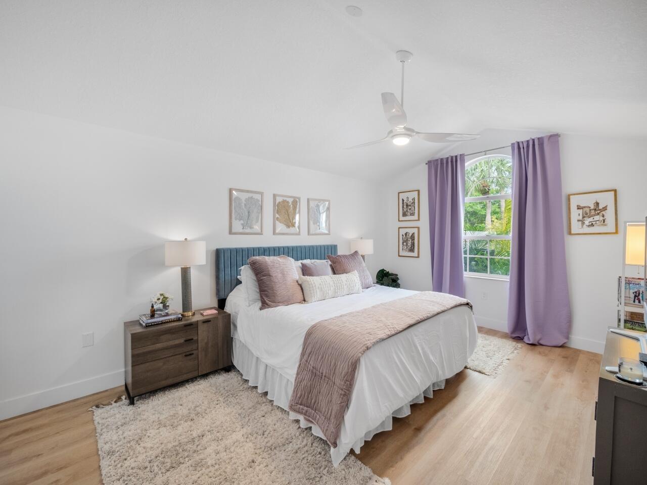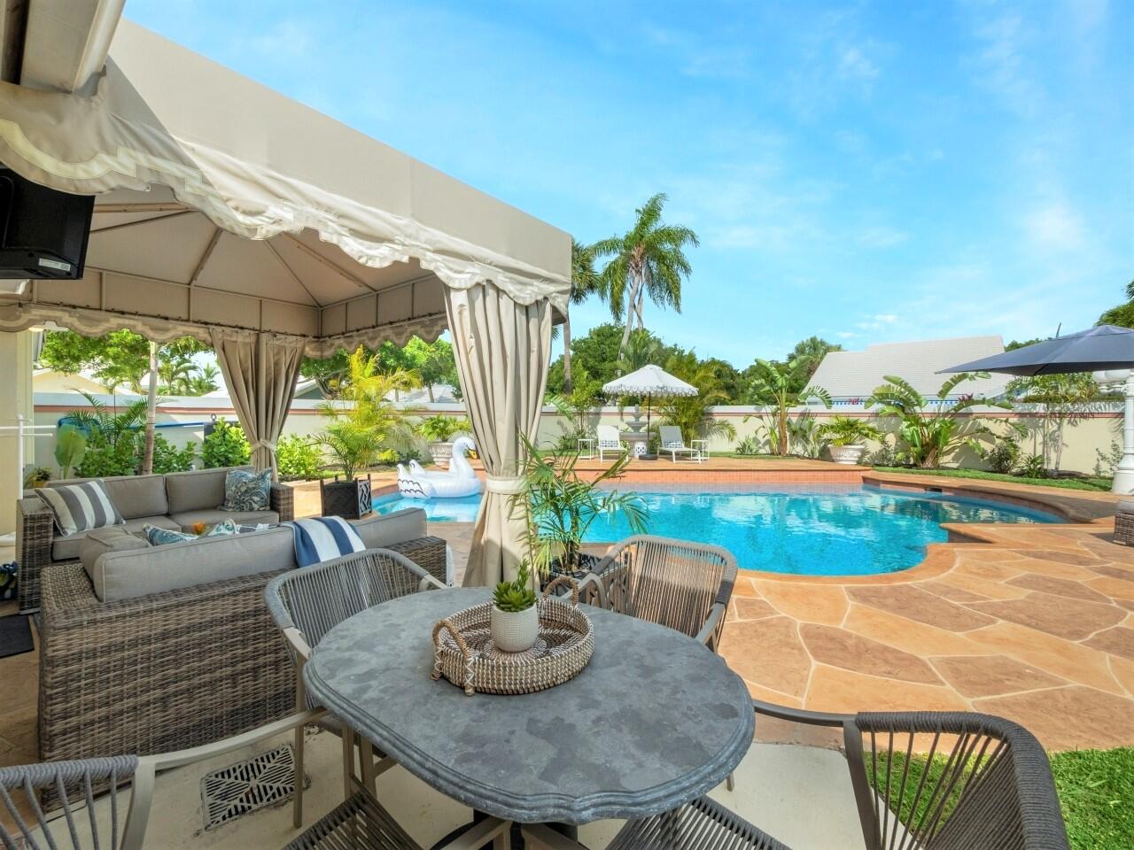 No detail has been overlooked in this absolutely stunning renovated pool home owned by an interior designer. Close to downtown, Rosemary Square, and the restaurants and shops of Palm Beach, and minutes to the ocean. The entire home has been reimagined from its original floor plan. This heated pool home sits on a large corner lot in the desirable gated golf course community of Bear Island. This is the Saratoga model, the larger of the two models in Bear Island, with 2271 square feet under air. The home is bright and light with 3 BRs, 2 baths, plus an office with split floor plan. White oak luxury vinyl plank flooring, all new designer transitional light fixtures, new baseboards and 5 panel custom doors throughout set the tone for the home. The living