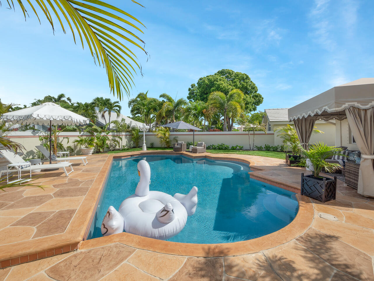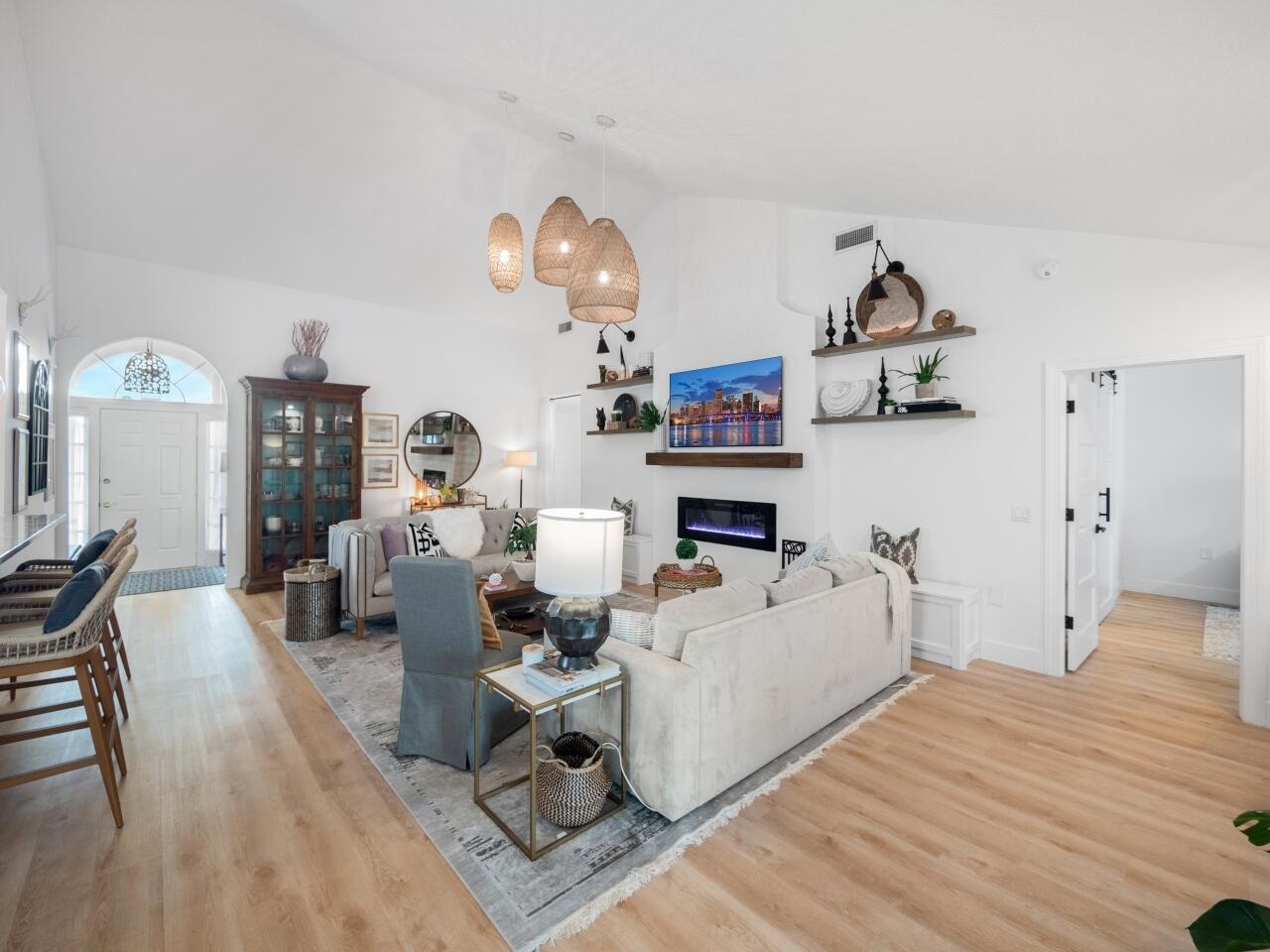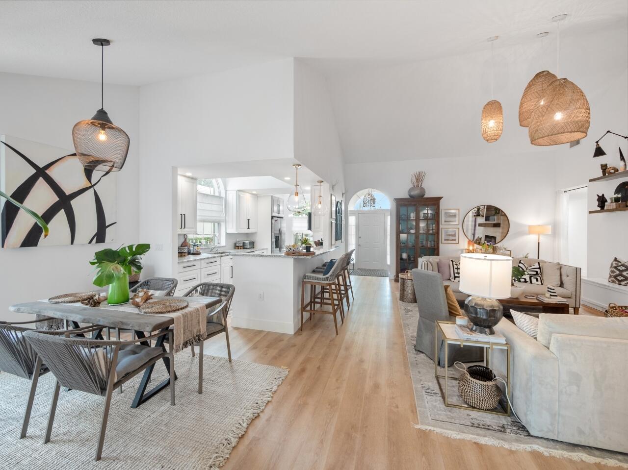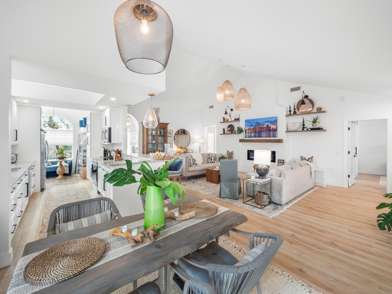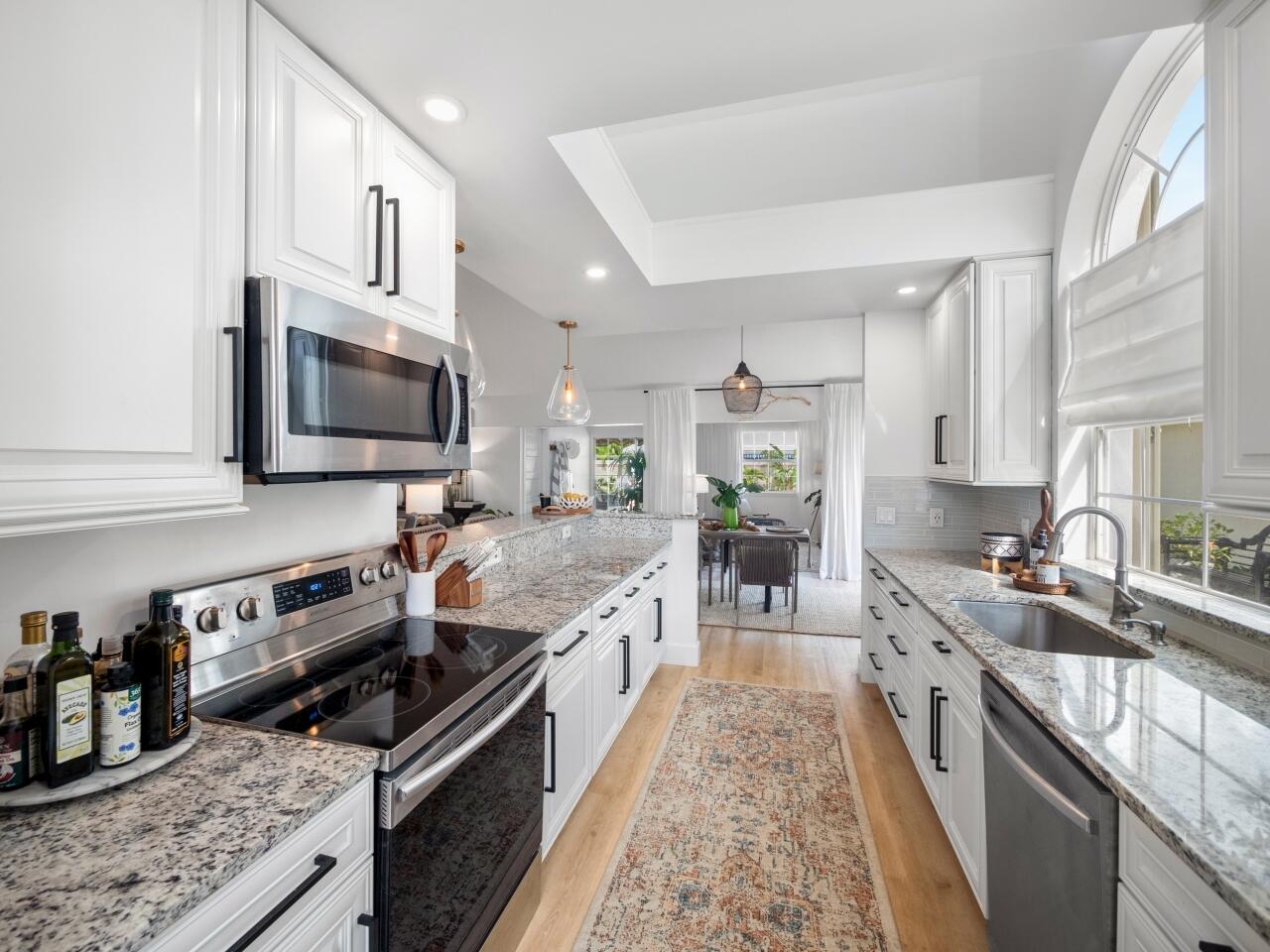 No detail has been overlooked in this absolutely stunning renovated pool home owned by an interior designer. Close to downtown, Rosemary Square, and the restaurants and shops of Palm Beach, and minutes to the ocean. The entire home has been reimagined from its original floor plan. This heated pool home sits on a large corner lot in the desirable gated golf course community of Bear Island. This is the Saratoga model, the larger of the two models in Bear Island, with 2271 square feet under air. The home is bright and light with 3 BRs, 2 baths, plus an office with split floor plan. White oak luxury vinyl plank flooring, all new designer transitional light fixtures, new baseboards and 5 panel custom doors throughout set the tone for the home. The living