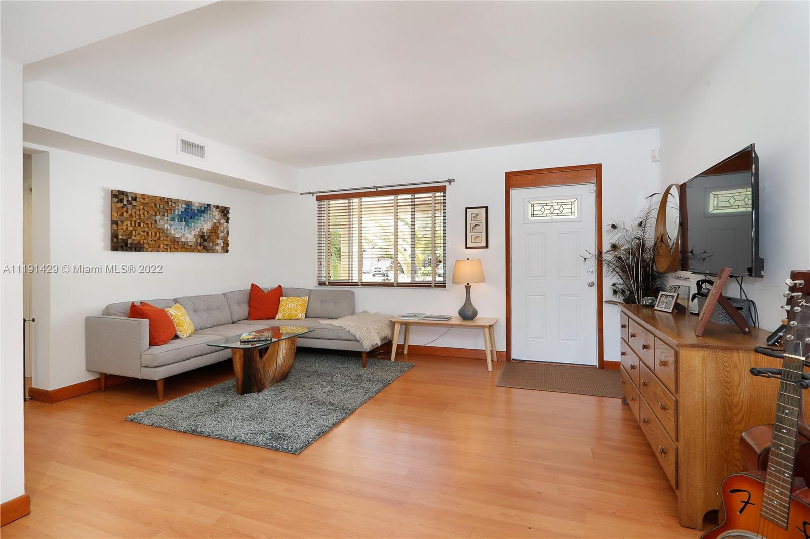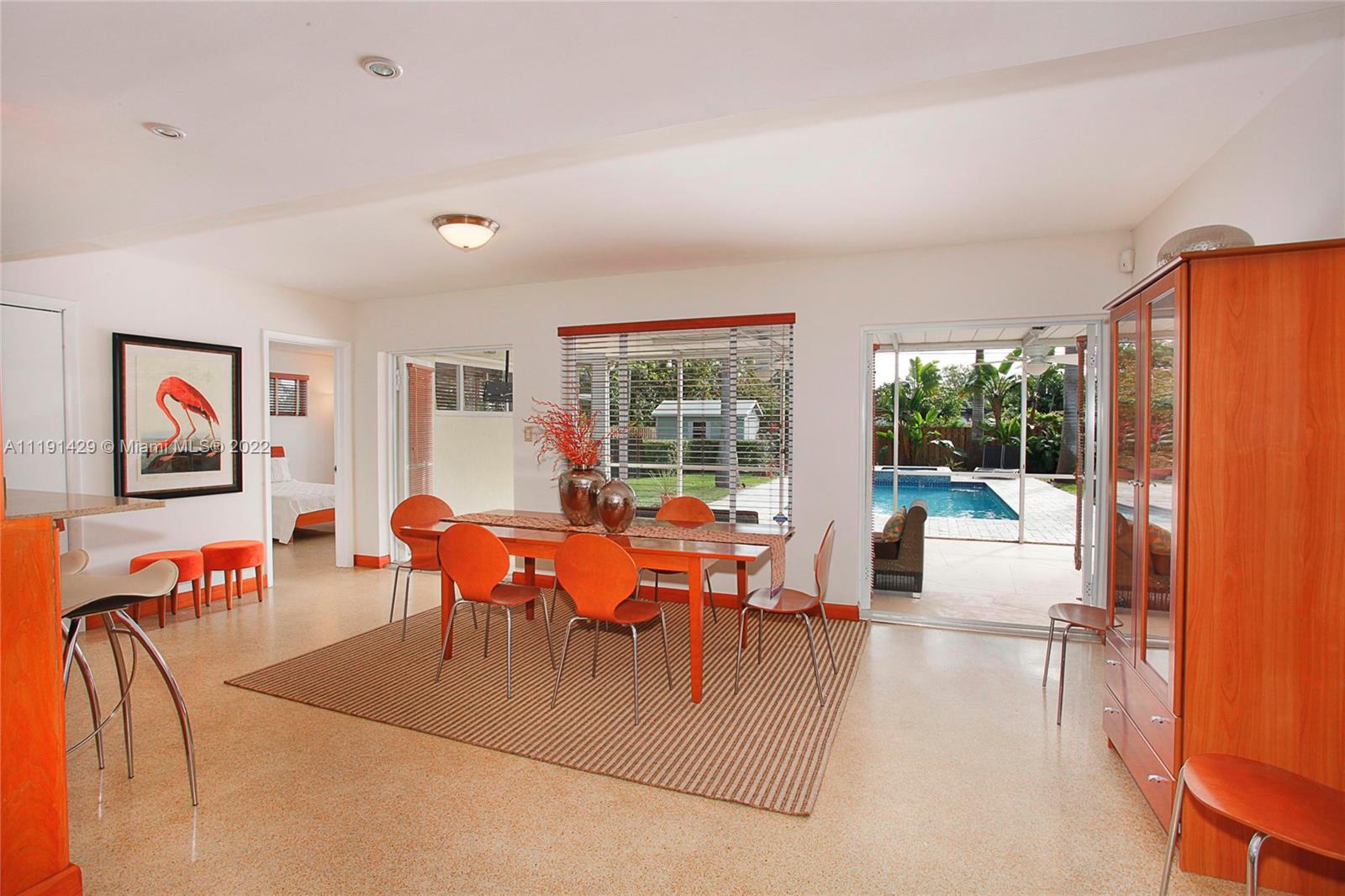 Fabulous mid-century modern home with clean, simple lines designed to embrace the fabulous outdoor living spaces and show stopping pool. Great room with open kitchen, counter seating, newer appliances. Wall of doors and windows to screened, covered terrace and pool. Restored terrazzo in dining room and primary bedroom suite. Nicely sized master BR w/ribbon windows on north side adding perfect mid-mod detail. Vaulted ceilings in secondary bedrooms. Renovated baths. Walk-in, heated pool with fountains, spa, tumbled travertine patio. Air conditioned laundry room, attached carport, tankless hot water heater, new AC 2021. Spacious, welcoming front porch, circular driveway with pavers. Nicely landscaped with native plantings & mature trees. Centrally located in South Miami on 10,578 SF lot!
