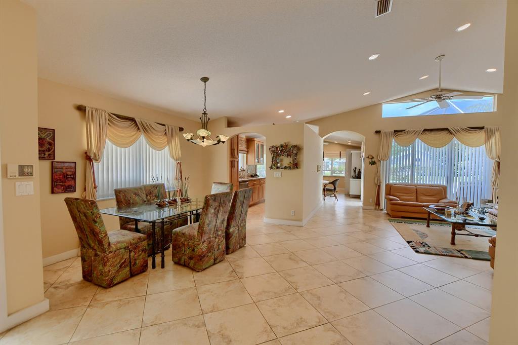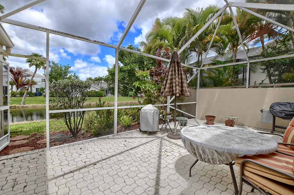 Lovingly maintained one story single family home available now in popular Palms at Boca Pointe. Enjoy the peaceful lake views from the screened in patio. Spacious floor plan with living room plus den off kitchen area. Kitchen updated with wood cabinets, granite counters, stainless steel appliances, and mosaic tile backsplash. Large master bedroom with huge walk in custom fitted closet and sliders to go out to patio. Master bath updated with replaced cabinet with double sinks, spa tub and updated shower. Accordion hurricane shutters throughout! Roof approximately 12 years old. Other features include tile floors through out home, custom closets, A/C 2015, easy access to backyard. Community has pool and 24 hour manned gate. Country club membership available, but not mandatory.