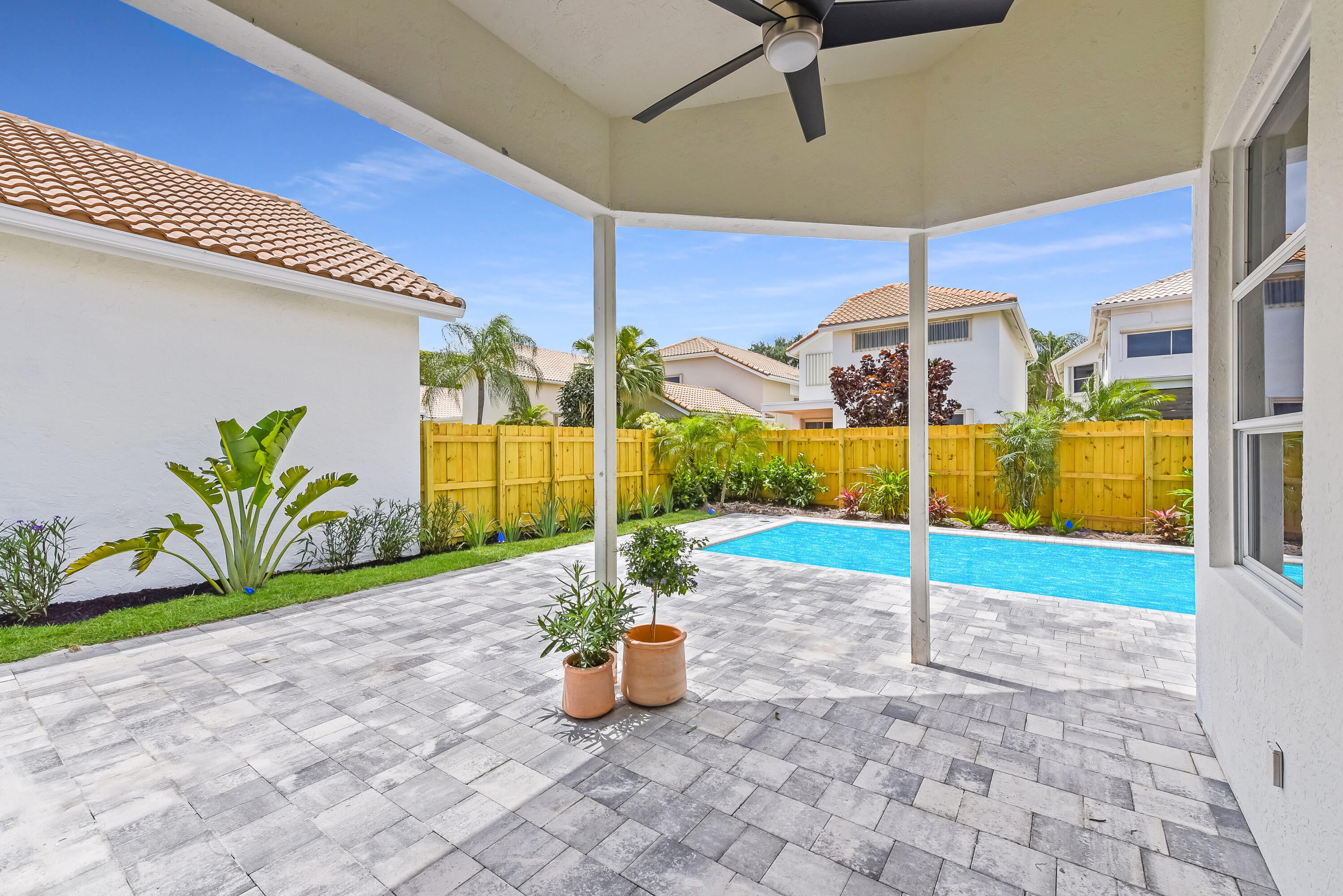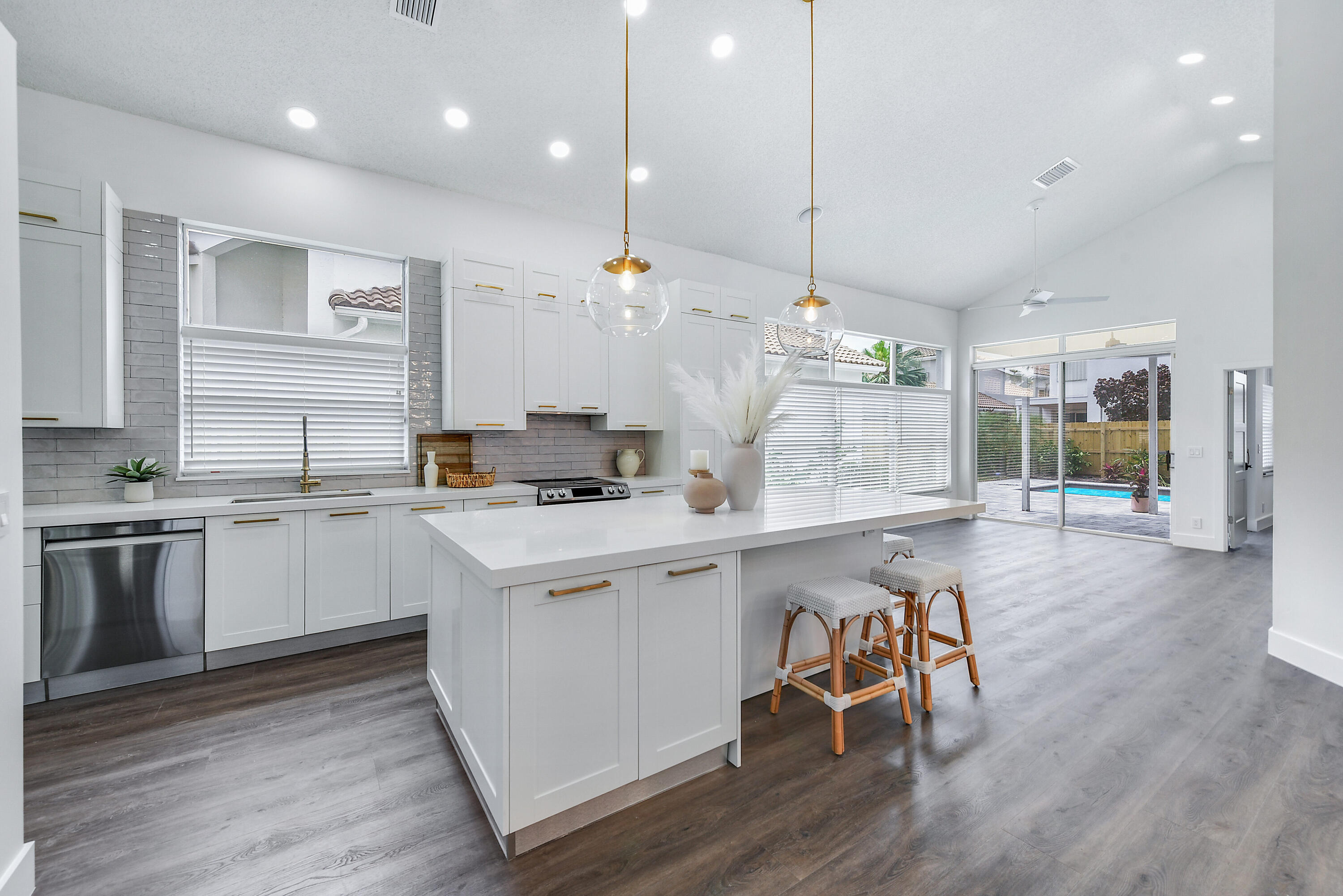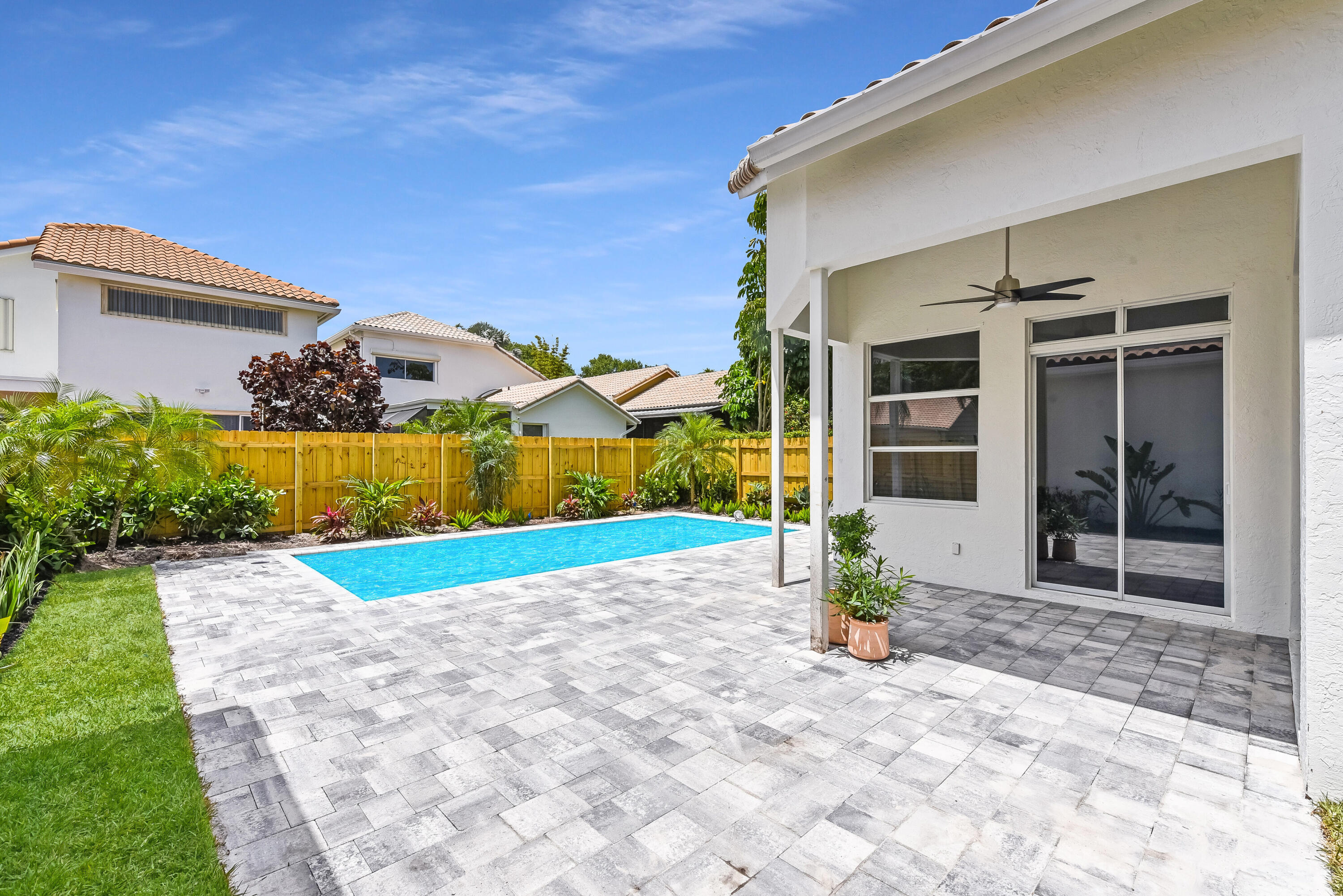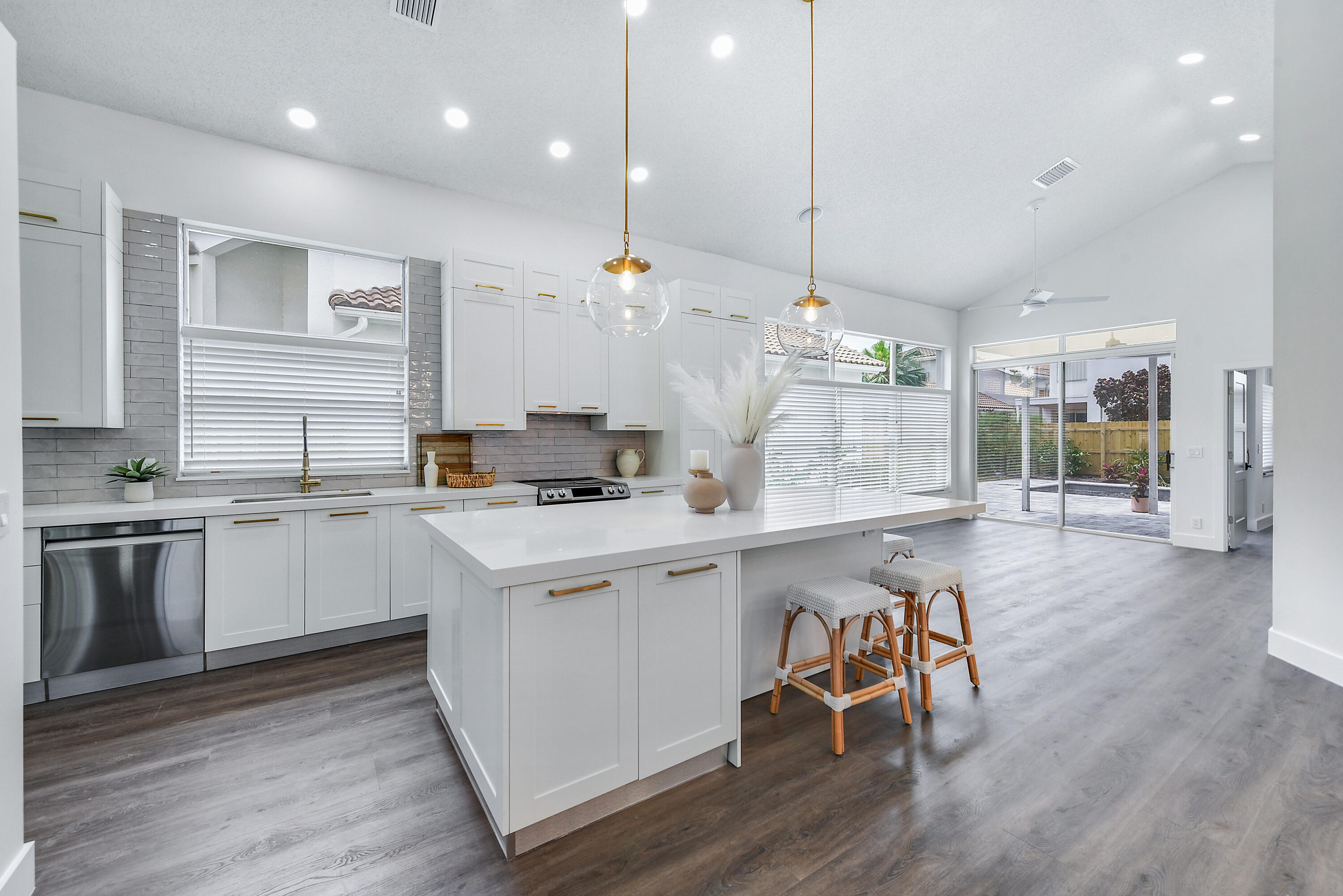 Welcome home! Enjoy country club style living in this lovely renovated 2 bedroom, 2.5 bathroom 1 story home in the premier award winning gated community of Broken Sound! Completely renovated interior - high end - with clean & neutral tones. A spacious new open concept kitchen with white shaker cabinets, extra-large island, Quartz countertops & stainless steel appliances spills into a spacious, light and bright family/living & dining room, easy for entertaining and family living. Volume ceilings throughout! Beautifully done all new stone and tile bathrooms. Large living room and master bedroom windows overlook fenced in private back yard with brand new tranquil pool, landscaping & irrigation, ready for you to move in!