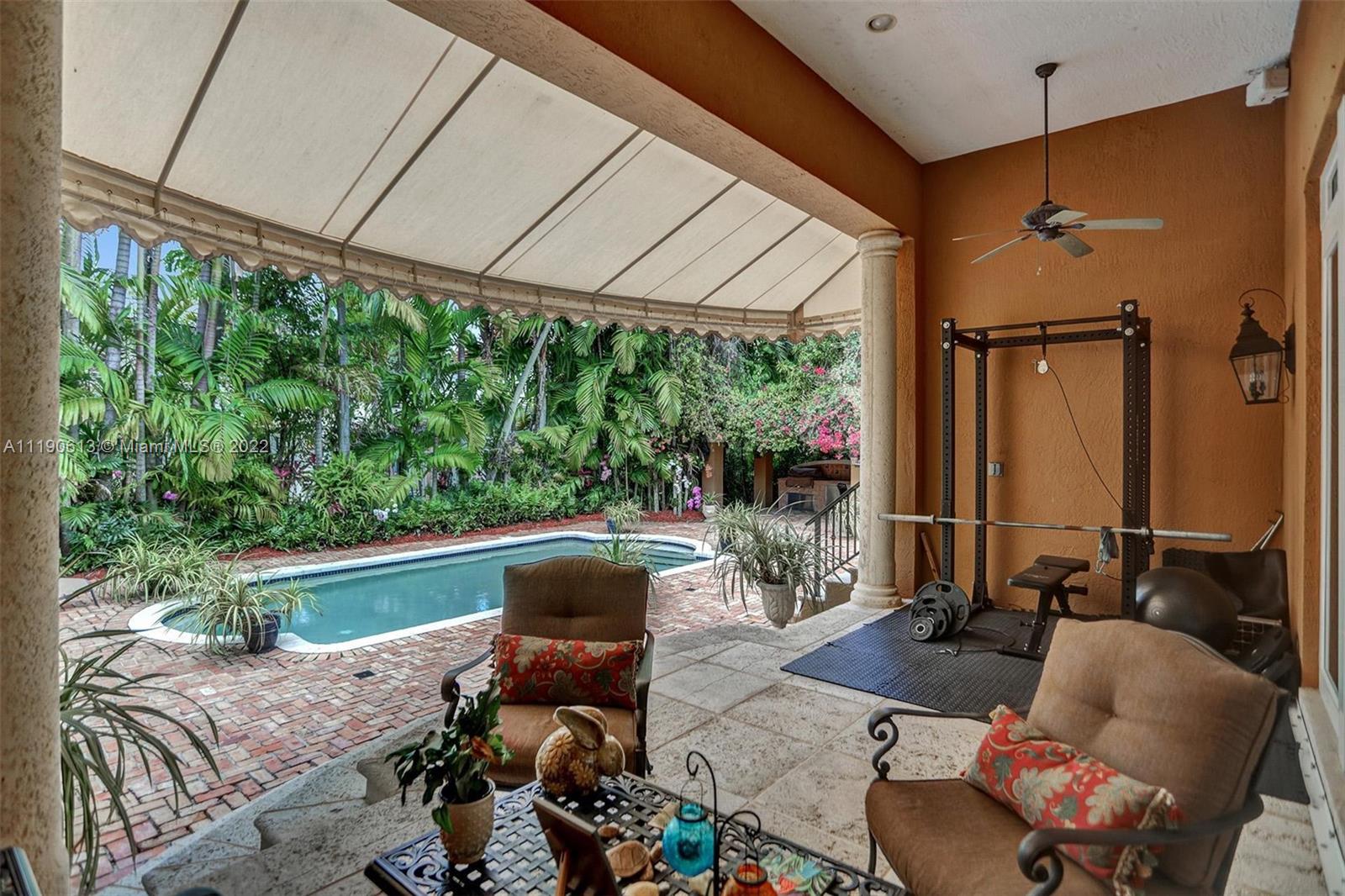 Stunning residence in a sought-after central Coral Gables area location awaits. An inviting foyer leads to a spacious living room, formal dining, entertainment room, and a large kitchen with cooking island with an informal dining area. The principal suite and two bedrooms with a hall bath are on one wing of the home; the 4th bedroom or office is opposite, with an adjacent hall/guest/cabana bath. Soaring ceilings throughout, and a bonus gardener's bath in the garage. Poolside, a covered terrace and pergola with a summer kitchen make the tropical outdoors quite inviting. Expanded and updated in 2002, the property offers a fabulous lifestyle in a desirable residential area, yet close to all the Downtown Gables amenities that our treasured City Beautiful offers.