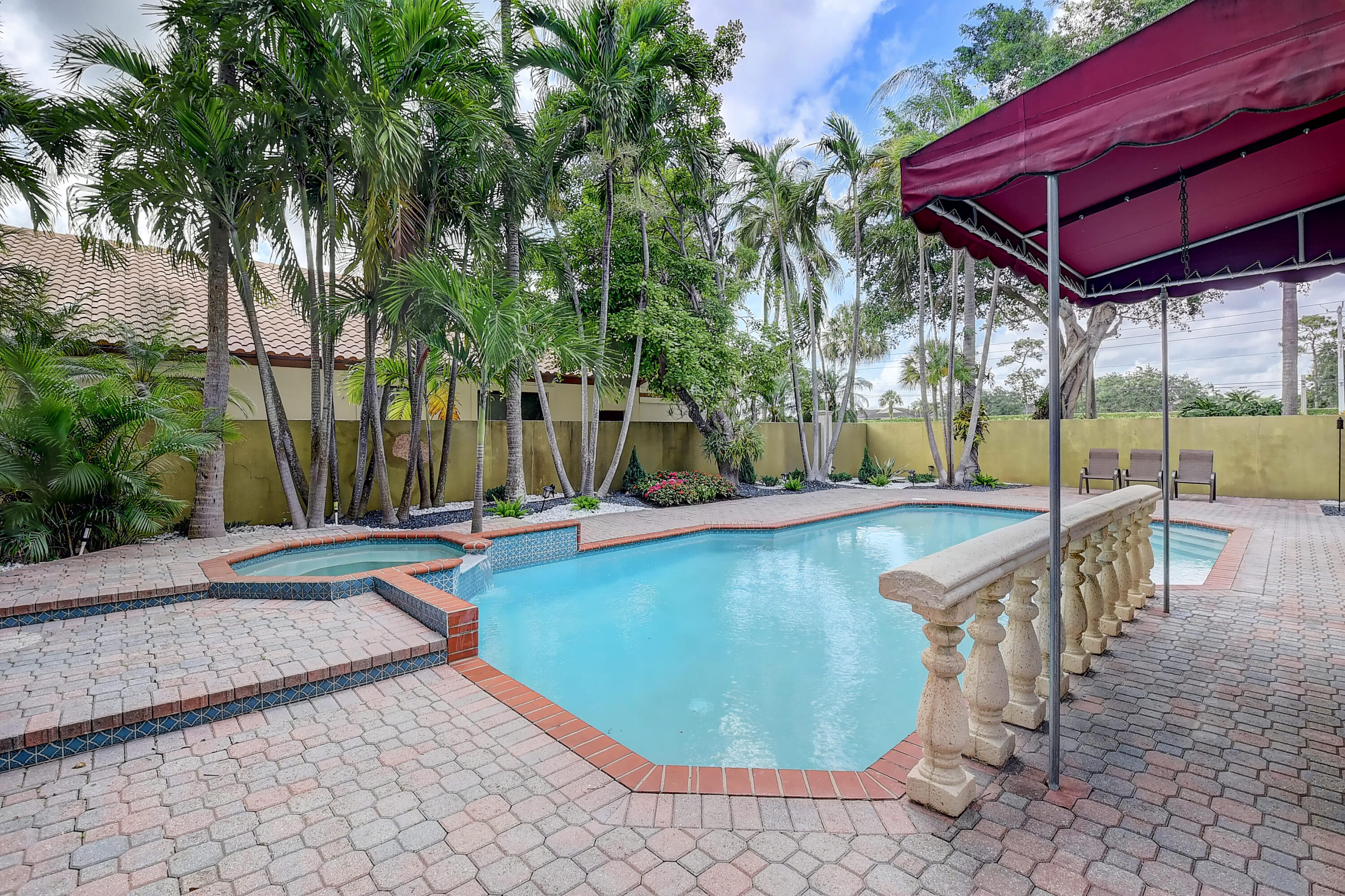 Spacious single family home, located in the sought after Valencia Community of Boca Pointe is a must see! This home is one of the largest homes in Valencia of Boca Pointe, sitting on an oversized, corner lot with a circular driveway. Upon entering the home, you are greeted with high, vaulted ceilings, an open floor plan, and Victorian doors. The home features 3 bedrooms, 4 bathrooms, an office, and a huge walk in closet that can be converted back into its original fourth bedroom. Step through Victorian doors into a beautifully landscaped private backyard with a pool, spa, patio, and cabana bathroom. Updated master bathroom, 2014 roof, both A/C are 2019, and hurricane protection. Boca Pointe provides manned gate security. Optional membership to the County Club with resort style amenities.