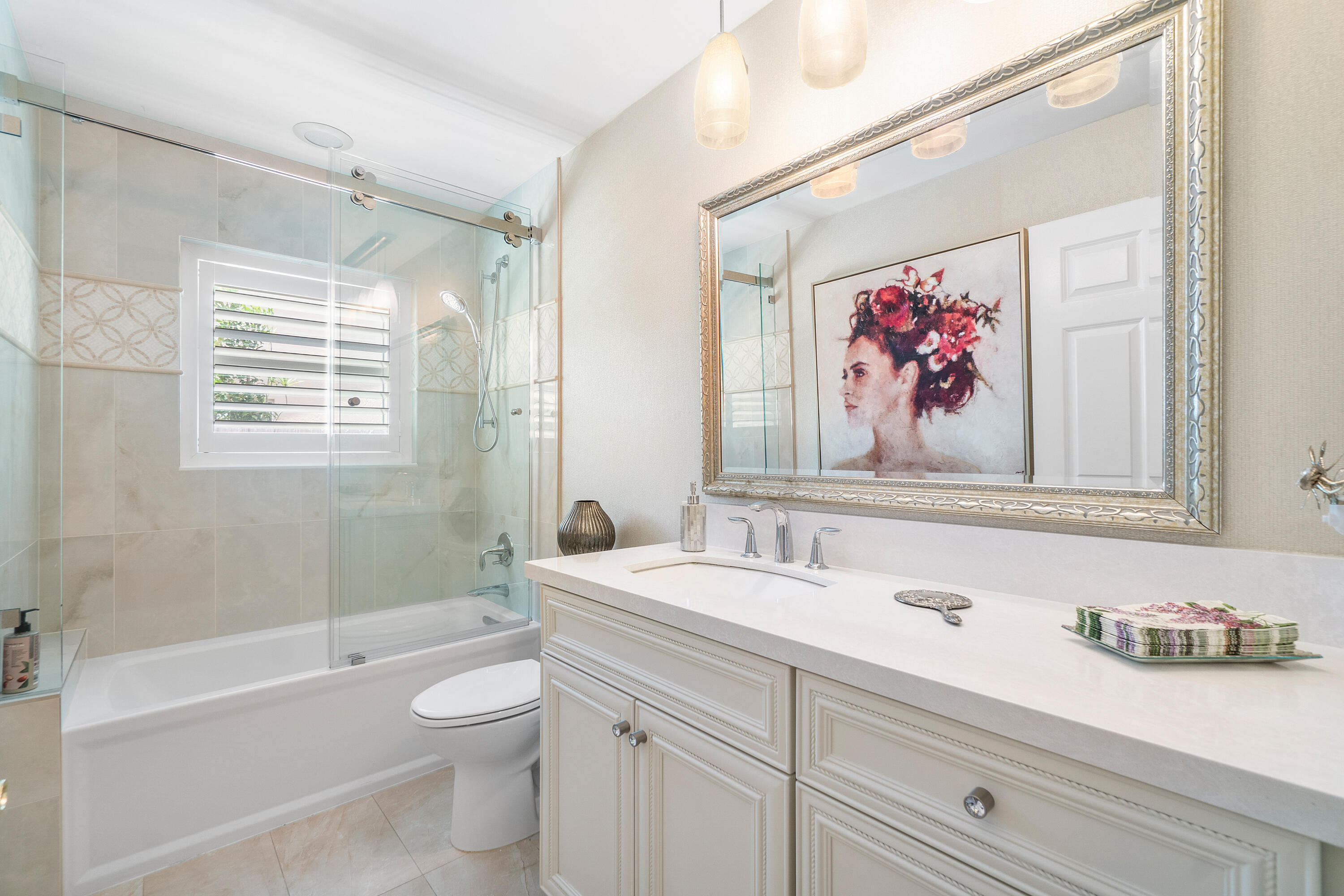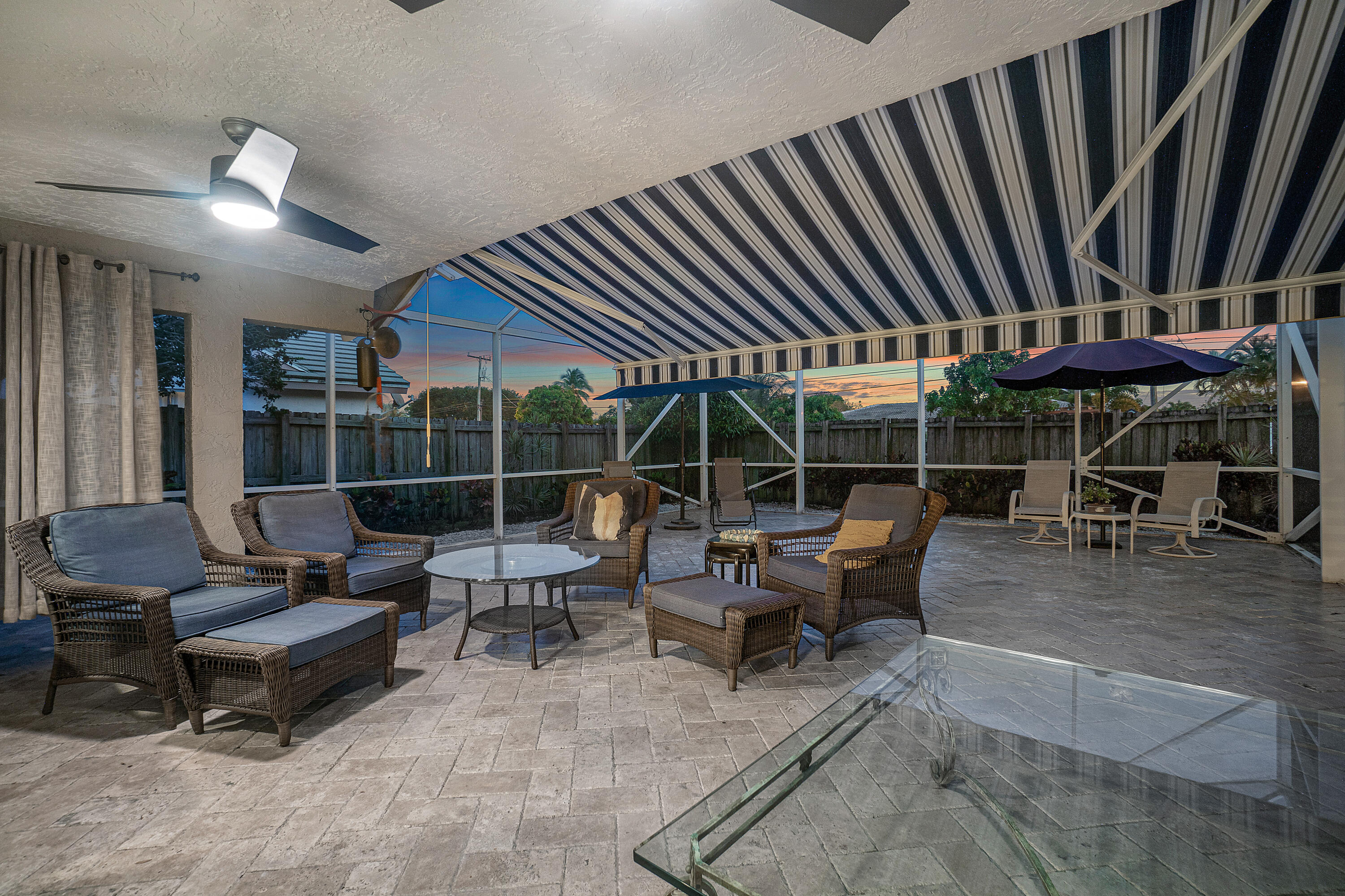 This immaculate, beautifully updated home sits in a quiet and friendly community, Fairfield with convenient access to shops and restaurants at Boca Center. This 3 bedroom, 2 bathroom home is an entertainers dream and offers vaulted ceilings, hardwood floors, a screened in patio with travertine pavers and a spacious yard for pets and guests and room to build a private pool. This home is complete with impact windows and a generator to make hurricane season worry free! The renovated kitchen is equipped with stainless steel appliances and specialized granite backsplash and countertops. The oversized primary bedroom offers abundant natural light, an updated vanity and countertop and red veined Italian marble floors and shower walls. Full size laundry room off the two car garage.