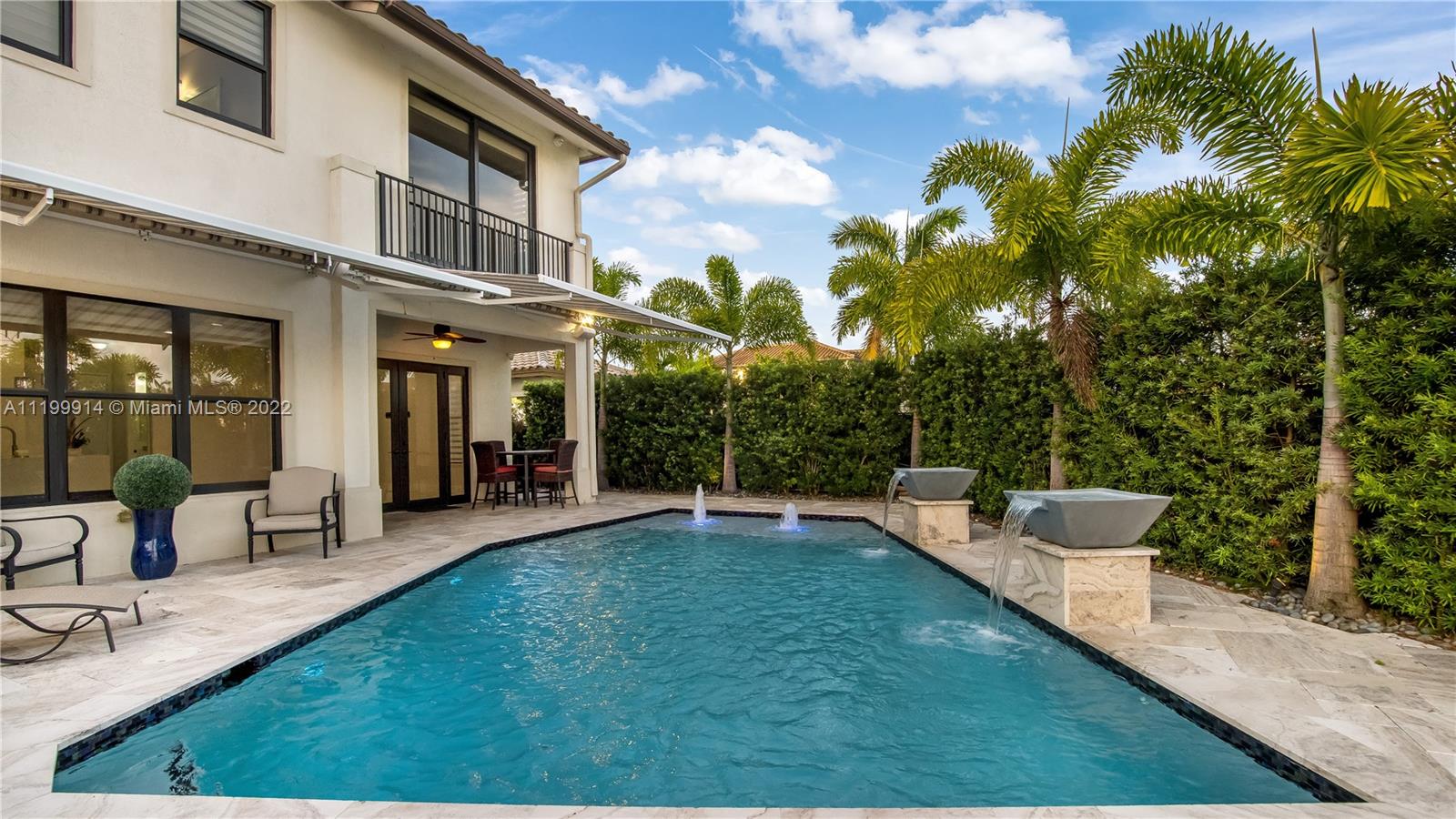 This pristine home has approx. $200K of upgrades. It's located on one of the largest corner lots in a private gated community on a lake. Upgrades include custom kitchen cabinetry w/quartz countertops, & stainless-steel GE appliances, beautiful porcelain tile on the main floor. Custom window shades, lighting fixtures, unique baths fixtures add elegance. French doors leads to large private heated saltwater pool w/glass crystal tile, waterfall fountain features & underwater multicolor lighting. Elegant patio area overlooking pool & lake perfect for entertaining. Outdoor speakers & electric retractable awnings which automatically retract when windy. Upgraded bathroom features. Sparkling lake views from bedrooms. Amenities include 24hr security, clubhouse, gym, game room, children play area.