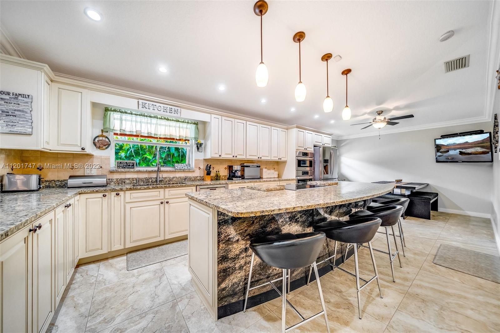 Welcome to paradise! Nestled in the heart of Davie, this gorgeous 3BR/2BA remodeled home features a heated saltwater pool & jacuzzi, Tiki hut large backyard fit for a Boat/RV/Playground, 2 car garage & drive way leaves plenty of room to host gatherings. A large chef's kitchen is the heart of this home, with top of the line stainless steel Bosch appliances, stunning custom wood cabinetry, breakfast bar & a glass cooktop within an amazing island made for entertainment! NO HOA. This spacious, bright open floor plan is simply turnkey at its finest. New water heater, new a/c, roof replaced in 2019. Wonderful neighborhood & excellent location close to Nova Southeastern University, FAU, HCA Florida University Hospital, Hard Rock Cafe, I-595& Turnpike to the beaches & downtown.