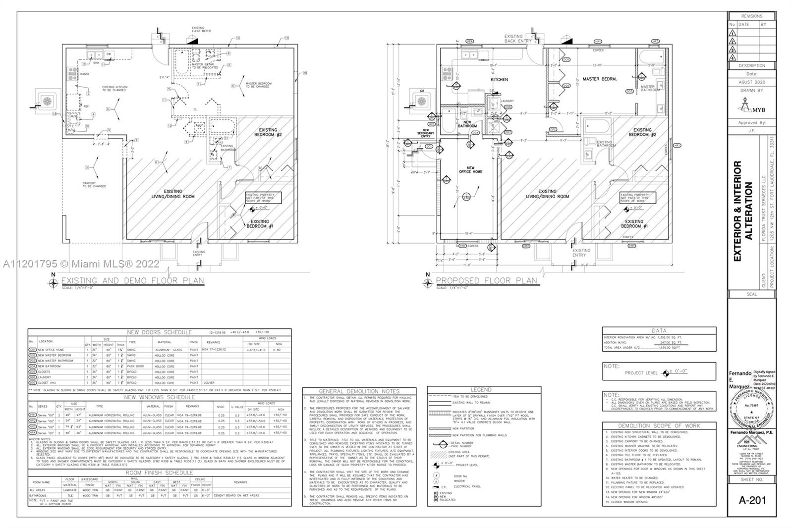 Be amazed by this ONE-OF-A-KIND legal 4-bedroom/ 3-bathroom home that has just undergone a major renovation! This house welcomes you with an updated porch that then guides you to an open floor plan home with, new 32x32 calacatta tiles in the entire house, state-of-the-art bathrooms, a contemporary open kitchen with calacatta quartz countertops, white wood cabinetry and ceramic backsplash, full-grown fruit trees (mango) and avocado, new roof, and new central AC system. Impact windows and doors. The house is setup as a 4/3 or 3/2 and 1/1 with a separate side entrance to make additional income. Perfect location close to downtown areas. Carport was enclosed legally in order to add more square footage to the property which doesn't reflect on tax records yet.