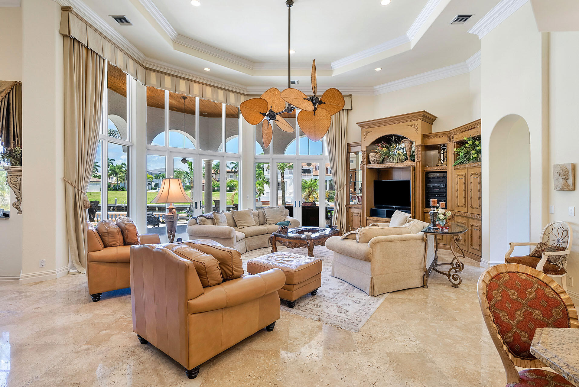 Spectacular waterfront estate in Royal Palm Yacht & Country Club with 5 bedrooms, 6 full baths, and 1 powder room. Situated on 104' of the Butterfly Palm Waterway, this Spanish-inspired home features a large eat-in kitchen, formal dining room, study, equipped bar, and an expansive first-floor main suite. The formal living room has floor-to-ceiling windows opening to the serene pool area and summer room. Additional features include a private deep-water dock, multi-tier heated pool/spa with swim-up bar, and generator.