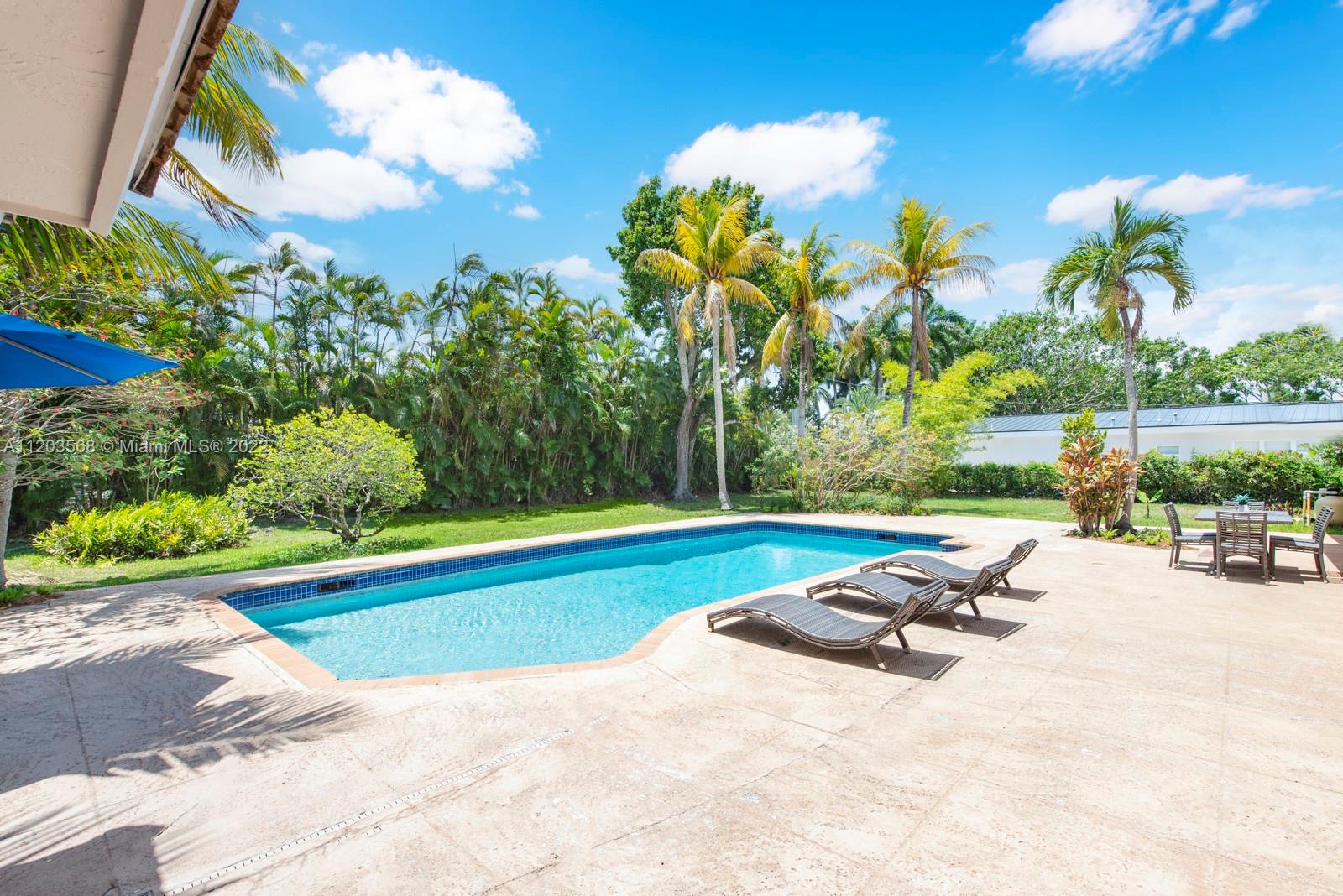 Sought after and rarely found 5-bedroom family home on an oversized half acre lot on quiet no traffic North Pinecrest street. Split plan, tile roof, enlarged wood kitchen, wood flooring in bedrooms, 2 skylights. Great layout with 2-car garage, deep pool, large cantilevered overhang (no columns) , big yard and privacy. Hurricane shutters throughout (some impact glass windows) , flood zone "x" so no flood insurance required. Pinecrest Elementary.