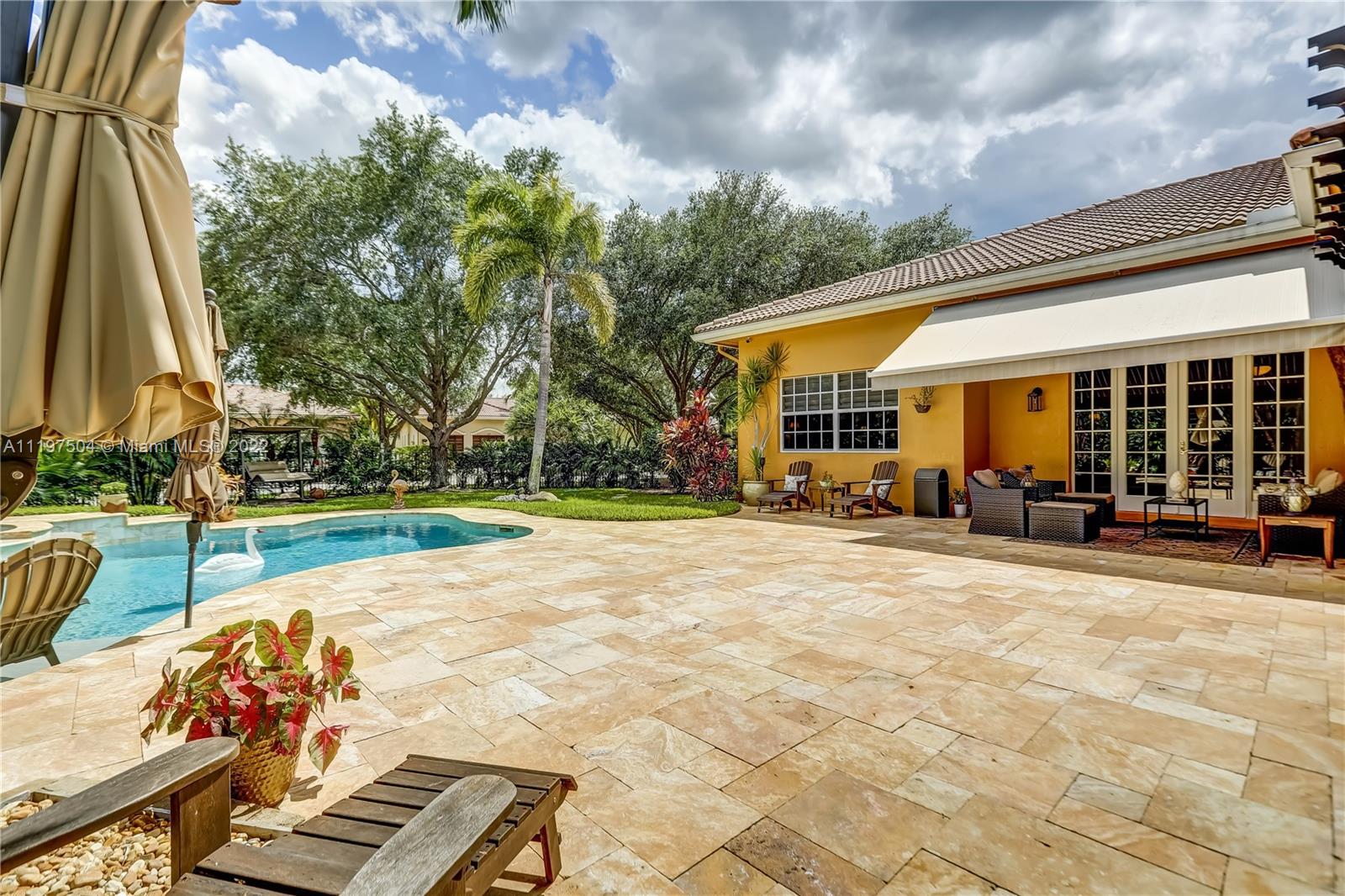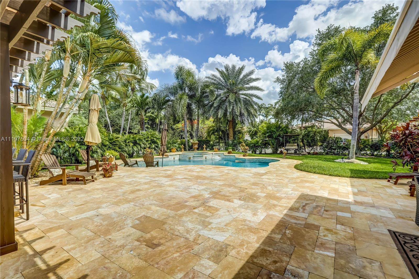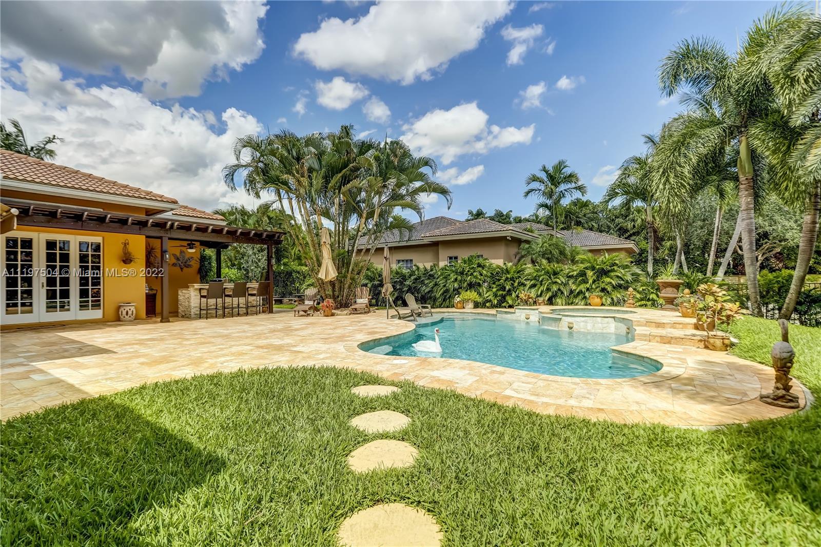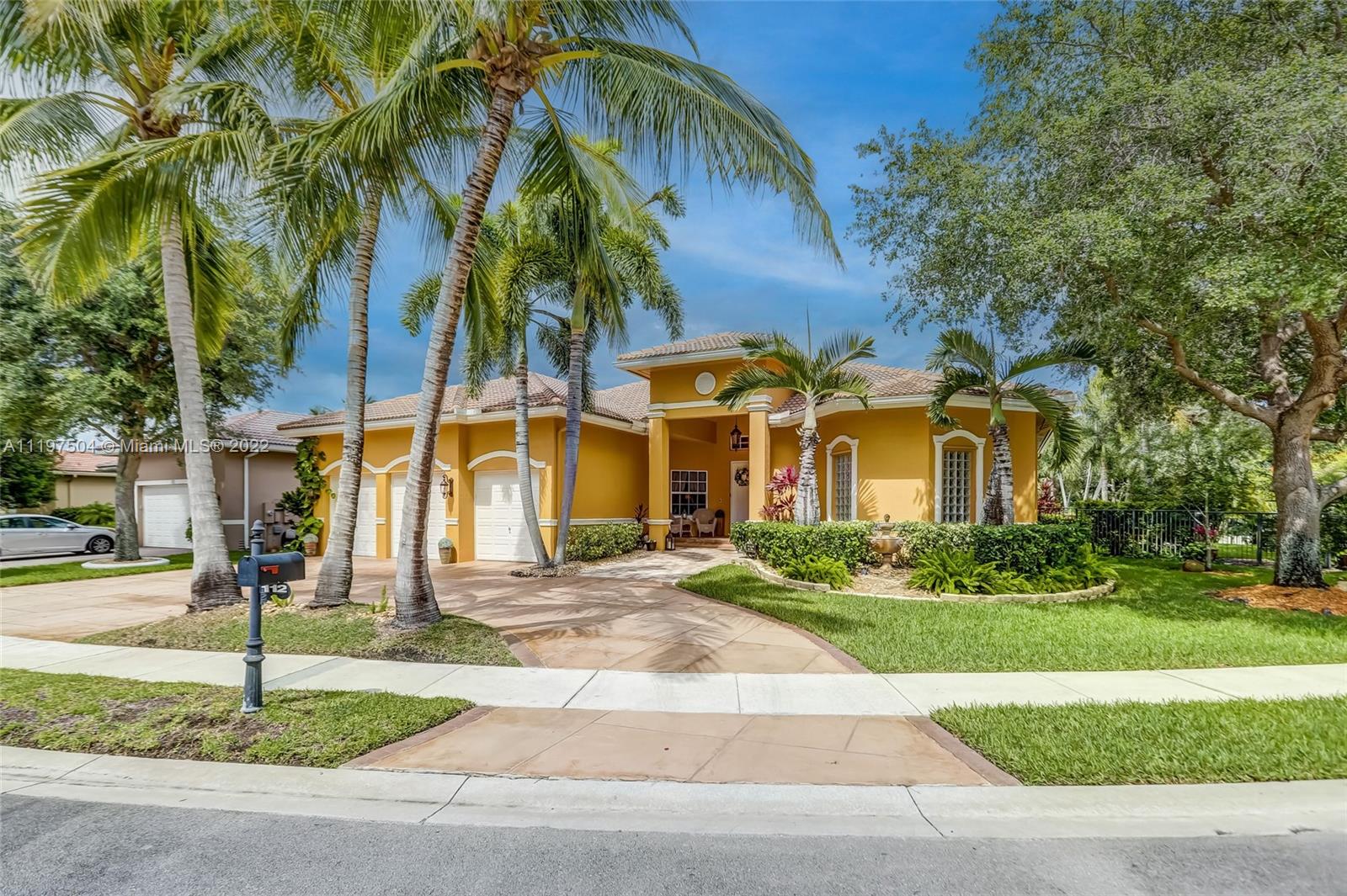 Come home to your tropical entertainers paradise in Lago Plantation one of Plantation's hidden gems with only 18 homes, Soaring volume ceilings throughout each & every room. Open floor plan featuring tile flooring in main living areas & master bedroom, & hardwood floors in the secondary bedrooms. Large master suite featuring double trey ceilings, dual walk-in closets, & grand master bath with marble floors, spa soaking tub & separate shower. Big secondary bedrooms with hardwood flooring. Kitchen features granite counters, wood cabinets, & s/s appliances that overlook the expansive family room. Amazing heated saltwater pool/spa surrounded by travertine pavers, lush landscaping, & beautiful summer kitchen. Whole house generator, impact windows/accordion shutters, & the list goes on
