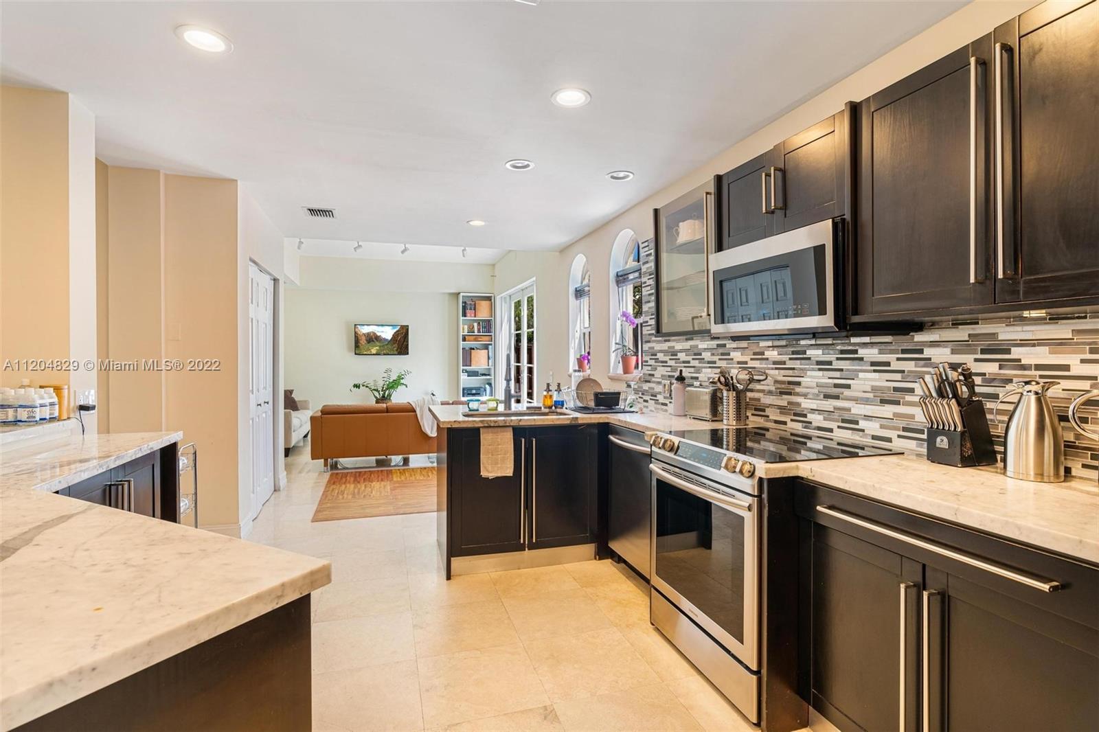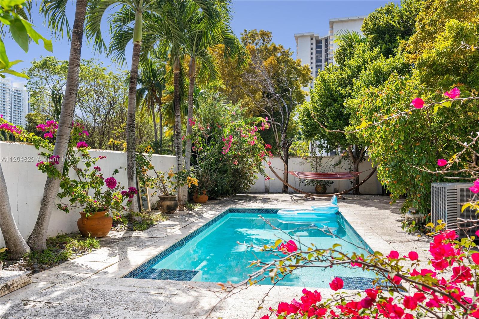 LARGEST UNIT, LARGEST YARD+PRIVATE POOL: 4/3.5 (easy convert to 5/3.5) tri-level in beautiful and exclusive mediterranean village of 63 homes in the HEART of Aventura. PERFECT FOR A FAMILY - A+ park/playground is literally steps away. Rare and unique unit has the ONLY full-size PRIVATE POOL, and LARGEST backyard in Aventura Bay - the "Developer's unit" - Also has the best VIEWS with eastern exposure, park views, light, bright and open skies and sunrises. BEST schools in Miami including ACES and new Soffer High. Natural stone floors everywhere AND SO MUCH SPACE: 3rd floor can be easily divided into 2 bedrooms (for a total of 5BR!). NEW ROOF and exterior paint (not pictured) in 2022. Next to Lubavitch temple. Unit rented until 8/2023 @$4500/mo, giving you time to make this house your home.