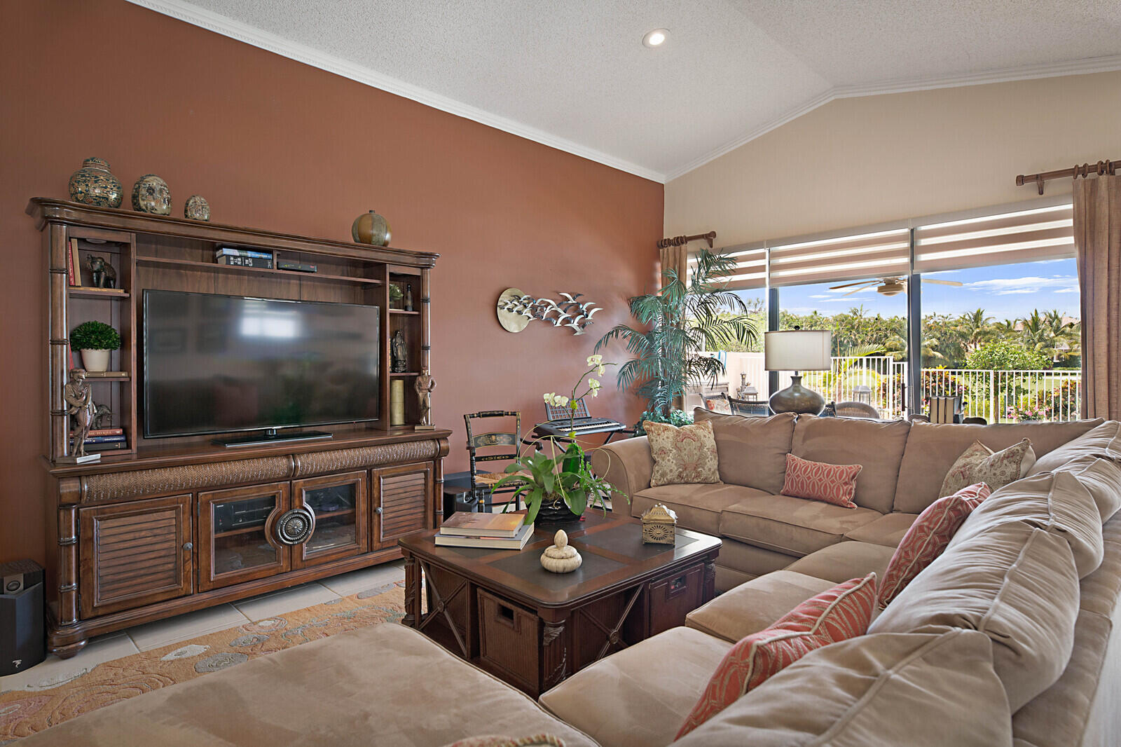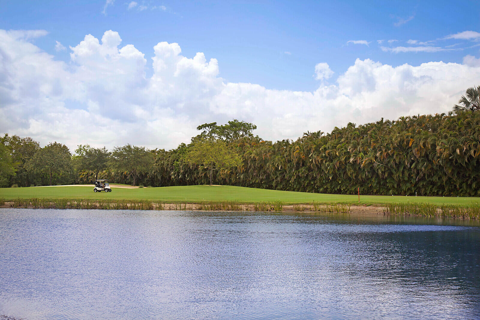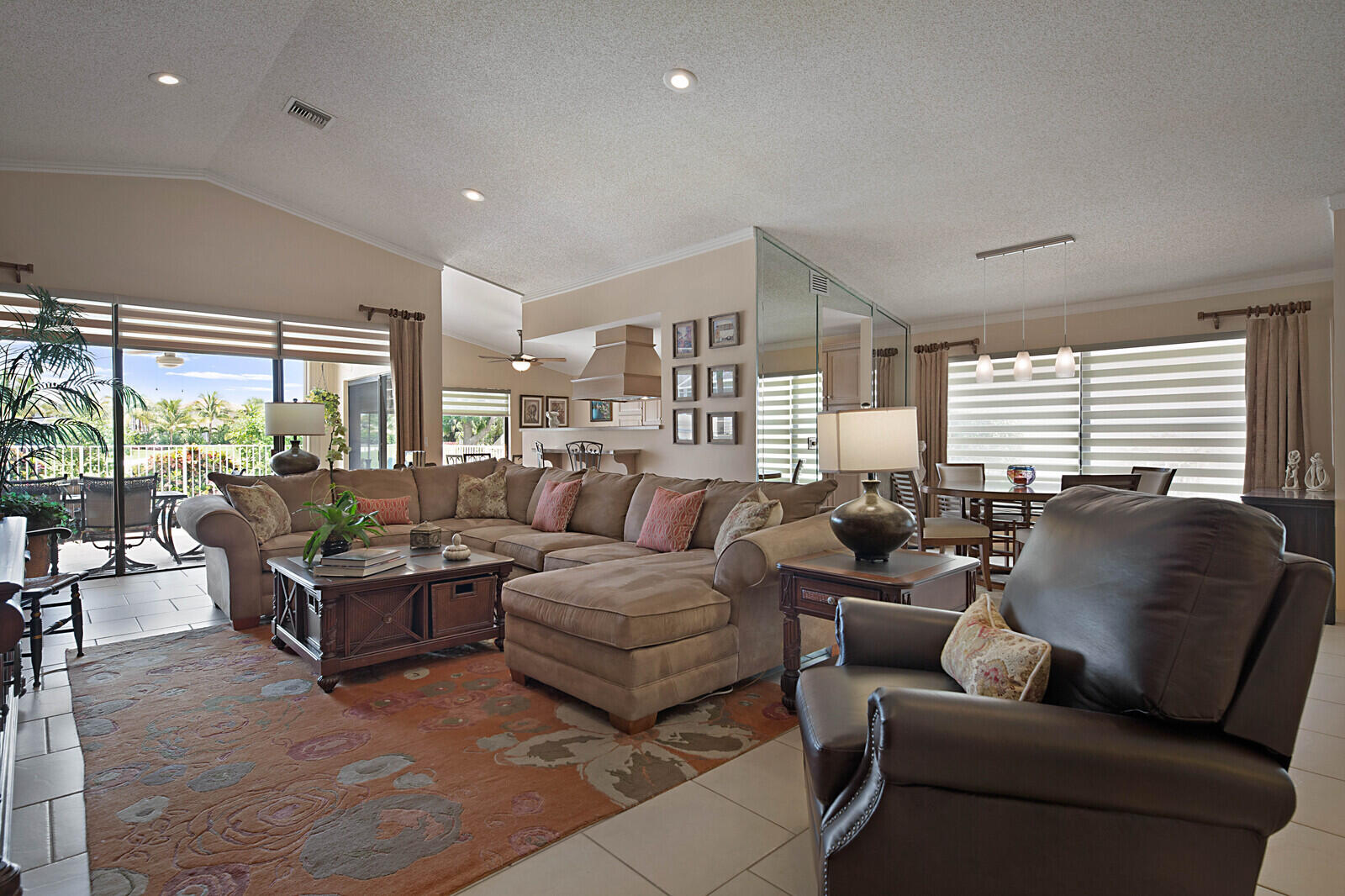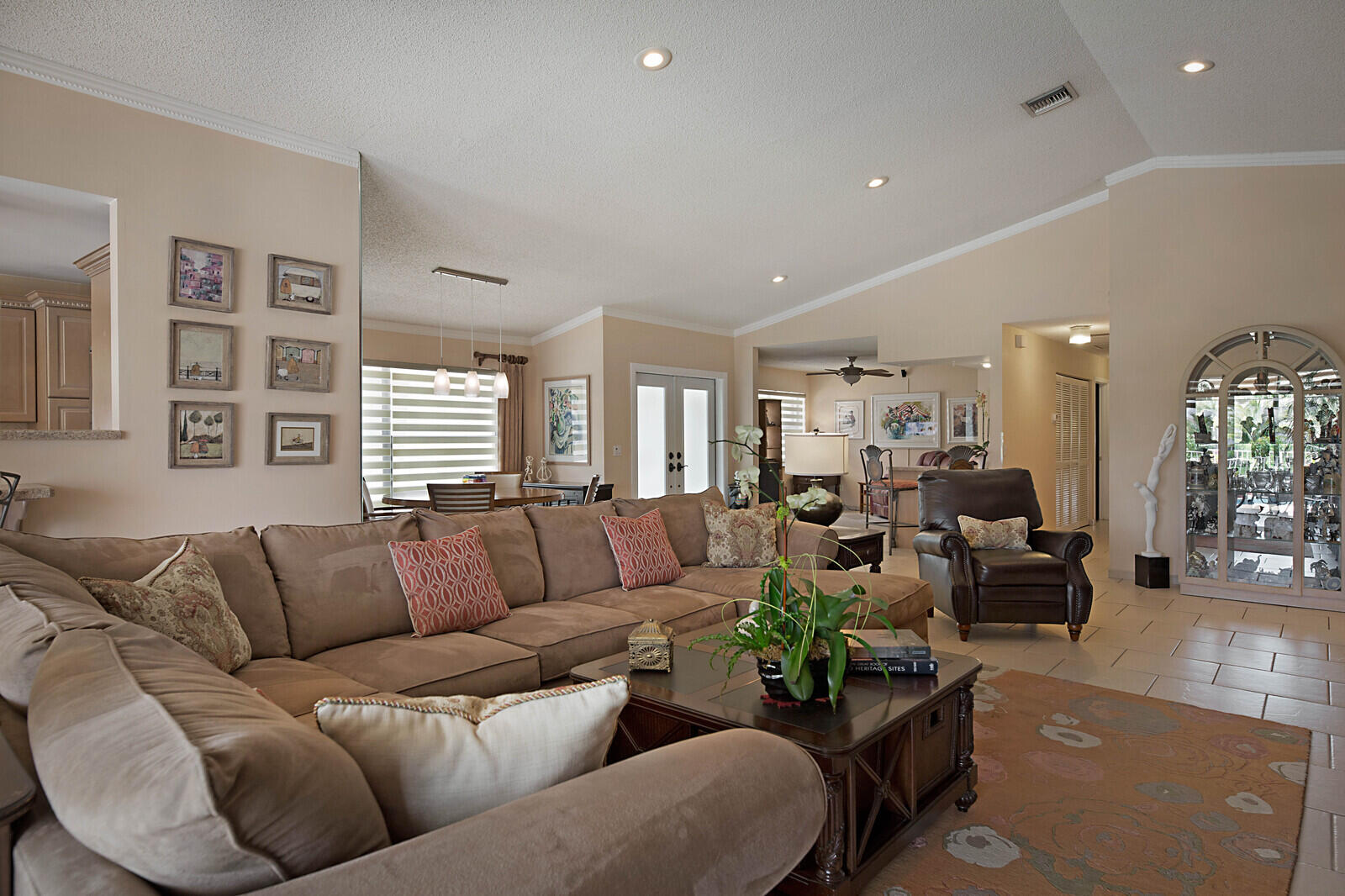 Welcome to Boca Woods - one of the area's premier golf and country club neighborhoods with not only 2 golf courses, but tennis, pickleball, a new sports/fitness complex, social clubs, elegant clubhouse and dining +++. Membership is mandatory and full golf is available, however this home is eligible for a Social Membership option. Popular Pinewood model w/heated pool on beautifully landscaped golf and lake lot. Very private patio. Large, neutral tile in all living areas + Primary Bedroom. Laminate in the 2nd bedroom. 3rd bedroom used as a den has wet bar. Vaulted ceilings. Crown molding. Kitchen & bathrooms have been updated. Accordion shutters + impact front and garage doors. Beautifully maintained with new/newer roof, AC, water heater & most appliances. See ''more'' for more specifics