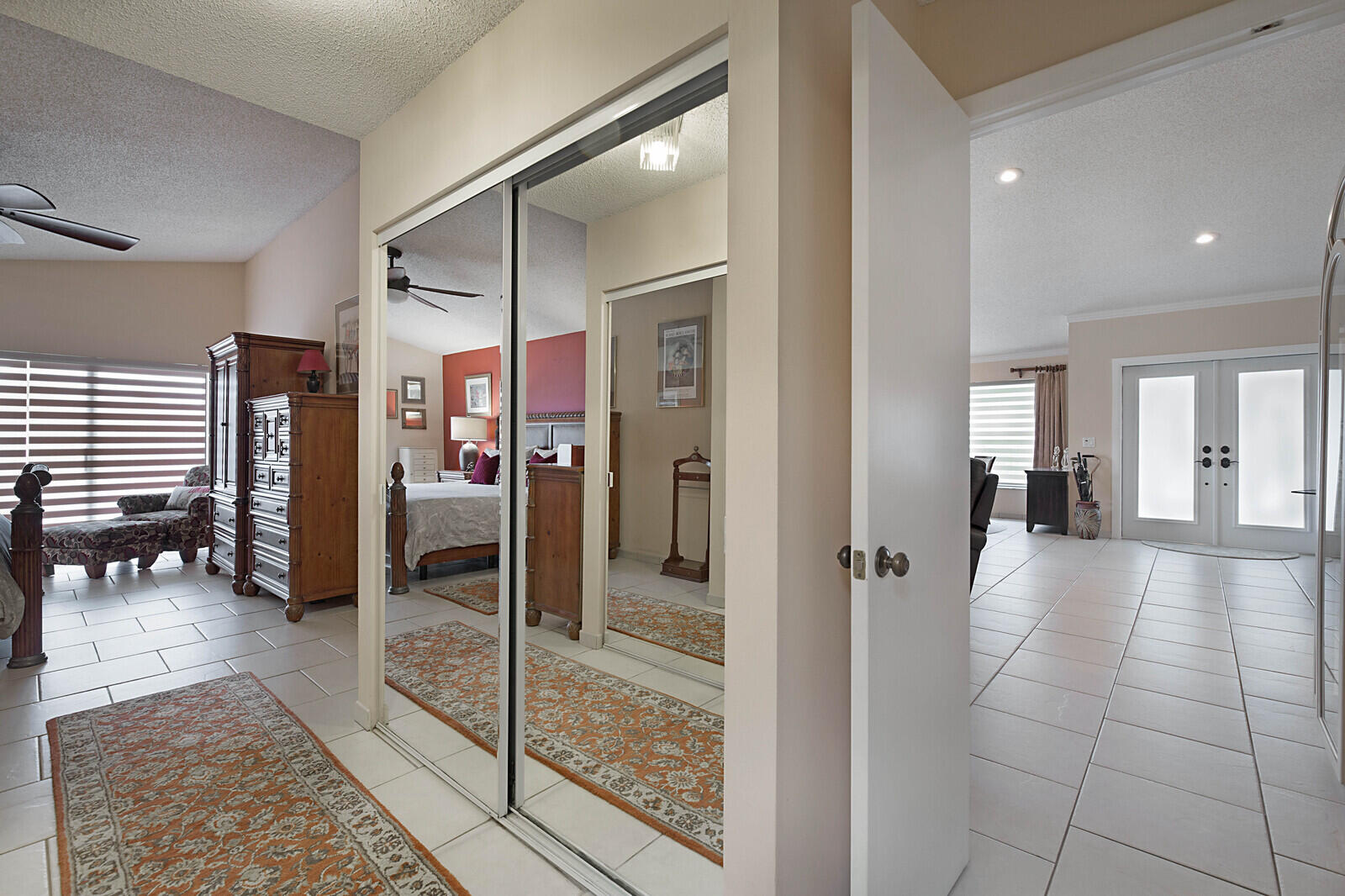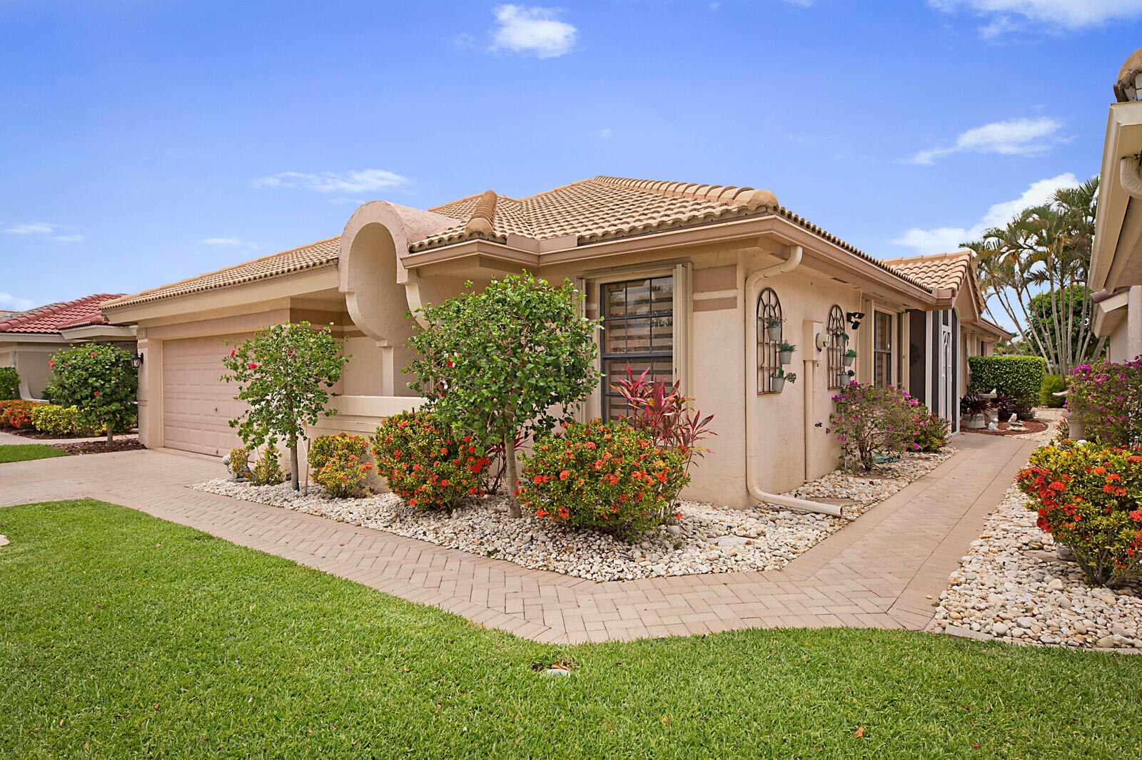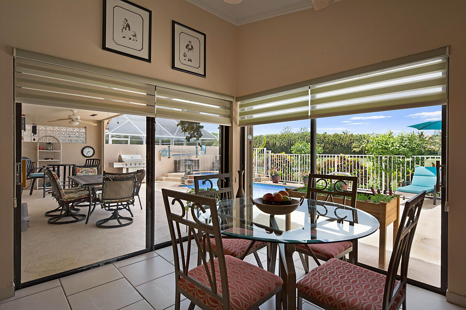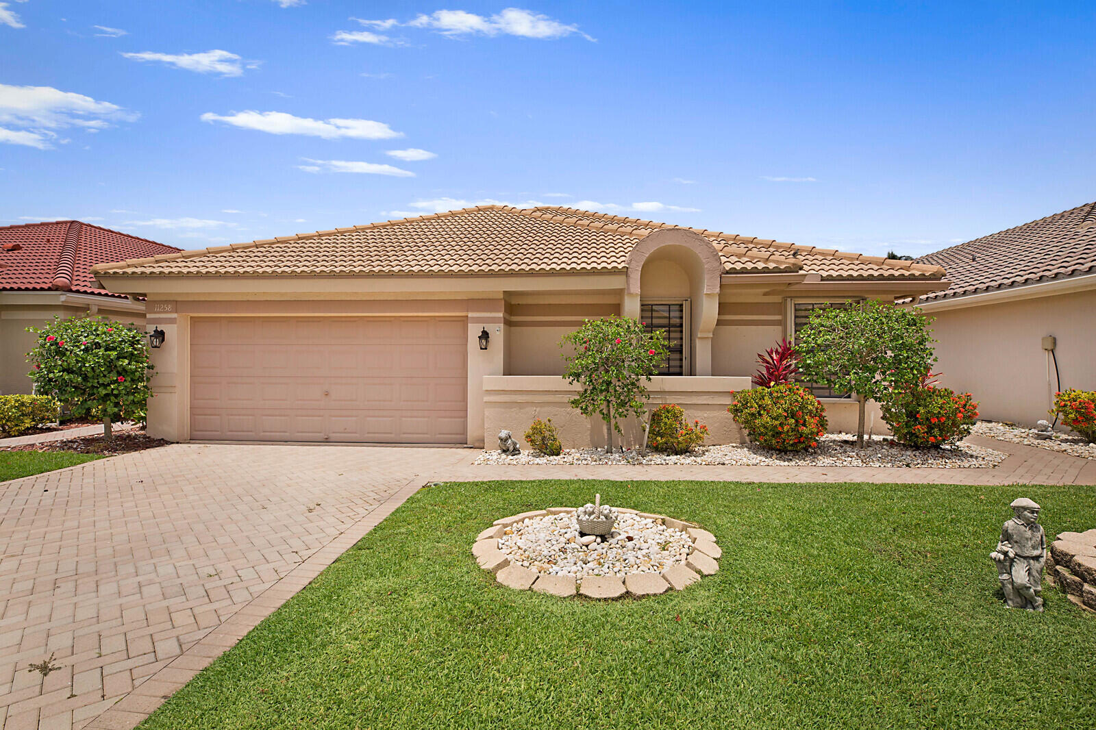 Welcome to Boca Woods - one of the area's premier golf and country club neighborhoods with not only 2 golf courses, but tennis, pickleball, a new sports/fitness complex, social clubs, elegant clubhouse and dining +++. Membership is mandatory and full golf is available, however this home is eligible for a Social Membership option. Popular Pinewood model w/heated pool on beautifully landscaped golf and lake lot. Very private patio. Large, neutral tile in all living areas + Primary Bedroom. Laminate in the 2nd bedroom. 3rd bedroom used as a den has wet bar. Vaulted ceilings. Crown molding. Kitchen & bathrooms have been updated. Accordion shutters + impact front and garage doors. Beautifully maintained with new/newer roof, AC, water heater & most appliances. See ''more'' for more specifics
