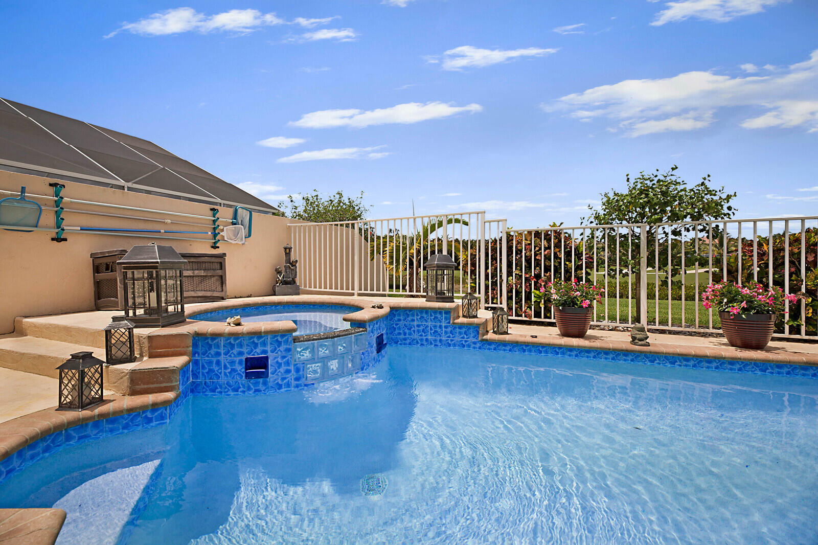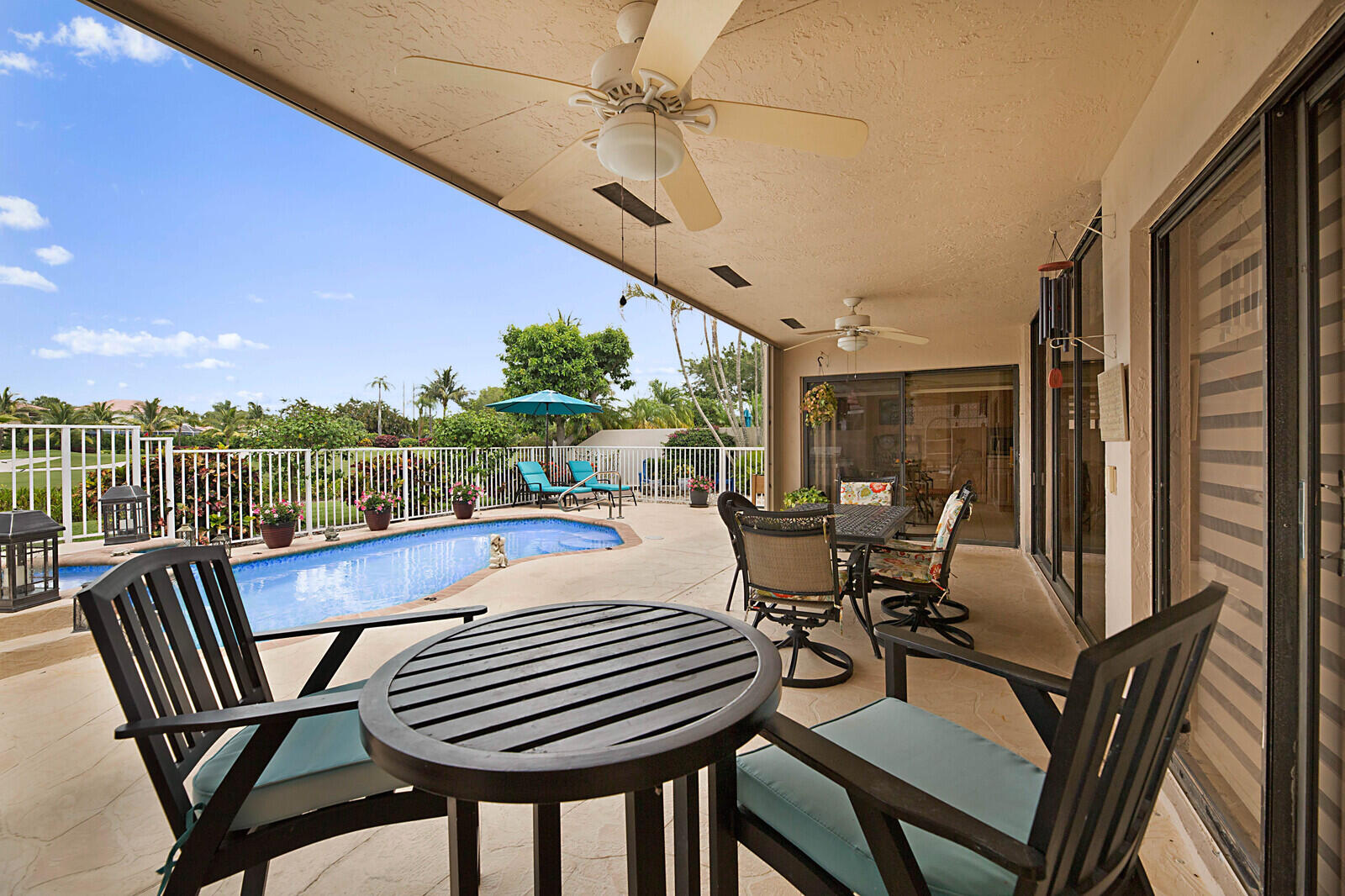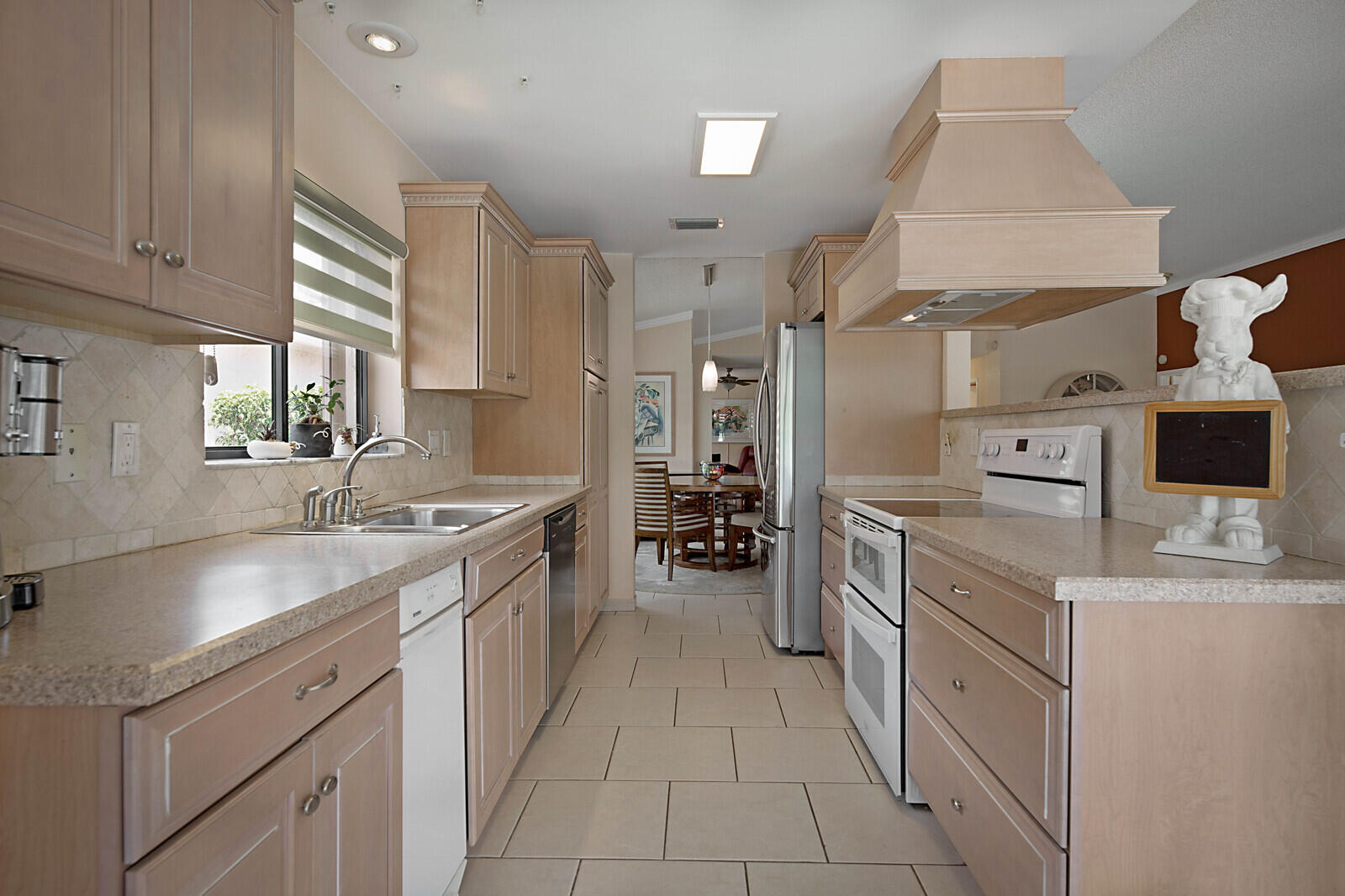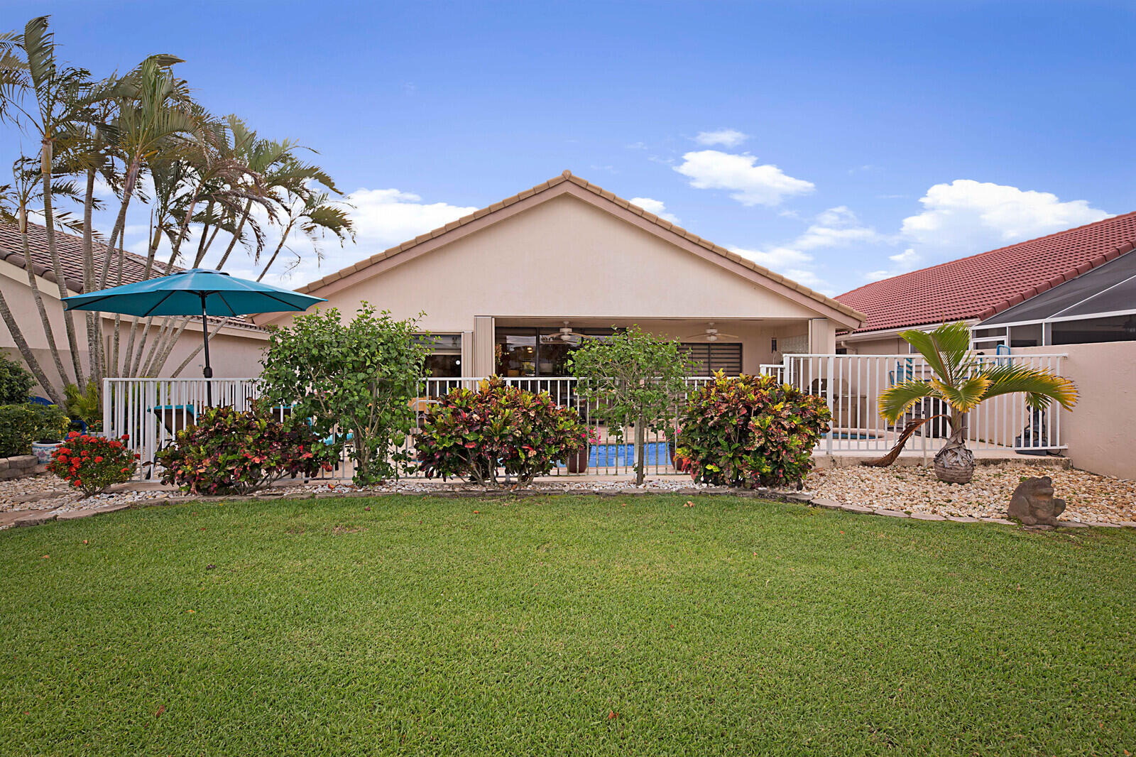 Welcome to Boca Woods - one of the area's premier golf and country club neighborhoods with not only 2 golf courses, but tennis, pickleball, a new sports/fitness complex, social clubs, elegant clubhouse and dining +++. Membership is mandatory and full golf is available, however this home is eligible for a Social Membership option. Popular Pinewood model w/heated pool on beautifully landscaped golf and lake lot. Very private patio. Large, neutral tile in all living areas + Primary Bedroom. Laminate in the 2nd bedroom. 3rd bedroom used as a den has wet bar. Vaulted ceilings. Crown molding. Kitchen & bathrooms have been updated. Accordion shutters + impact front and garage doors. Beautifully maintained with new/newer roof, AC, water heater & most appliances. See ''more'' for more specifics