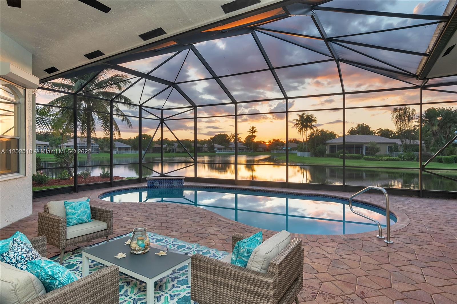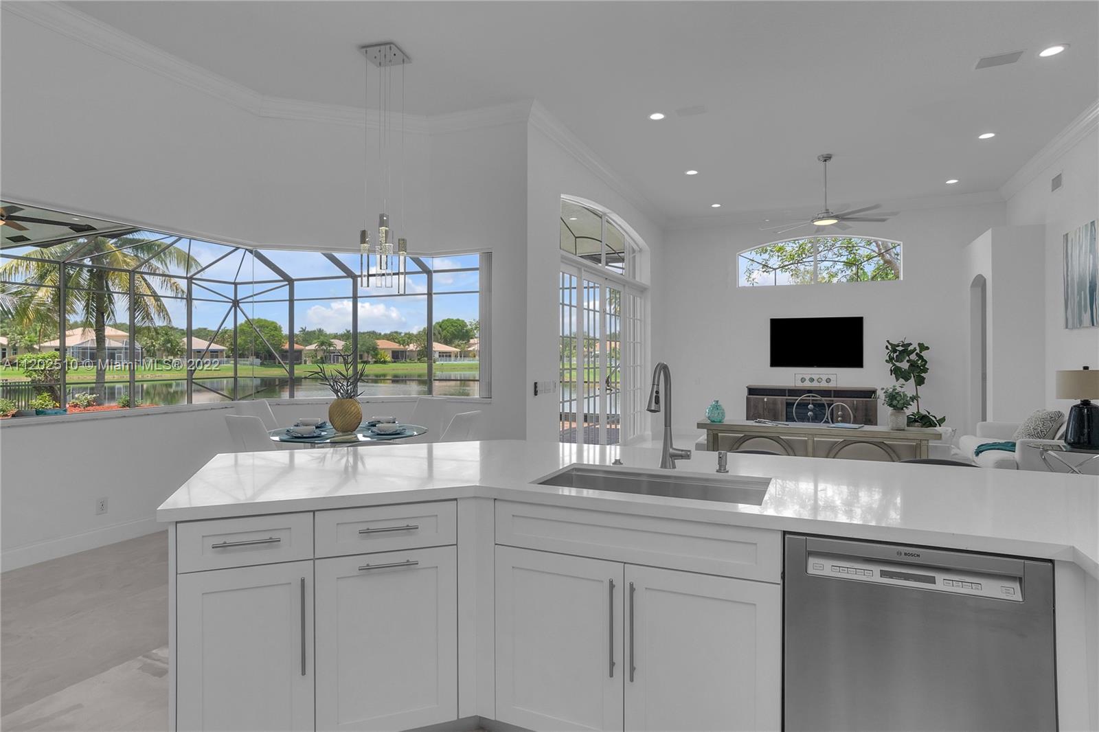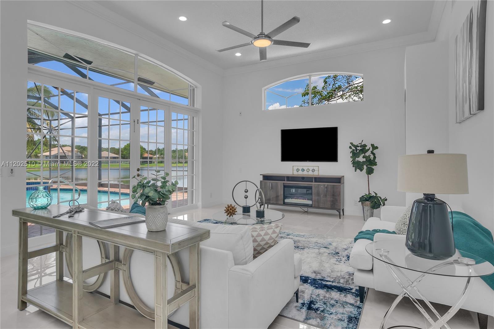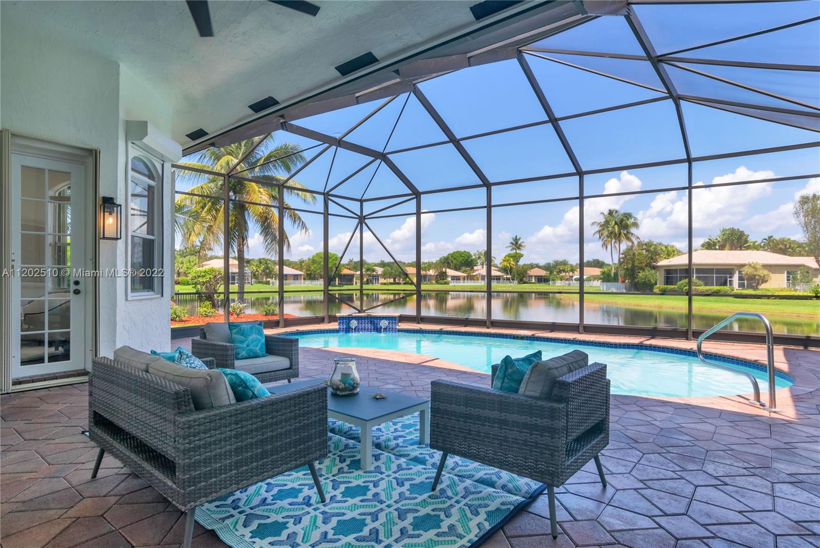 Elegantly renovated!!! TURNKEY 1- story LAKEFRONT with subtle golf views in esteemed Weston Hills. This 5 bedroom, 4.5 bath + office, 3 CG stunner sits on a lushly landscaped 16,240 SF lot & boast vaulted ceilings, new 48" porcelain tiles in living/kitchen area, wood flooring in bedrooms & office. Updated kitchen w/quartz countertops, double ovens, Sub-Zero fridge, Bosh dishwasher, Ruvati stainless sink with accessories. Luxurious primary suite w/sitting area & walk-in closets. En suite dazzles w/new vessel tub, quartz counters, rain shower & chic lighting. All bathrooms refreshed. Screened in lanai with extended al fresco patio. Resurfaced pool & color LED lights, new pump motor. Interior/Exterior freshly painted. Roof 2013, AC units (2016 & 2019), water heater 2013. Accordions throughout