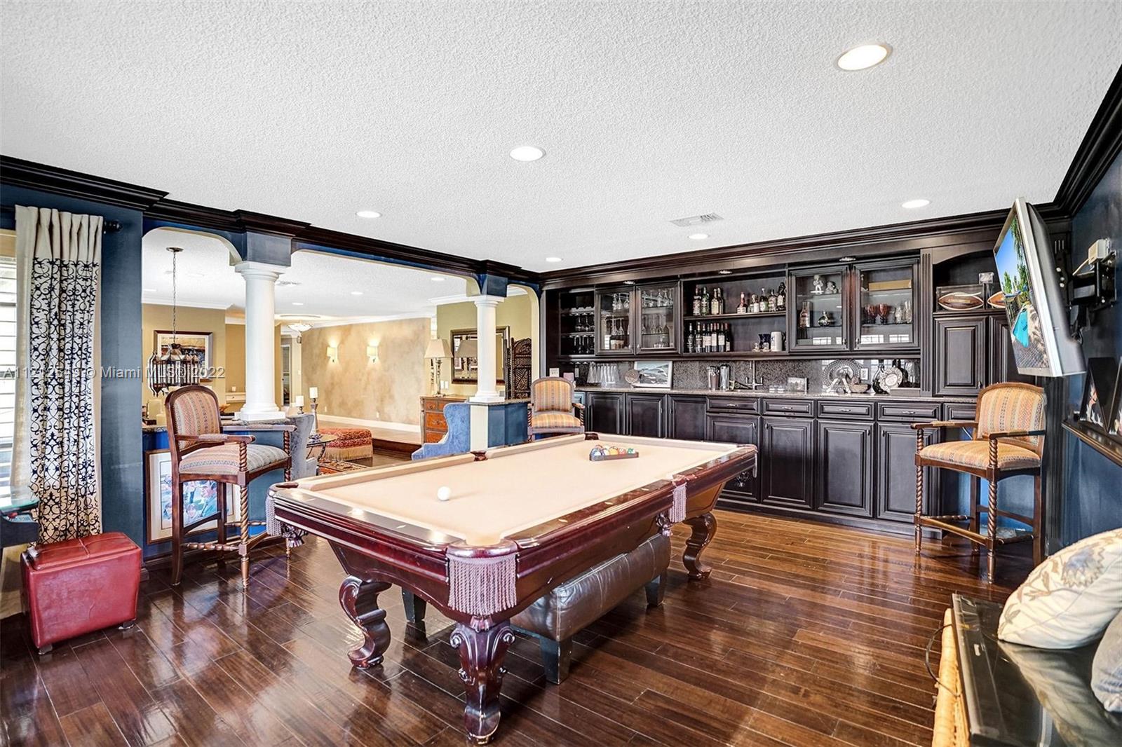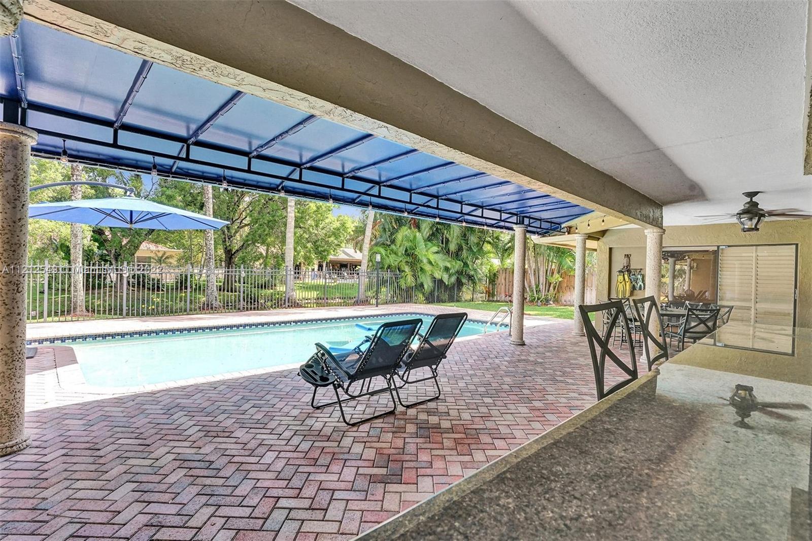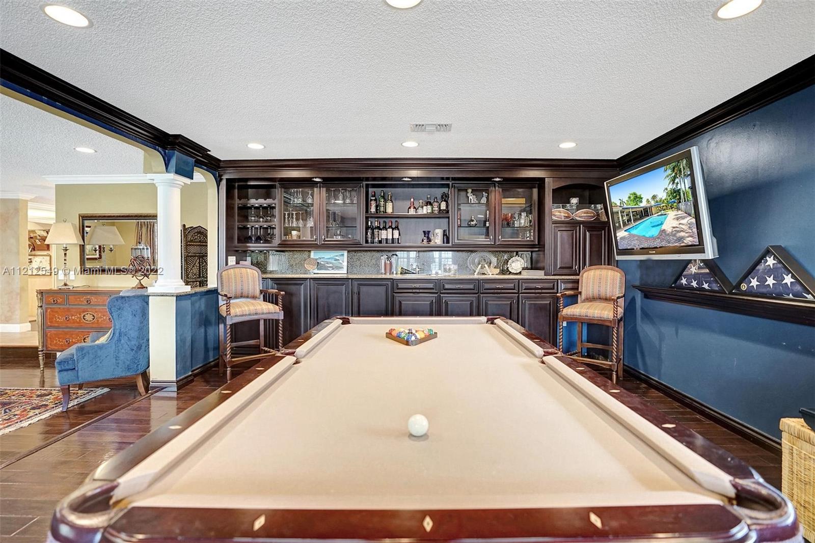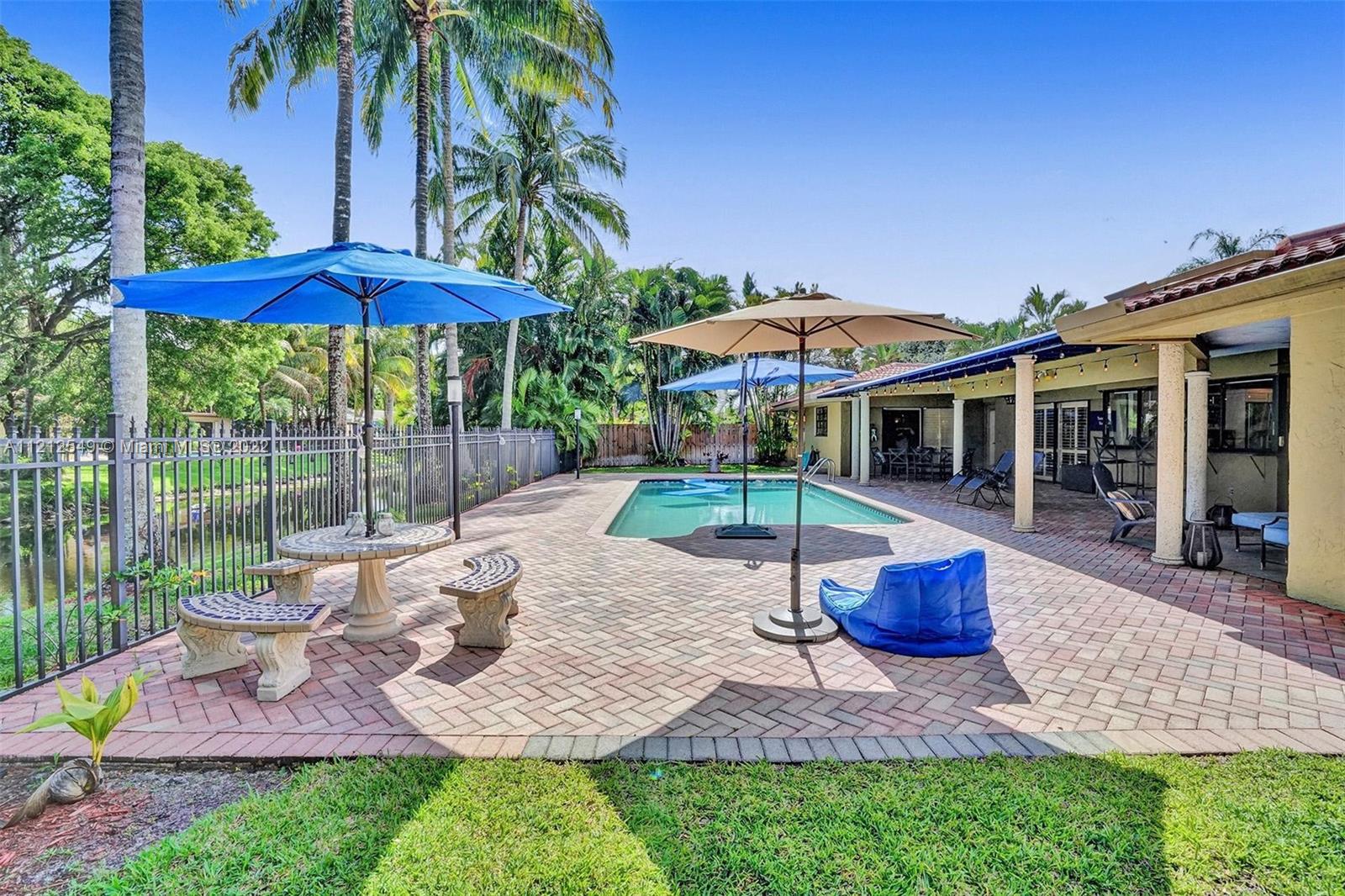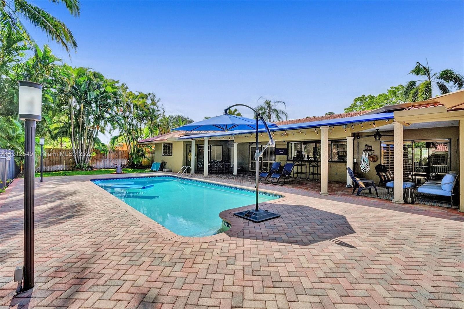 Rarely available - This immaculate and remodeled 4-bedroom 3-bathroom waterfront/pool single family home is the Largest custom-built 1 story home in New Orleans Villas Estates - no homeowners assoc! Features include 350 sq ft Billiard room with mahogany cabinetry & custom-built wet bar for entertaining off living room; expansive Gourmet kitchen with kitchen window overlooking pool deck, stovetop island, lighted breakfast bar and newer appliances; 2 large dining rooms & family room; custom plantation shutters, huge inside laundry rm! Garage-Tek system; outdoor living at its finest with resort-style southern exposure pool with brick paver patio flanked by eight 20-foot coconut palm trees along an expansive canal front with custom designed commercial-grade shade awning.