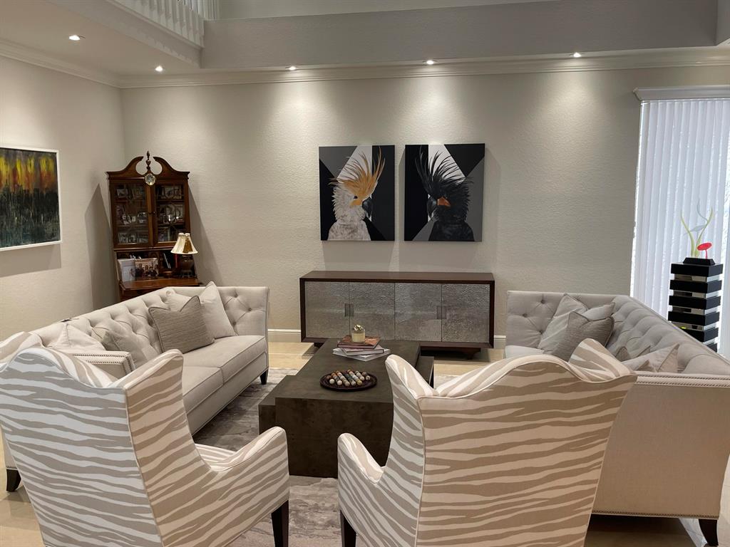 Stunning elegantly updated home in the highly desirable Boca Country Club. This bright, contemporary home boasts volume ceilings, new kitchen, stainless steel appliances, updated bathrooms, impact windows/doors and gorgeous golf views. The primary suite is complete with a private sitting room, two finished walk-in closets, oversized bath with dual vanities, large tub, walk-in shower and water closet. Enjoy your outdoor living space with lush tropical landscaping and gorgeous views. Boca Country Club is NOT a mandatory country club membership community.