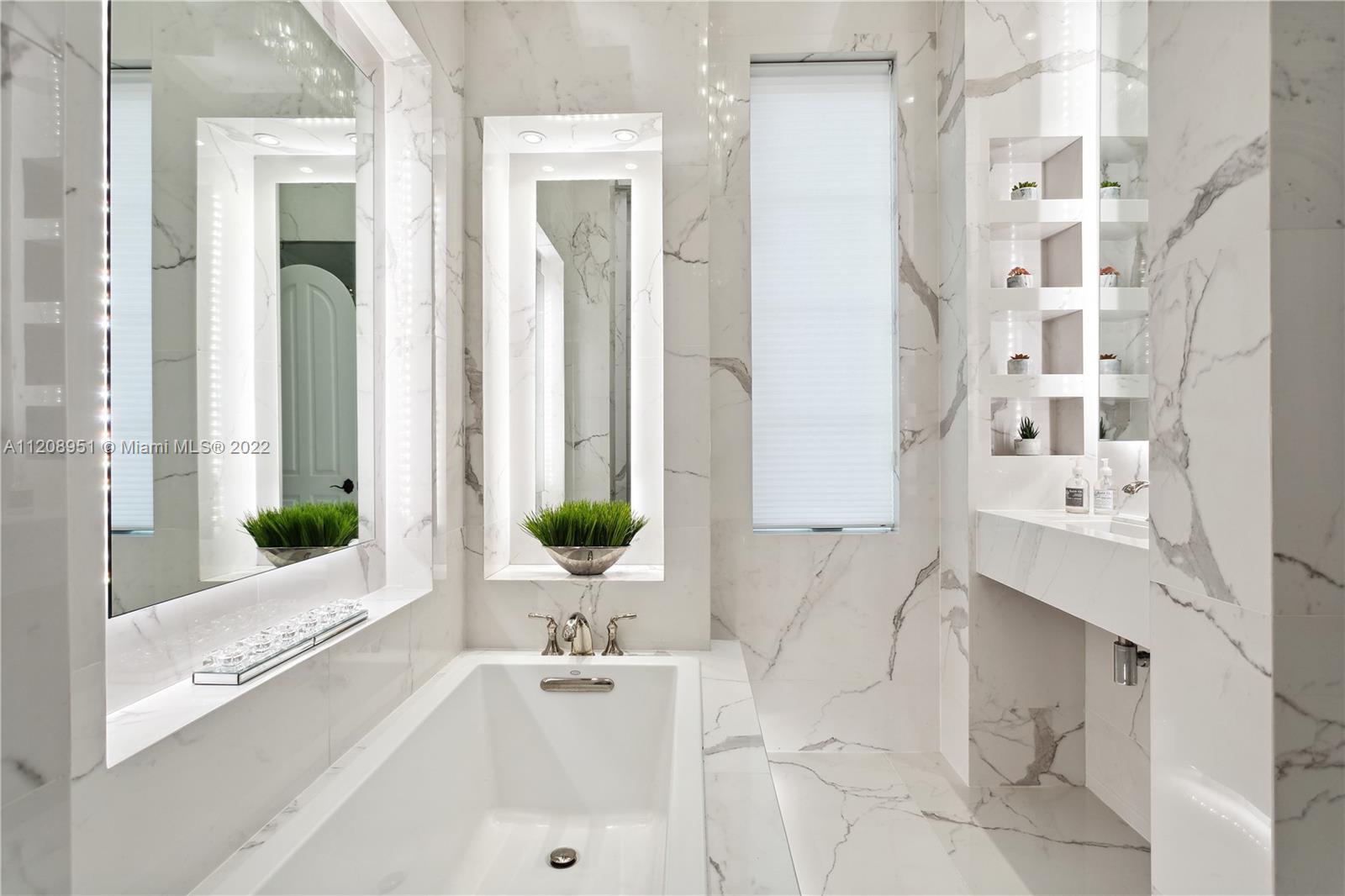 Exquisite, elegant, and sophisticated custom-made new home. Rarely has Miami Beach offered such a level of ornamentation and crisp details. Very bright with high ceilings, (12ft and 28ft), secured with 25 surveillance cameras and control panels, this home is the pinnacle of luxury and privacy. Opulent wall panels and millwork fabricated on site. Each ceiling is backlit with recessed LED lights. 8' interior doors, 24'' white marble tiles. Impeccably maintained design present throughout the home, leading to a manicured backyard with a large pool, spa, 4 submerged bar stools, and a BBQ area. Two-car garage with 28' ceilings allowing for extra lifts. Expansive center Cristall Quartz kitchen- island backlit with LED lights and 32' disappearing TV. See attachment for more details.