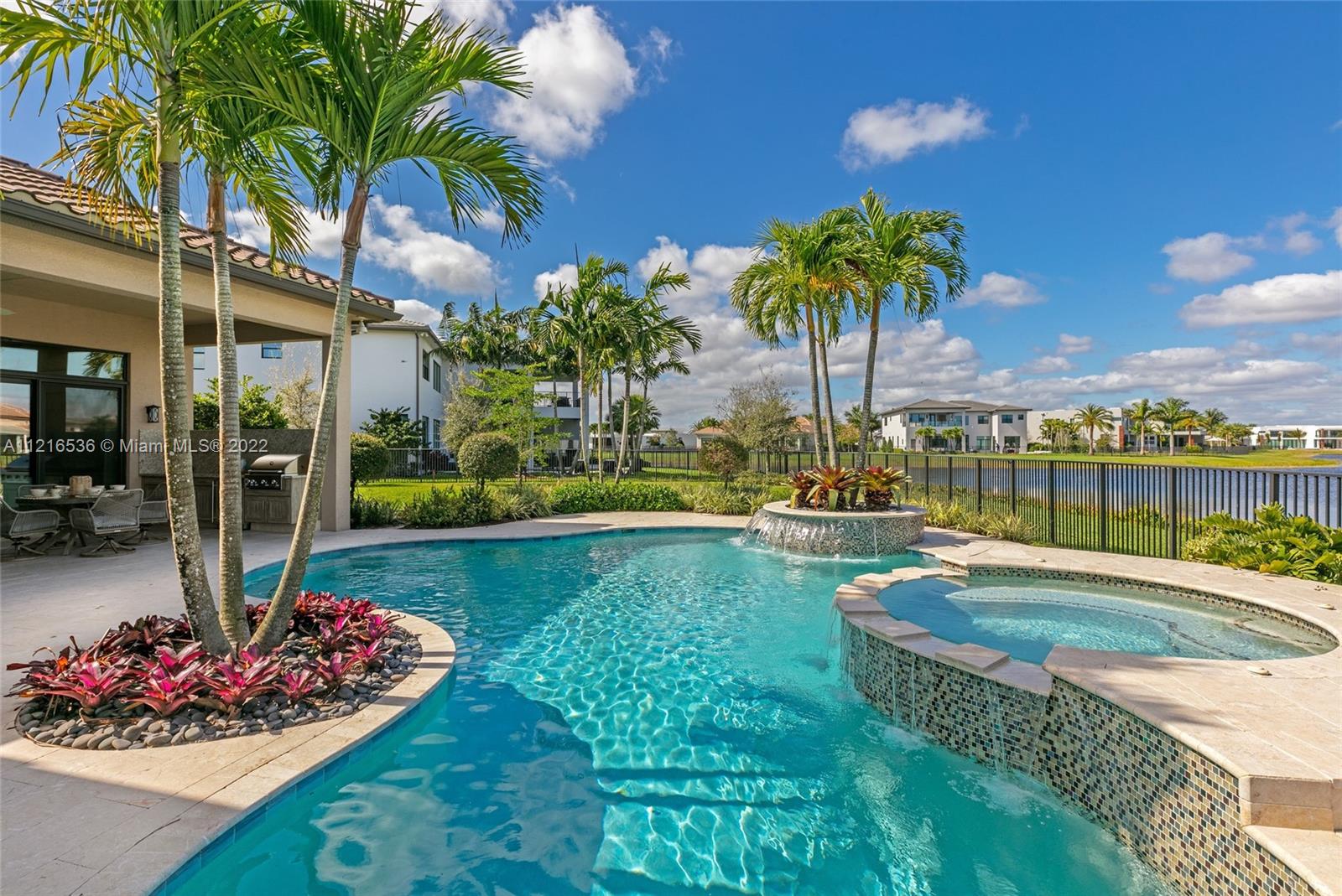 This hidden gem sits on the most desirable oversized lot at the end of the cul-de-sac with wide water views giving it the utmost privacy. An additional 2,000 Sq Ft can easily be built, increasing the living square footage to over 5,100. (Plans attached). Newly built single story model unit with over $750,000 in upgrades. Great room floor plan with 15 ft ceilings leading out to your peaceful lagoon style swimming pool designed with a waterfall spa overlooking breathtaking lake fountain views. This home features 4 bedrooms, all en suite, with walk-in closets, a den, and a gourmet kitchen. Located in the highly sought-after Boca Bridges community offering a 27,000 sq ft clubhouse complex that includes a restaurant with full service pool, bar, game room, fitness center, tennis courts, & more.