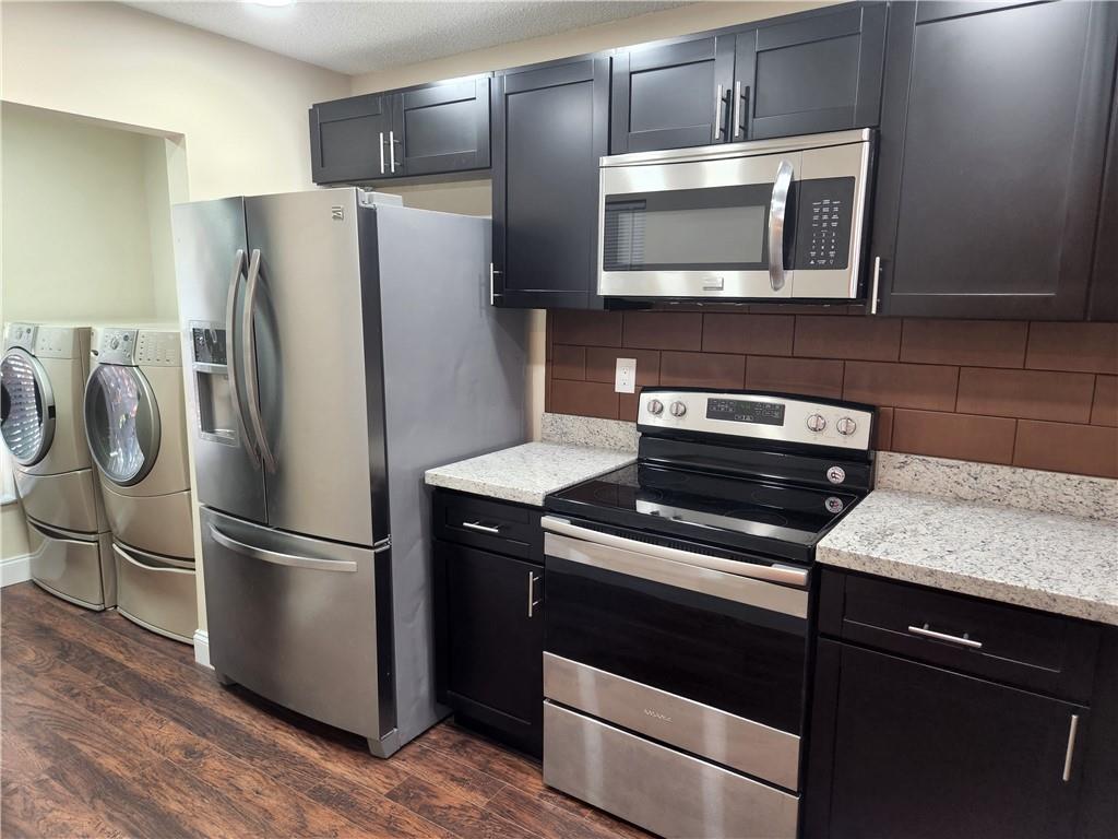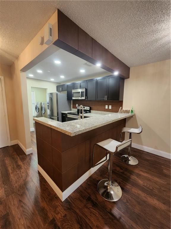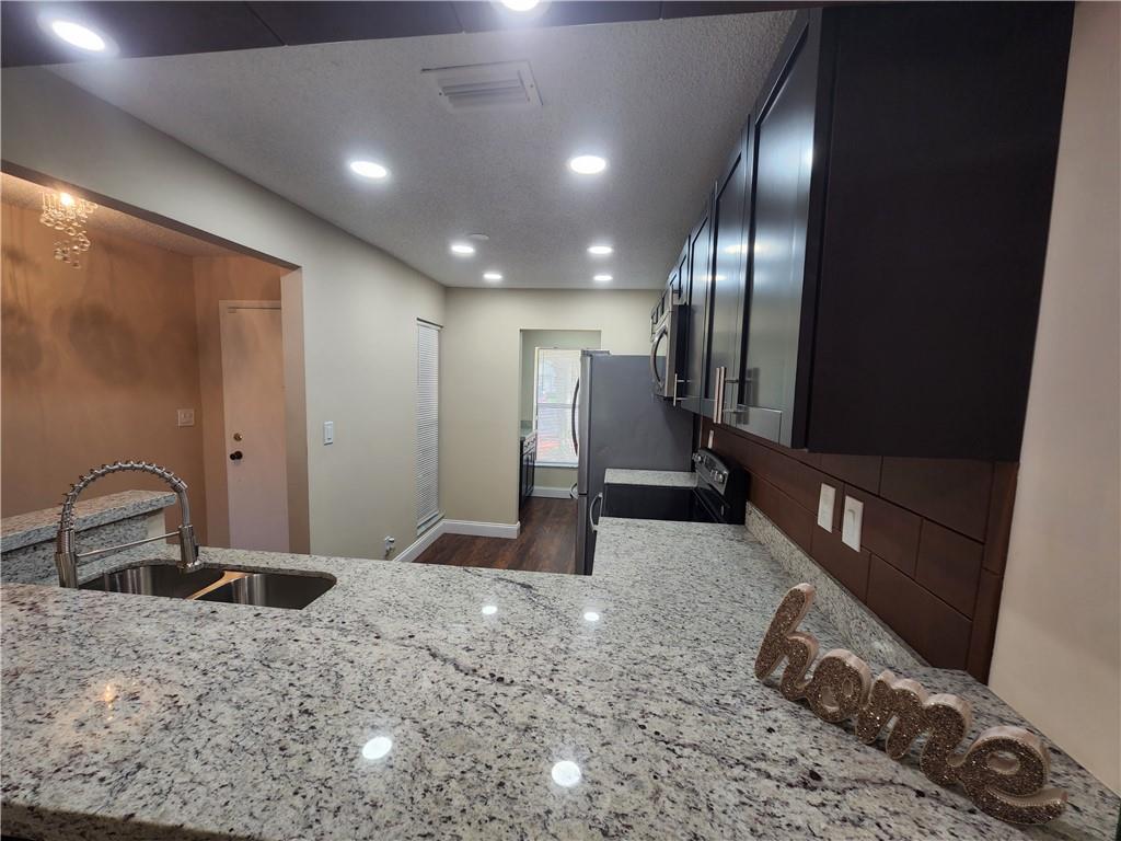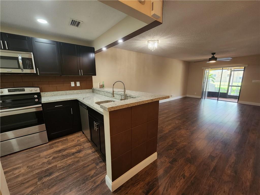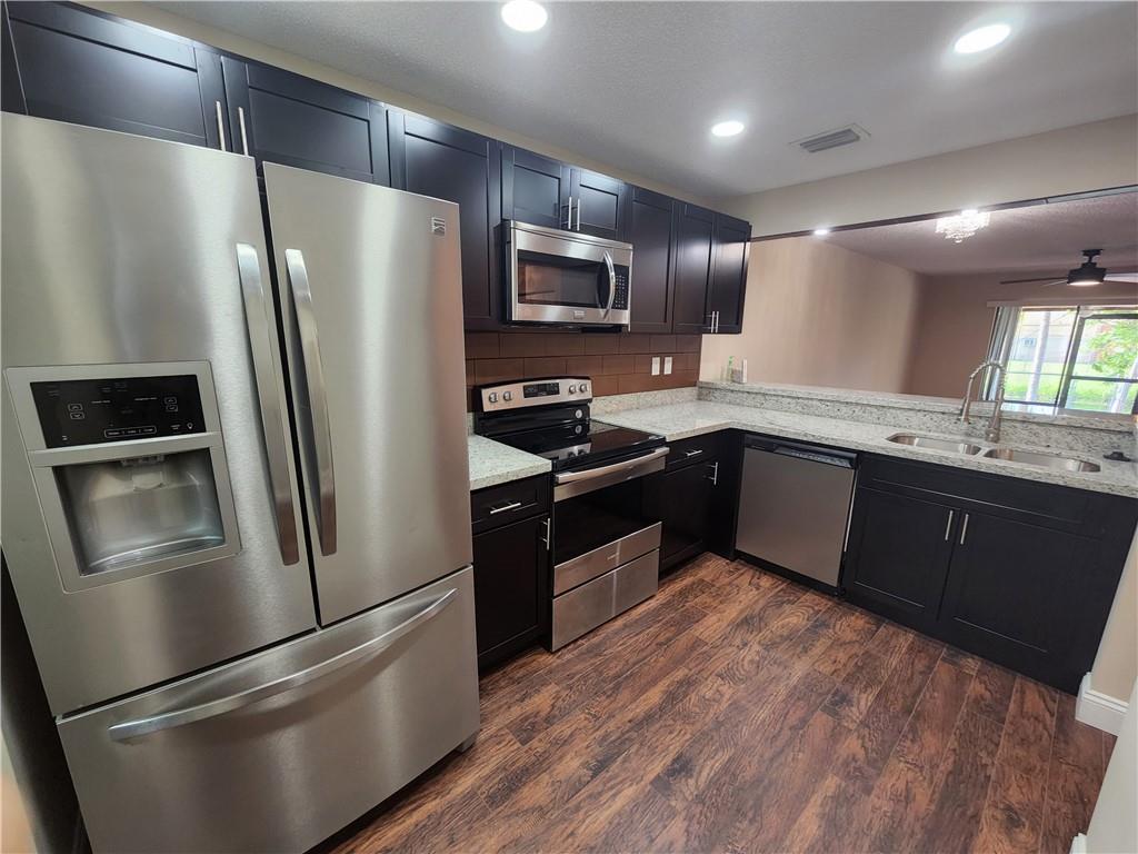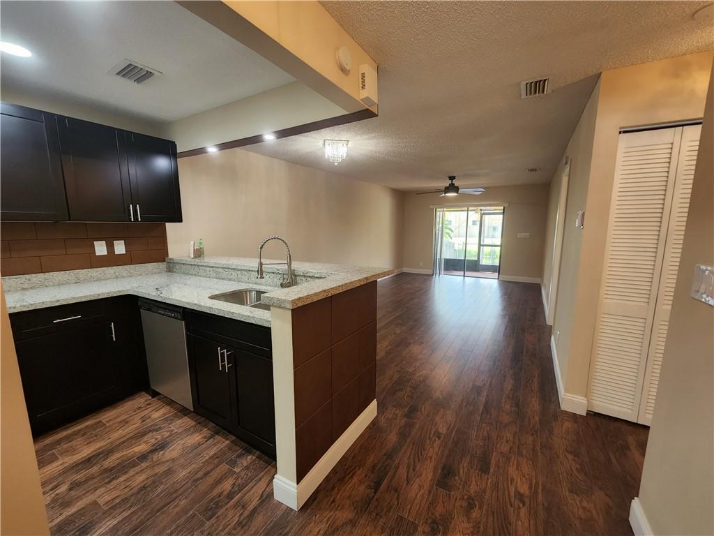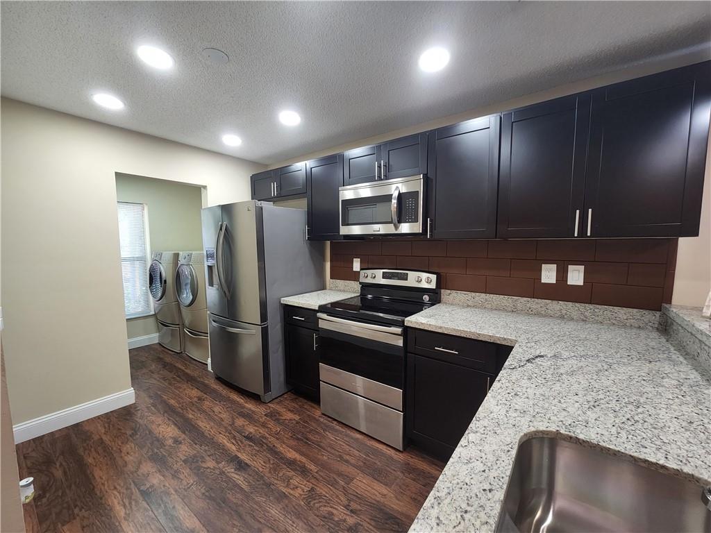 Fully remodeled Townhouse at Red Bridge Community. 2 Bedrooms with built-in closets and 2 full bathrooms. New open concept kitchen with gorgeous granite countertops, Stainless Steel appliances and kitchen peninsula covered with luxury and sophisticated leather tiles!. Laminated wood-effect flooring throughout, new light fixtures, washer and dryer located in the unit. New central A/C unit installed 2 month ago!! Fabulous lay out. Private fenced patio with screened balcony, storage and Canal view. Storage room and Hurricane shutters. Very peaceful community with a great pool area! Centrally located to all major highways. INVESTORS: You may rent the first year. Association fee is just $160 a month and it does not require approval.