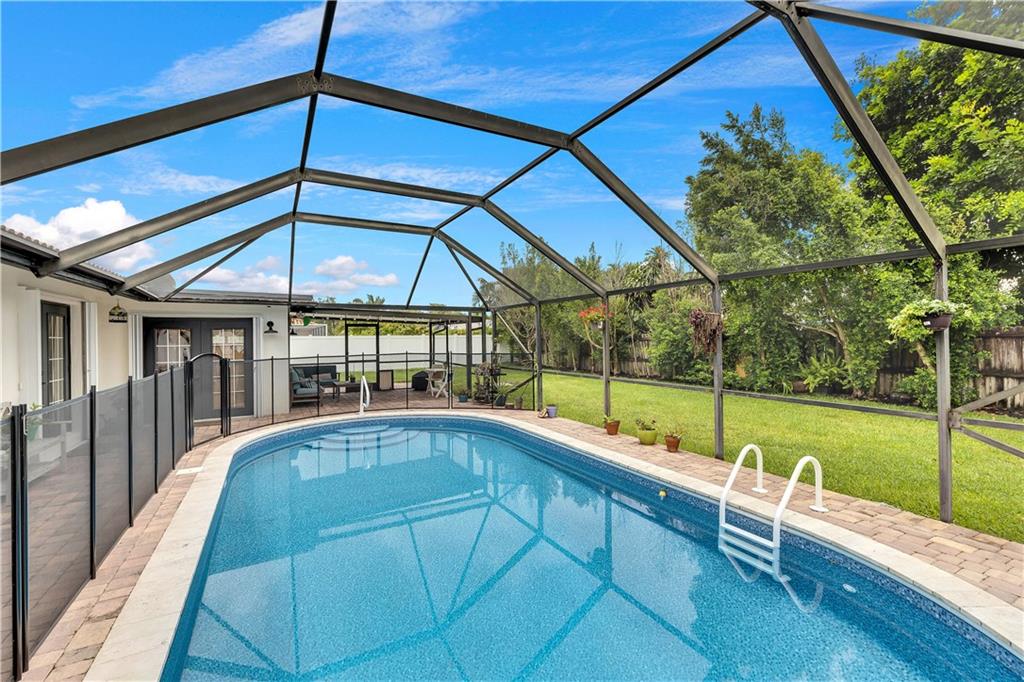 Welcome to paradise! Your new home is protected by Paradise, a high-end/high impact & efficient window/door brand for incredible safety & appearance. Carpenter built column wraps & matching cedar flower boxes further accentuate the curb appeal. And custom pavers for the driveway, porch, patio, & pool makes this home truly pop! Inside, cherry hardwood floors are throughout complementing the reimagined open galley kitchen w/matching utility rm & pantry! The kitchen has tons of counter space, a double oven & the cabinets have pullouts to stay organized. Admire your travertine lined pool & LARGE PVC fenced yard from your covered/screened patio. The kids/dog will love the yard w/a dog door access from the patio. If that's not enough there is a permitted XL shed & California style closets.