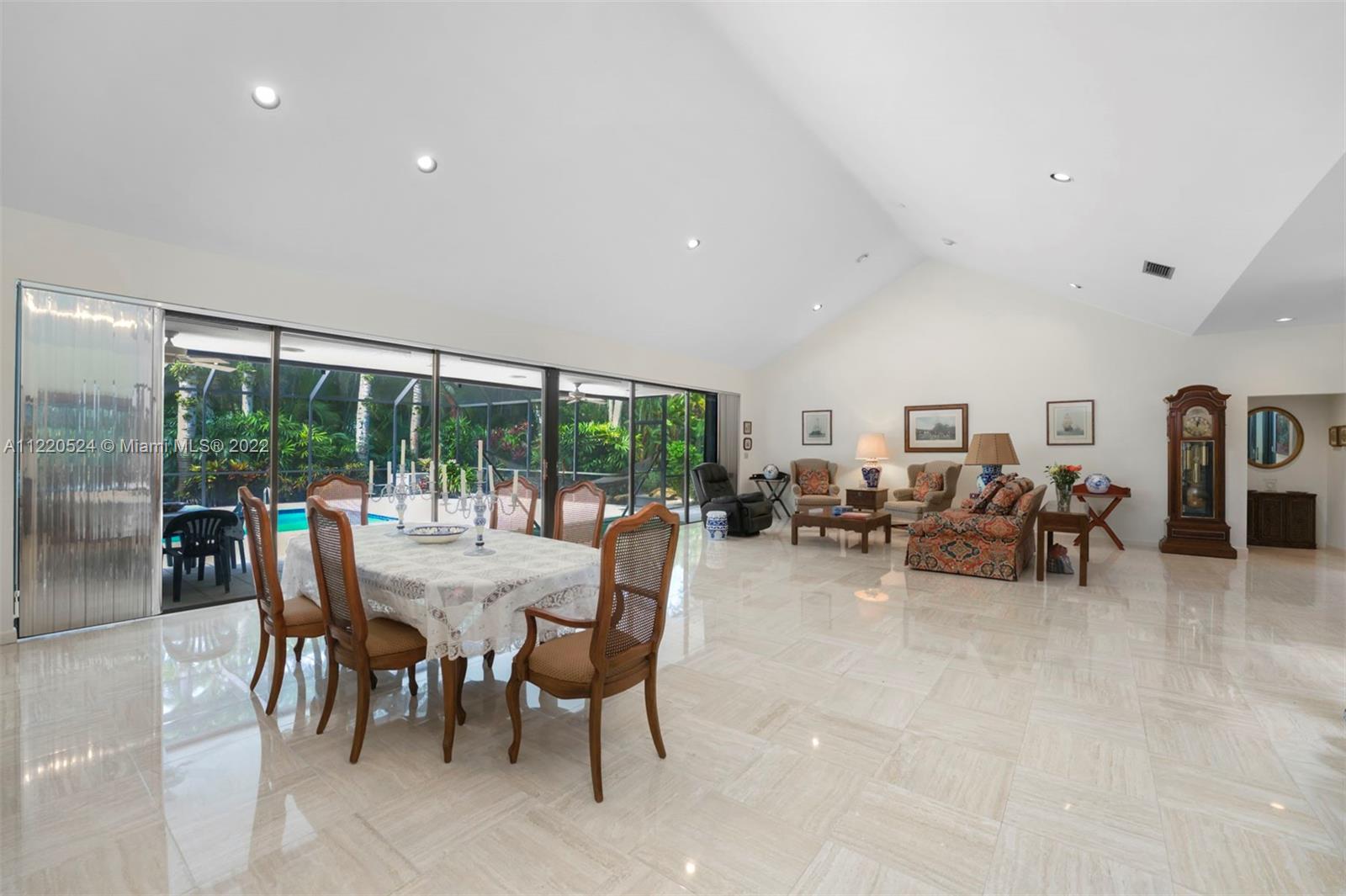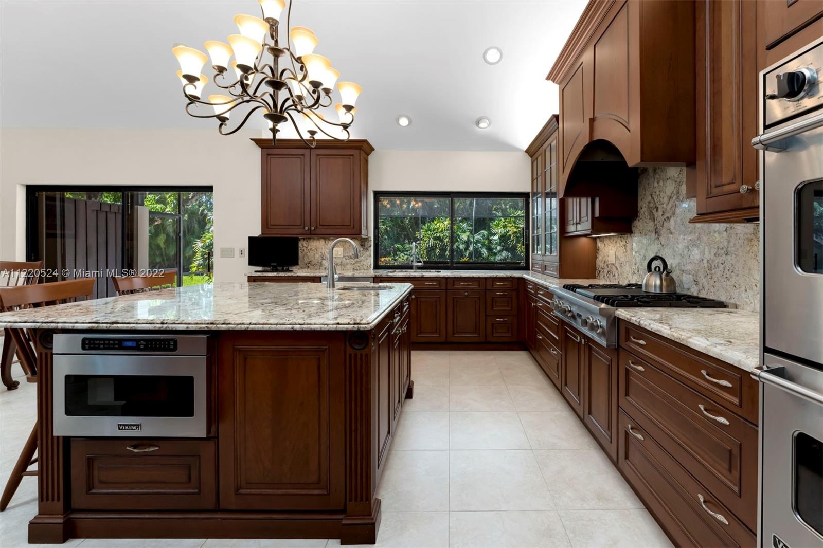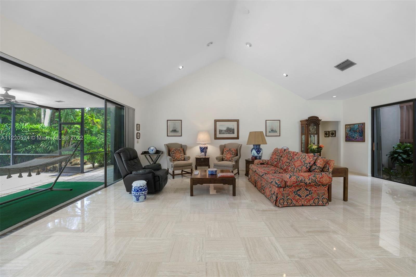 Beautiful 6,235 Total Sq. Ft. home with 5 bedrooms and 4 baths, surrounded by mature palm trees and leafy hedges offering privacy and serenity on a one-acre lot in the gated community of Pinecrest Grove. The living and dining areas harmoniously blend high ceilings, walls of windows and travertine marble floors, and the kitchen has cherry-wood cabinets, a center island, granite countertops and Viking, SubZero and Bosch appliances. An adjacent wing hosts two of the bedrooms, a family room and wet bar. The main suite comes with a fireplace and a recently renovated bath with a modern bathtub, separate indoor, in-ground spa, onyx marble countertops and skylights. Includes a library, pool, summer kitchen, spacious screened-in patio, and tennis court. Close to schools, shops and restaurants.